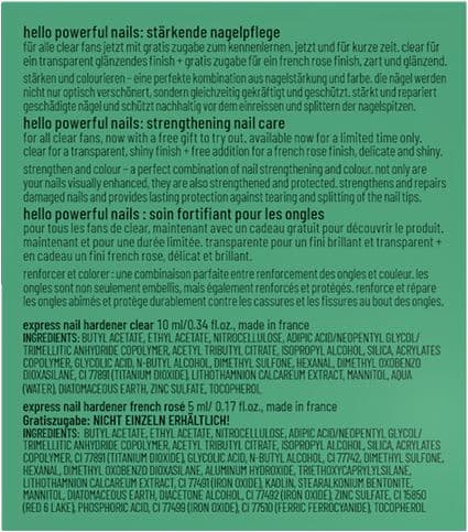Inhaltsstoffeexpress nail hardener clear: BUTYL ACETATE, ETHYL ACETATE, NITROCELLULOSE, ADIPIC ACID/NEOPENTYL GLYCOL/ TRIMELLITIC ANHYDRIDE COPOLYMER, ACETYL TRIBUTYL CITRATE, ISOPROPYL ALCOHOL, SILICA, ACRYLATES COPOLYMER, GLYCOLIC ACID, N-BUTYL ALCOHOL, DIMETHYL SULFONE, HEXANAL, DIMETHYL OXOBENZO DIOXASILANE, CI 77891 (TITANIUM DIOXIDE), LITHOTHAMNION CALCAREUM EXTRACT, MANNITOL, AQUA (WATER), DIATOMACEOUS EARTH, ZINC SULFATE, TOCOPHEROL express nail hardener french rosé: BUTYL ACETATE, ETHYL ACETATE, NITROCELLULOSE, ADIPIC ACID/NEOPENTYL GLYCOL/ TRIMELLITIC ANHYDRIDE COPOLYMER, ACETYL TRIBUTYL CITRATE, ISOPROPYL ALCOHOL, SILICA, ACRYLATES COPOLYMER, CI 77891 (TITANIUM DIOXIDE), GLYCOLIC ACID, N-BUTYL ALCOHOL, CI 77742, DIMETHYL SULFONE, HEXANAL, DIMETHYL OXOBENZO DIOXASILANE, ALUMINUM HYDROXIDE, TRIETHOXYCAPRYLYLSILANE, LITHOTHAMNION CALCAREUM EXTRACT, CI 77491 (IRON OXIDE), KAOLIN, STEARALKONIUM BENTONITE, MANNITOL, DIATOMACEOUS EARTH, DIACETONE ALCOHOL, CI 77492 (IRON OXIDE), ZINC SULFATE, CI 15850 (RED 6 LAKE), PHOSPHORIC ACID, CI 77499 (IRON OXIDE), CI 77510 (FERRIC FERROCYANIDE), TOCOPHEROL