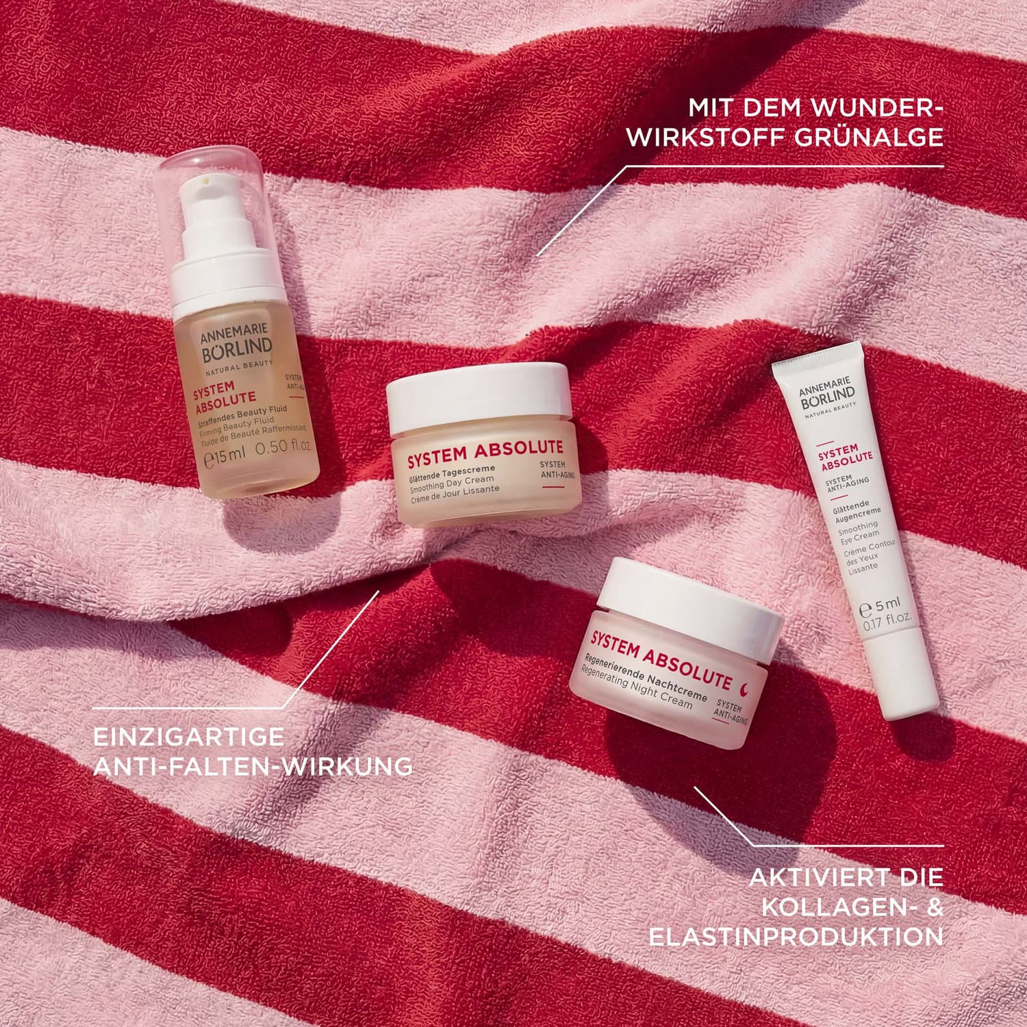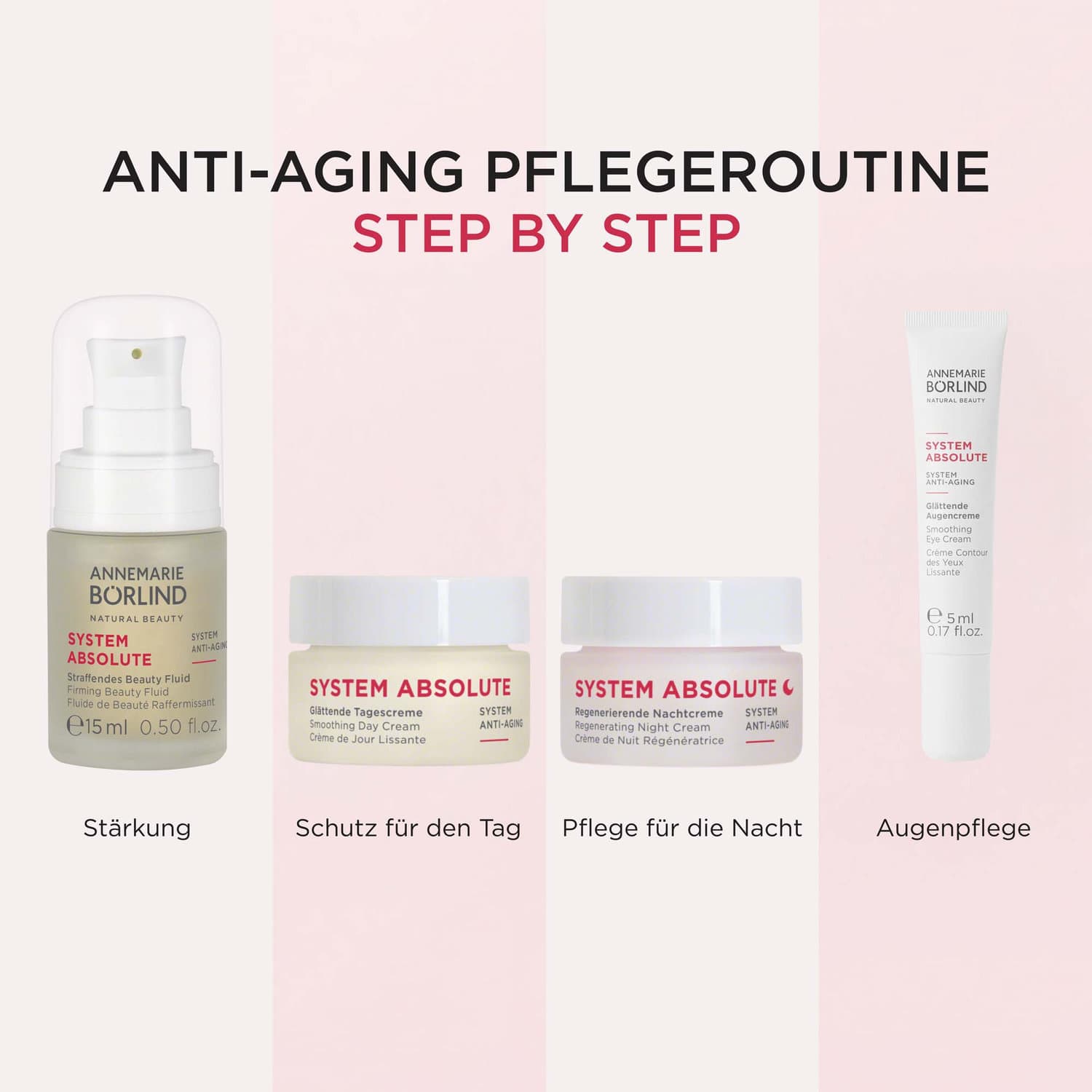 Vier ANTI-AGING Minis aus unserer SYSTEM ABSOLUTE Pflegeserie – perfekt aufeinander abgestimmt und ideal für unterwegs. Der Powerwirkstoff: