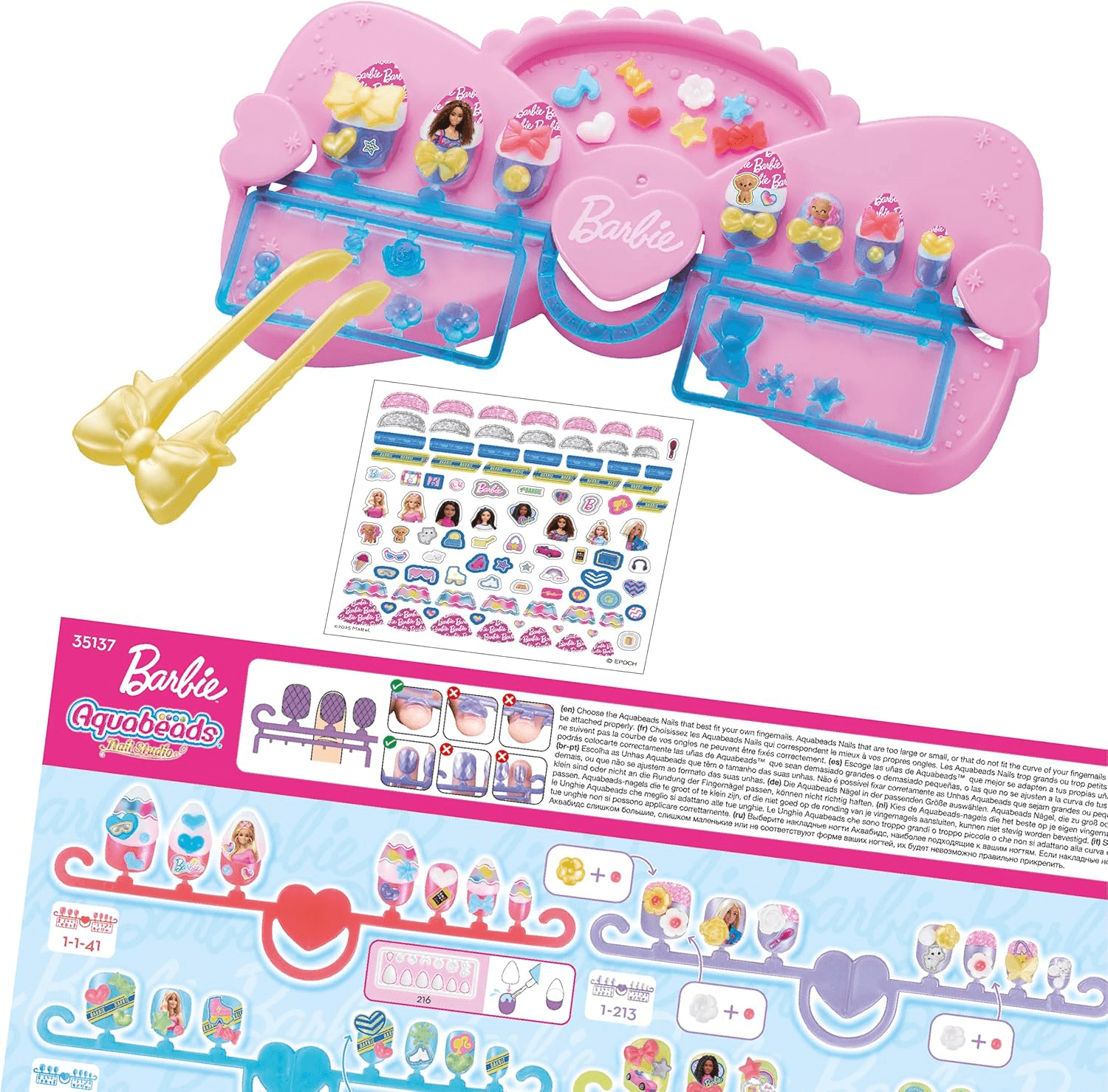 Stylische Barbie-Nagelkreationen zum Selbstgestalten! Mit dem Aquabeads Barbie Nagelstudio designen Kinder ab 4 Jahren einzigartige Fingernägel im angesagten Barbie-Style! Die neuen Neon-Nails bringen leuchtende Farben auf die Fingerspitzen – ganz ohne Kleber! So funktioniert’s: Einfach die Nagelvorlagen mit dem Wasserapplikator bestreichen und nach Belieben dekorieren. Nach nur 3 Minuten Trockenzeit lassen sich die Nägel lösen und mit Wasser an den eigenen Fingernägeln befestigen. Sie können sanft entfernt und mehrfach wiederverwendet werden. Das Set enthält alles für den perfekten Beautyspaß: 40 Fingernägel in 8 Farben, Basteltisch, Pinzette, Wasserapplikator mit Pinsel, Sticker und Designvorlagen. Perfekt für kreative Barbie-Fans, die ihre Nägel immer wieder neu gestalten möchten!