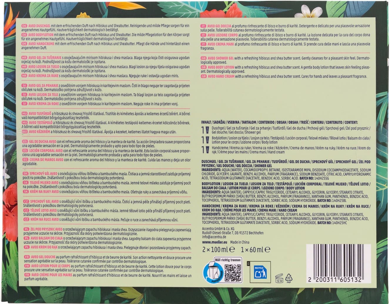 | Inhaltsstoffe | Shower gel / Duschgel: Aqua (Water), Cocamidopropyl Betaine, Isostearamide MIPA, Disodium Cocoamphodiacetate, Sodium Chloride, Glyceryl Laurate, Benzyl Alcohol, Parfum (Fragrance), Sodium Benzoate, Citric Acid, Caprylhydroxamic Acid, Tetrasodium Glutamate Diacetate, Benzoic Acid, Sorbic Acid Body Lotion / Körperlotion: Aqua (Water), Caprylic/Capric Triglyceride, Cetearyl Alcohol, Glycerin, Glyceryl Stearate Citrate, Butyrospermum Parkii (Shea) Butter, Benzyl Alcohol, Parfum (Fragrance), Xanthan Gum, Panthenol, Benzoic Acid, Tocopherol, Tetrasodium Glutamate Diacetate, Sorbic Acid, Sodium Hydroxide Hand & Nail Cream / Hand- & Nagelcreme: Aqua (Water), Caprylic/Capric Triglyceride, Cetearyl Alcohol, Glycerin, Glyceryl Stearate Citrate, Butyrospermum Parkii (Shea) Butter, Benzyl Alcohol, Parfum (Fragrance), Xanthan Gum, Panthenol, Benzoic Acid, Tocopherol, Tetrasodium Glutamate Diacetate, Sorbic Acid, Sodium Hydroxide |