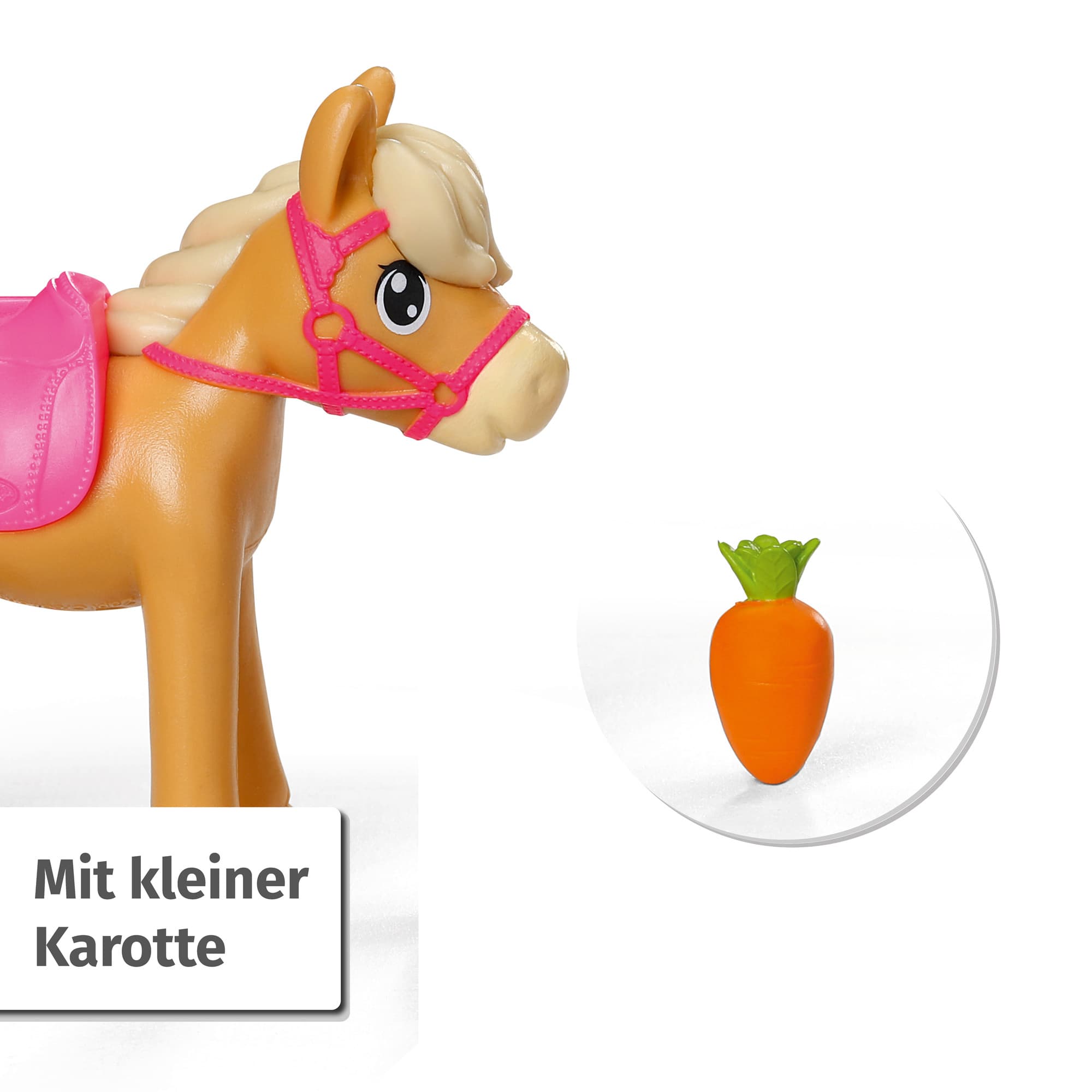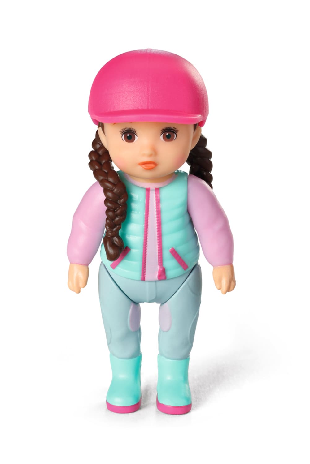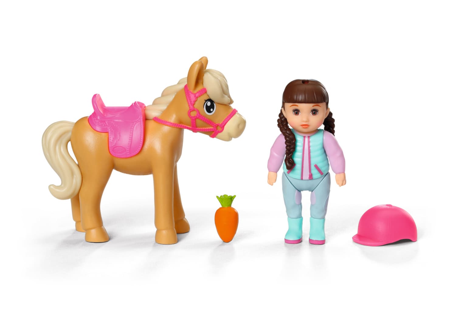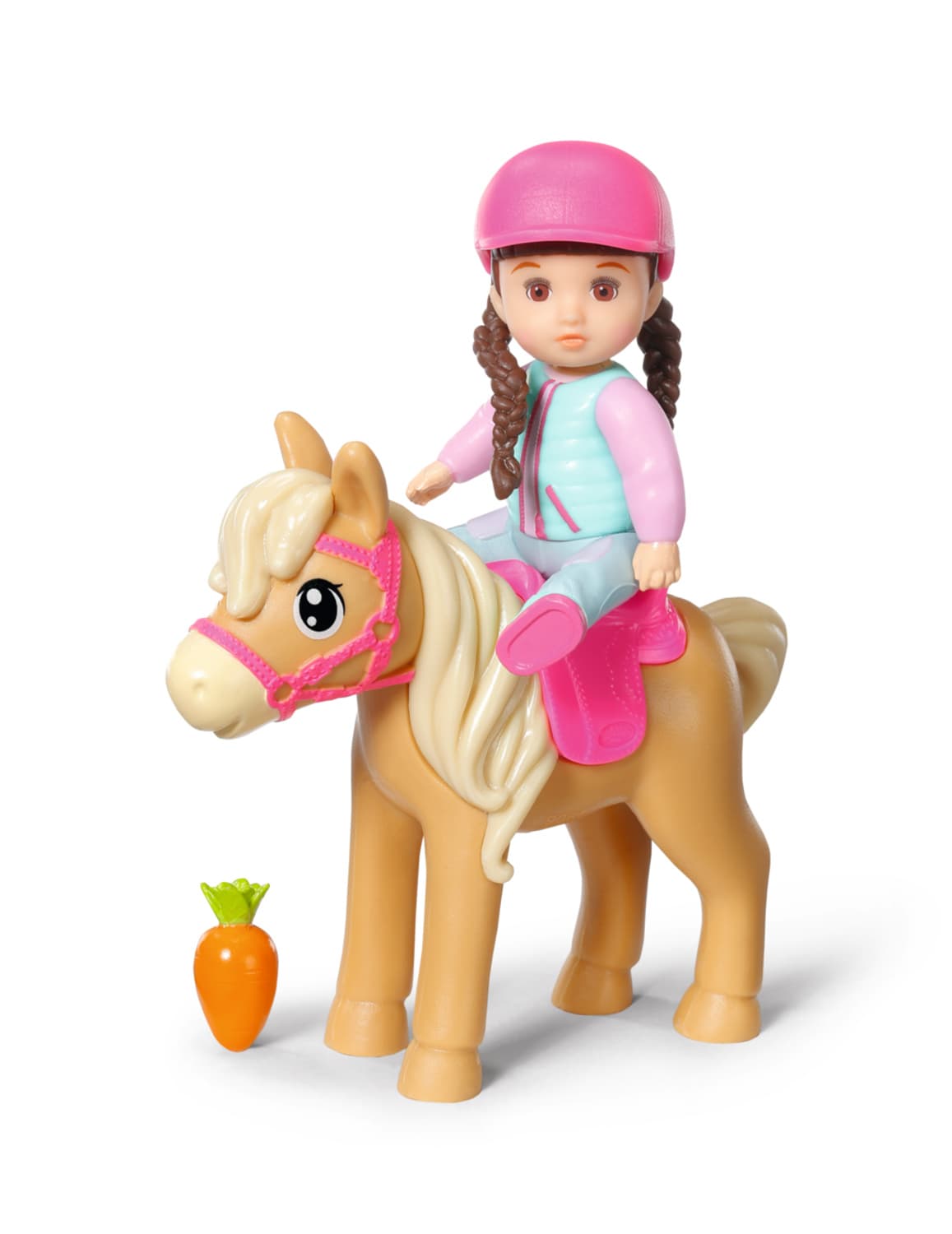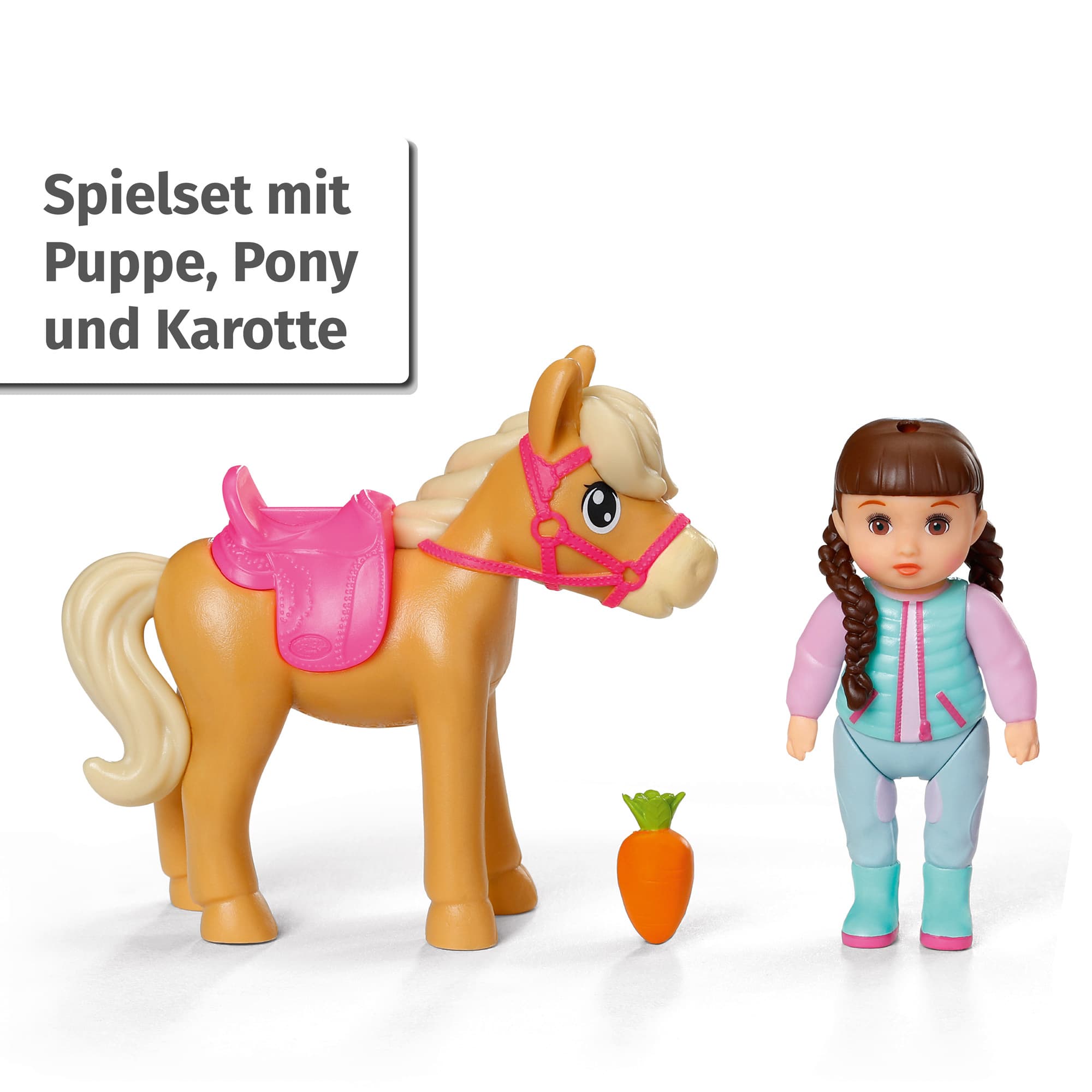 Die niedliche BABY born Mini-Puppe Kim ist bereit für einen Ausritt in ihrem schicken Reiteroutfit und dem passenden pinken Helm. Doch ihr Pferd hat heute einfach keine Lust mitzukommen. Aber Kim hat einen Trick auf Lager - sie lockt das Pony einfach mit einer leckeren Möhre aus dem Stall und galoppiert los zu neuen Abenteuern!• 7 cm BABY born Minis Puppe Kim• BABY born Minis Pferd + Karotte