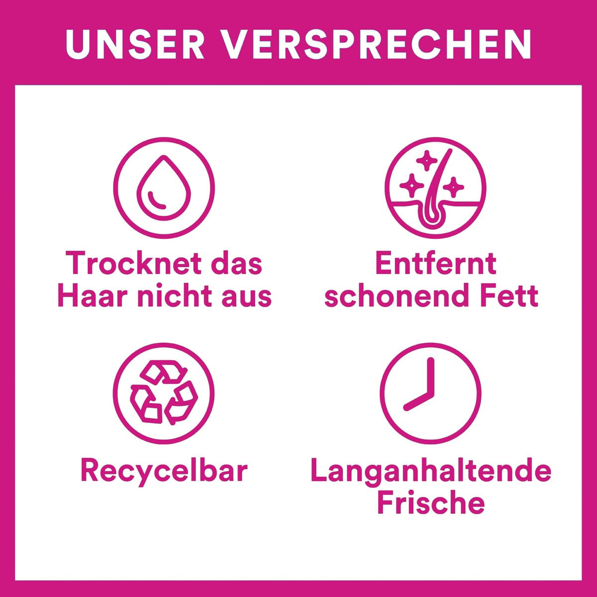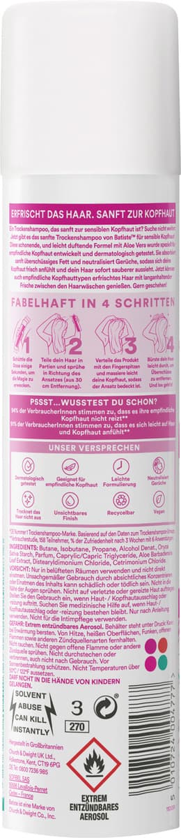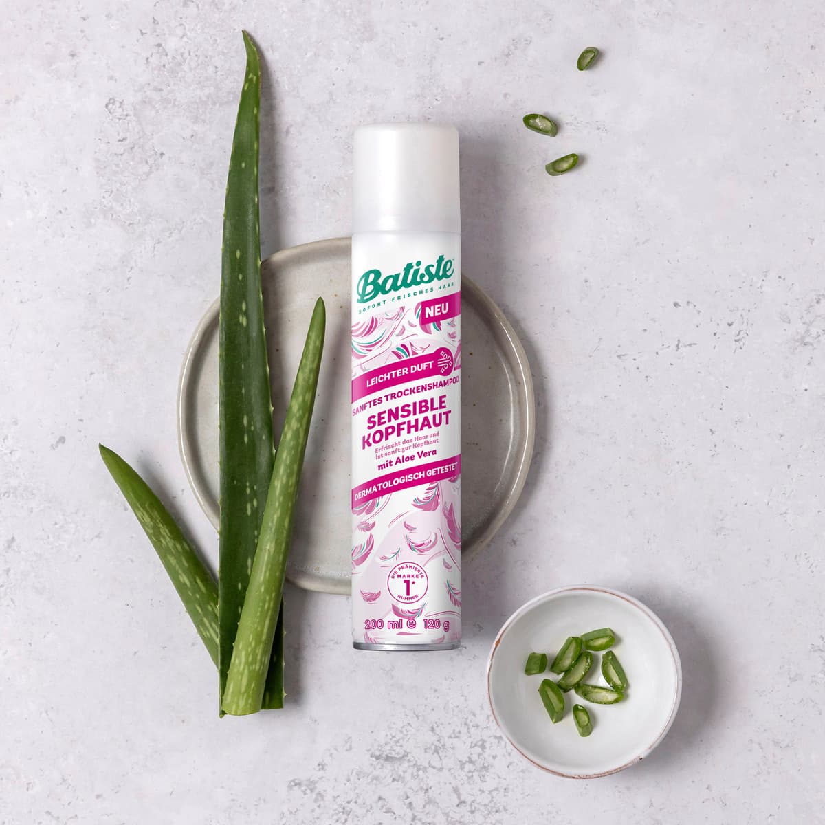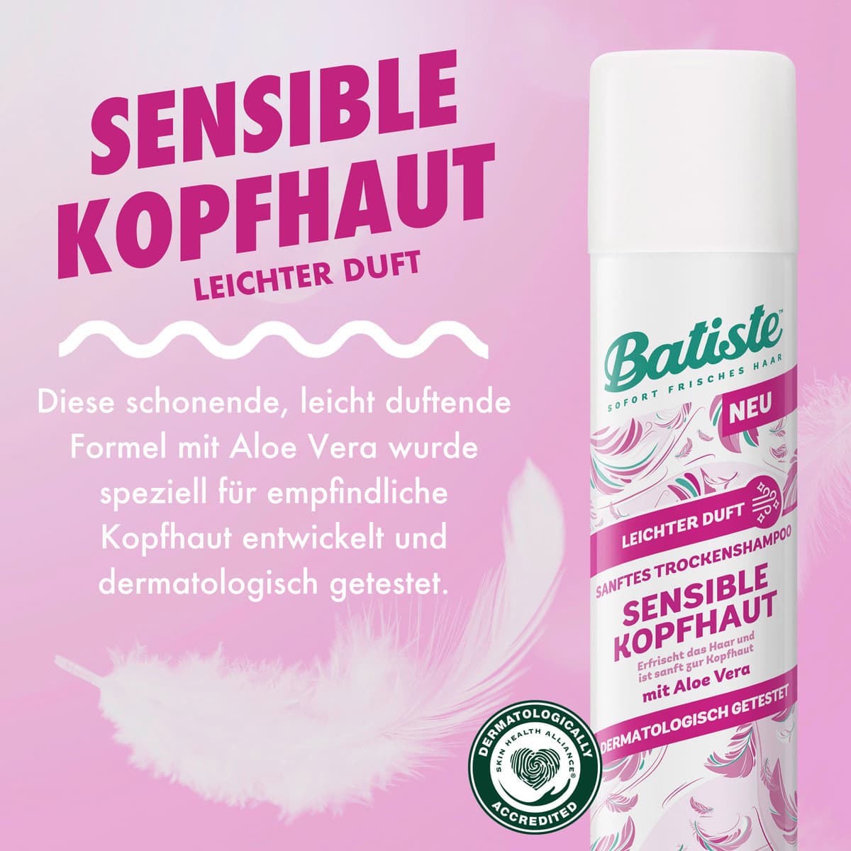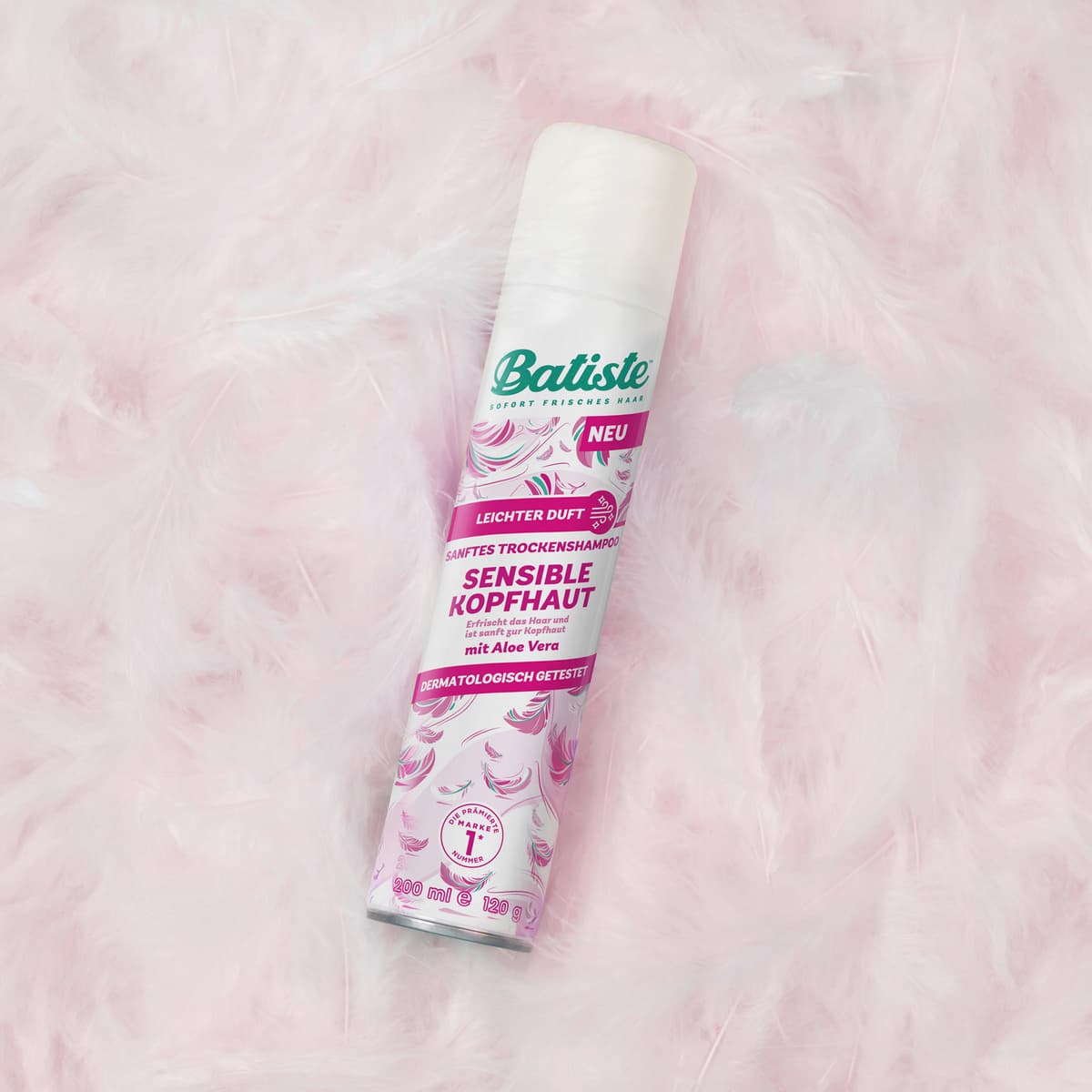 ERFRISCHT DAS HAAR. SANFT ZUR KOPFHAUT. Ein Trockenshampoo, das sanft zur sensiblen Kopfhaut ist? Suche nicht weiter: Jetzt gibt es das sanfte Trockenshampoo von Batiste für sensible Kopfhaut! Diese schonende, und leicht duftende Formel mit Aloe Vera wurde speziell für empfindliche Kopfhaut entwickelt und dermatologisch getestet. Sie absorbiert sanft überschüssiges Fett, sodass sich deine Kopfhaut frisch anfühlt und dein Haar sofort sauberer aussieht. Jetzt können auch empfindliche Kopfhauttypen erfrischtes Haar mit langanhaltender Frische zwischen den Haarwäschen genießen. Gern geschehen!