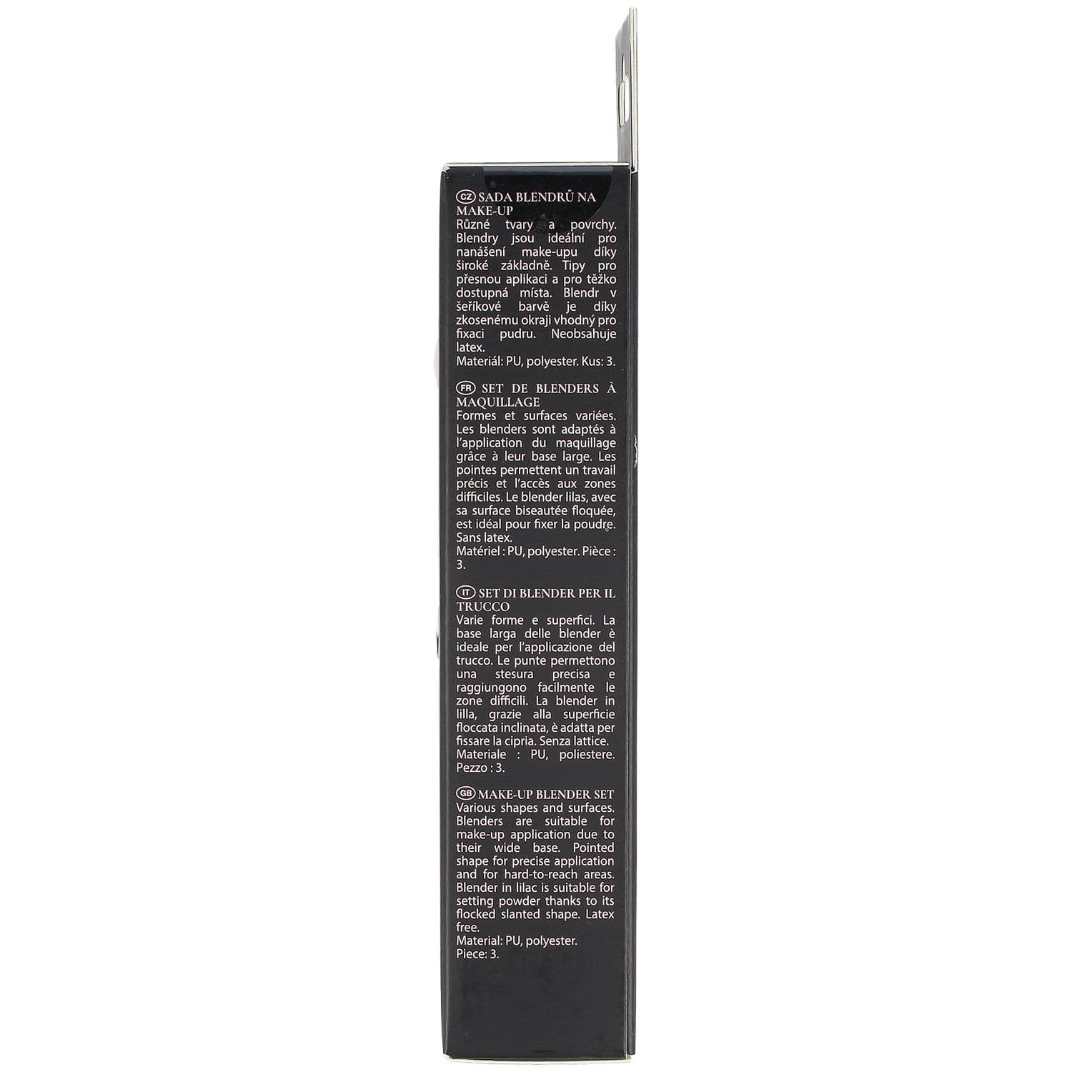 Das Make-up-Blender-Set vereint verschiedene Formen und Oberflächen für ein präzises Verblenden von Puder- und Make-up-Produkten. Alle Blender eignen sich durch ihren breiten Boden ideal für den großflächigen Make-up-Auftrag. Die Spitzen sind ideal für das präzise Einarbeiten von Produkten und für schwer erreichbare Gesichtspartien. Der Blender in Flieder eignet sich durch seine beflockte Schräge auch zum Setten von Puder. Latexfrei.