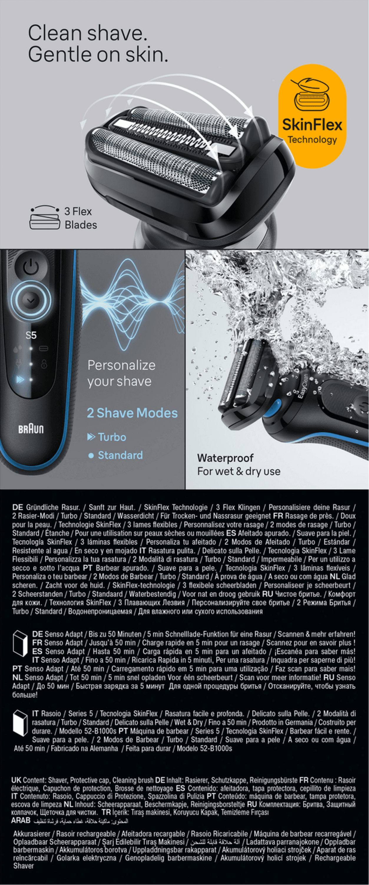 Der Braun Series 5 Elektrorasierer bietet eine einfache und schnelle Rasur. Die 3 flexiblen Klingen passen sich bequem den Konturen deines Gesichts an. Die 2 Rasiermodi (Turbo-Modus und Standard-Modus) ermöglichen es, die Rasur nach deinen Bedürfnissen zu personalisieren. Der Li-Ion-Akku bietet eine kabellose Laufzeit von bis zu 50 Minuten und eine 5-minütige Schnellladung. Der Series 5 Elektrorasierer für Männer ist 100% wasserdicht. Hergestellt in Deutschland.