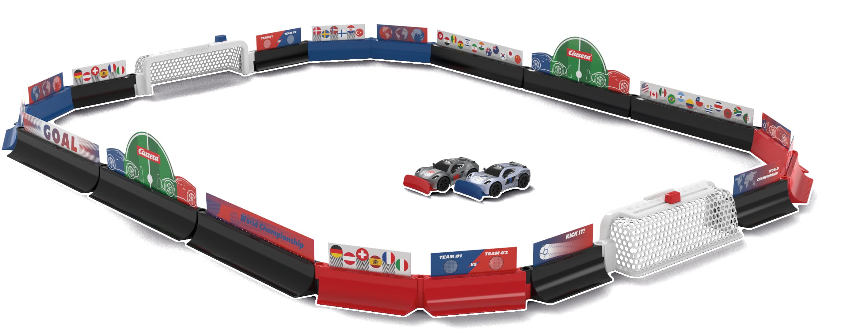 Mit dem Carrera RC Soccer Set – World Championship, wird das Wohnzimmer zur WM-Arena. Auf dem rund 9 0 × 70 cm großen Spielfeld liefern sich zwei Fahrzeuge packende Duelle, während die montierten Anfänger- oder Profi-Schaufeln den Ball ins Tor bugsieren. Mit 18 Bandenelementen und 48 Länderstickern können Fans ihre Lieblings-WM-Spiele austragen. Drei Geschwindigkeitsstufen und gummierte Reifen sorgen für dynamische Manöver. Ready-to-Run mit Ball, Torzählern und Deko-Elementen wird jedes Match zu m intensiven Fußball-Showdown, bei dem bis zu 16 Spieler gleichzeitig antreten können.