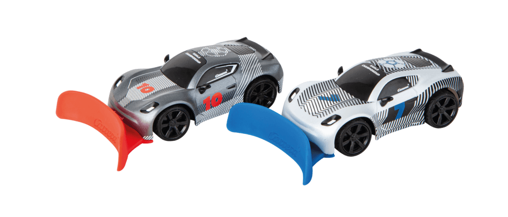 Auf dem 90 × 70 cm großen Spielfeld liefern sich zwei Fahrzeuge packende Duelle.