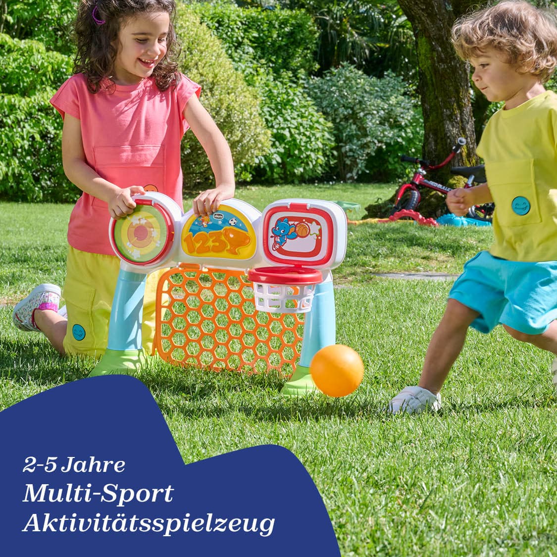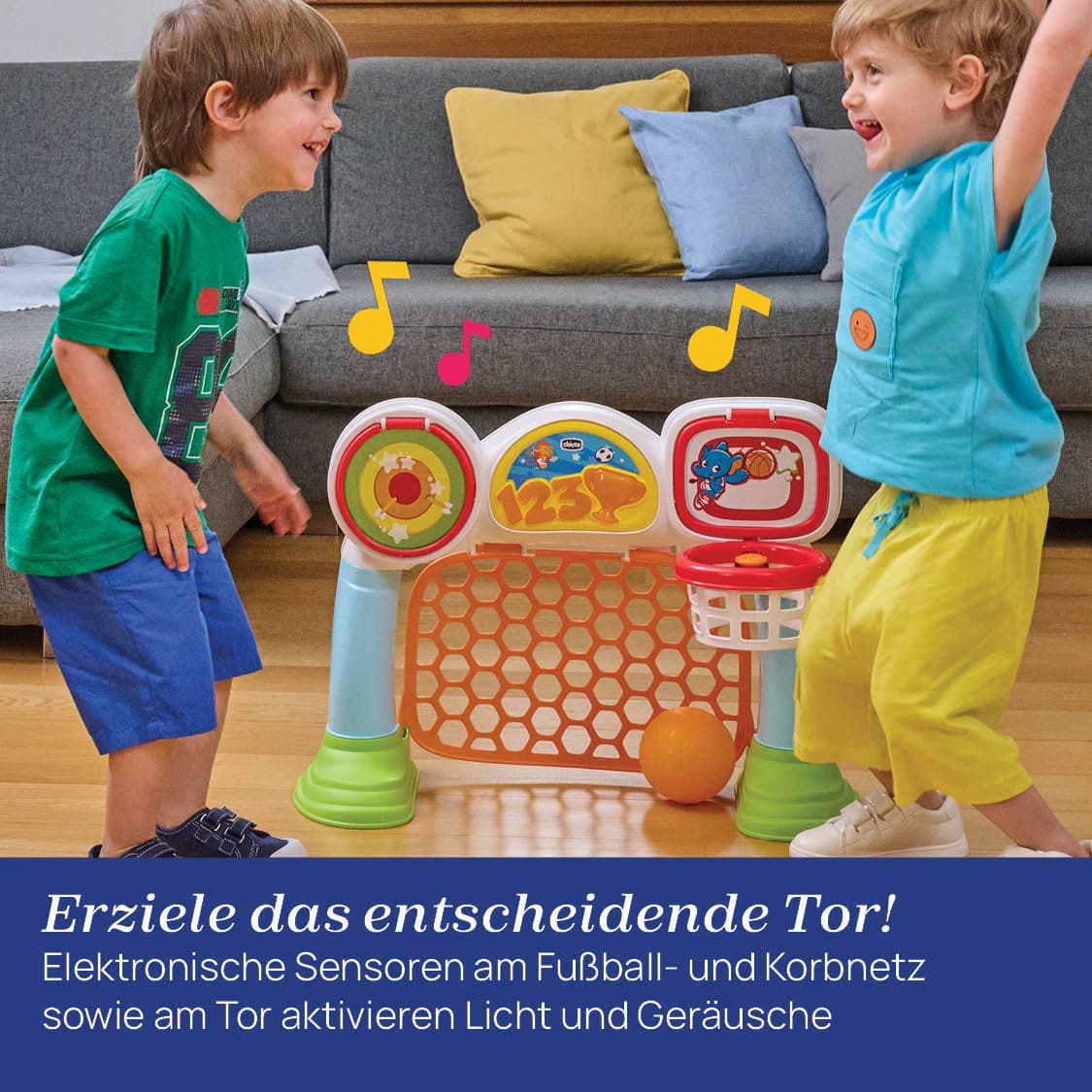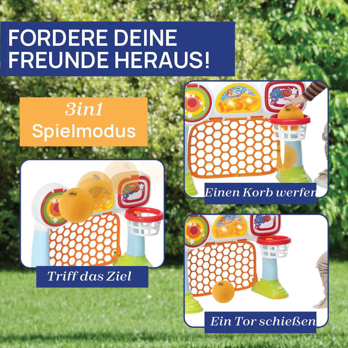Chicco Multi-Sport-Aktivitätsspiel ist ein vielseitiges 3-in-1-Spielgerät, das Fußball, Basketball und Zielschießen kombiniert. Mit seinem neuen Design, lebendigen Farben und hochwertigen Materialien bietet es eine unterhaltsame Möglichkeit, die Präzision, manuelle Koordination und motorischen Fähigkeiten Ihres Kindes zu trainieren. Ausgestattet mit Lichtern und Geräuschen, reagiert das Spielzeug auf den Ballpass durch drei Sensoren und passt sich automatisch dem entsprechenden Spielmodus an. Ob drinnen oder draußen, dieses Spielzeug bietet endlose Stunden Spaß und fördert die körperliche Aktivität sowie die Entwicklung Ihres Kindes.
