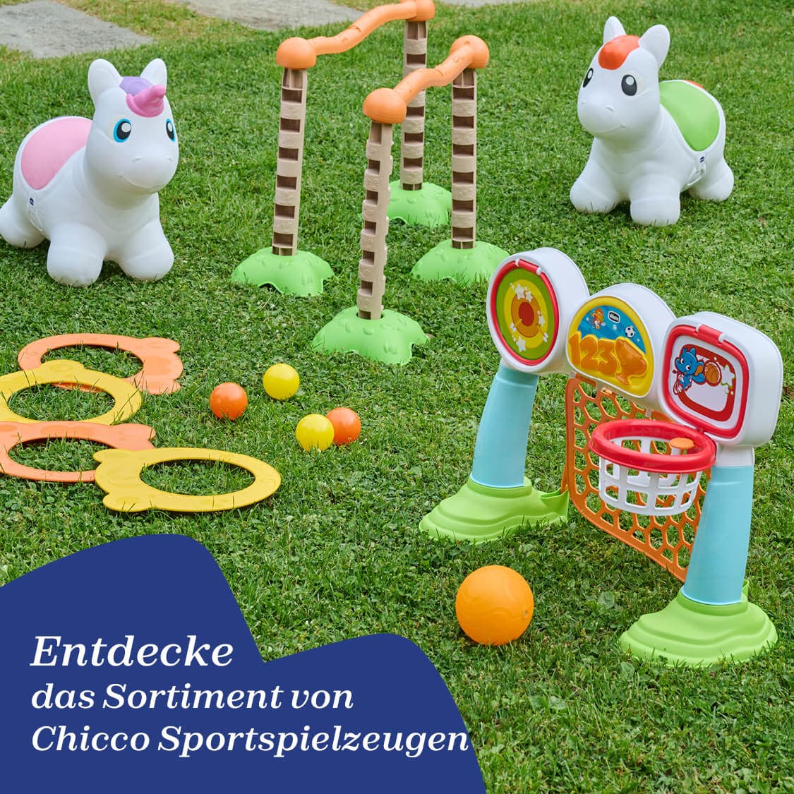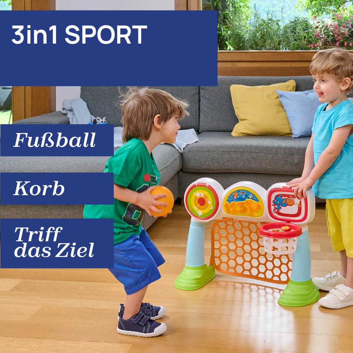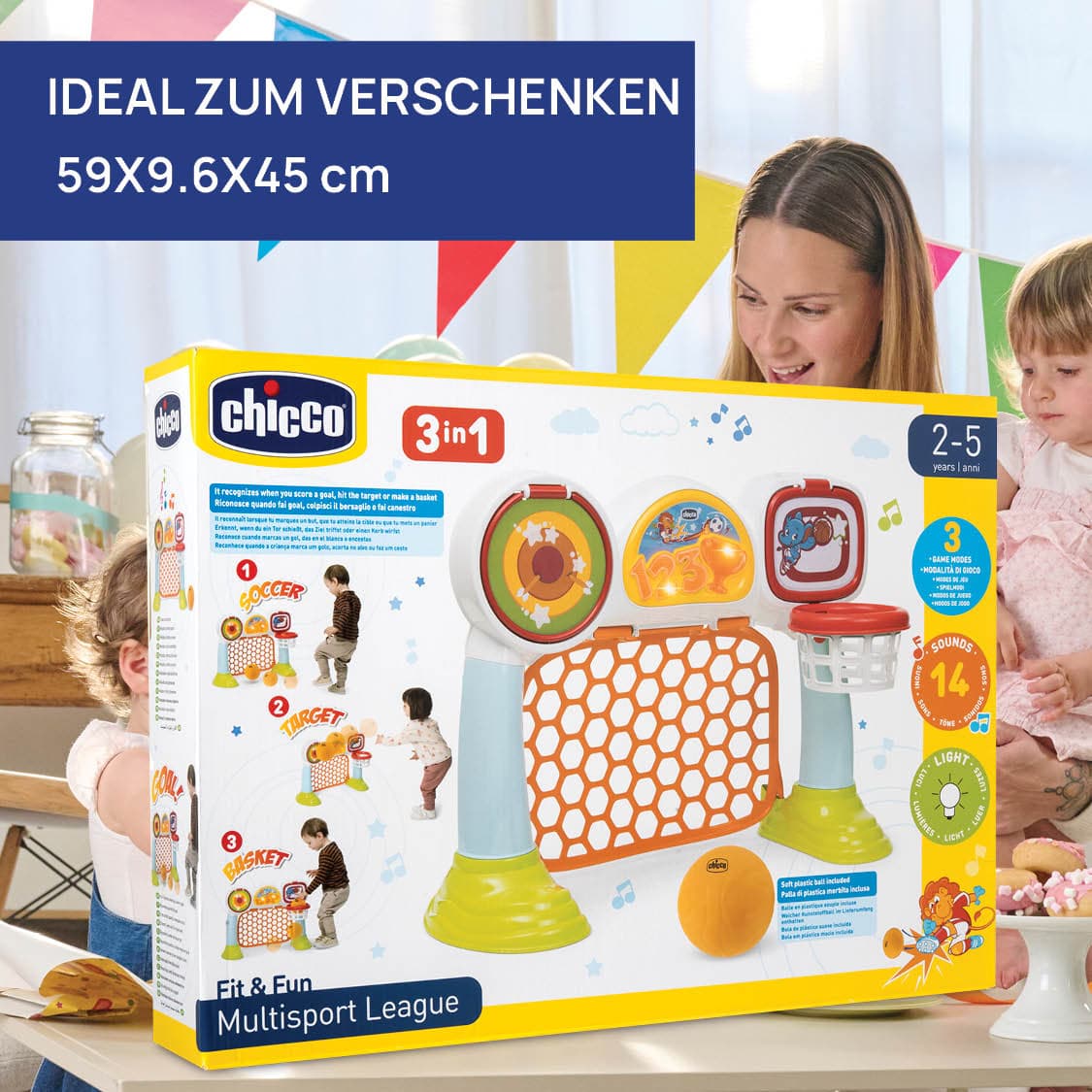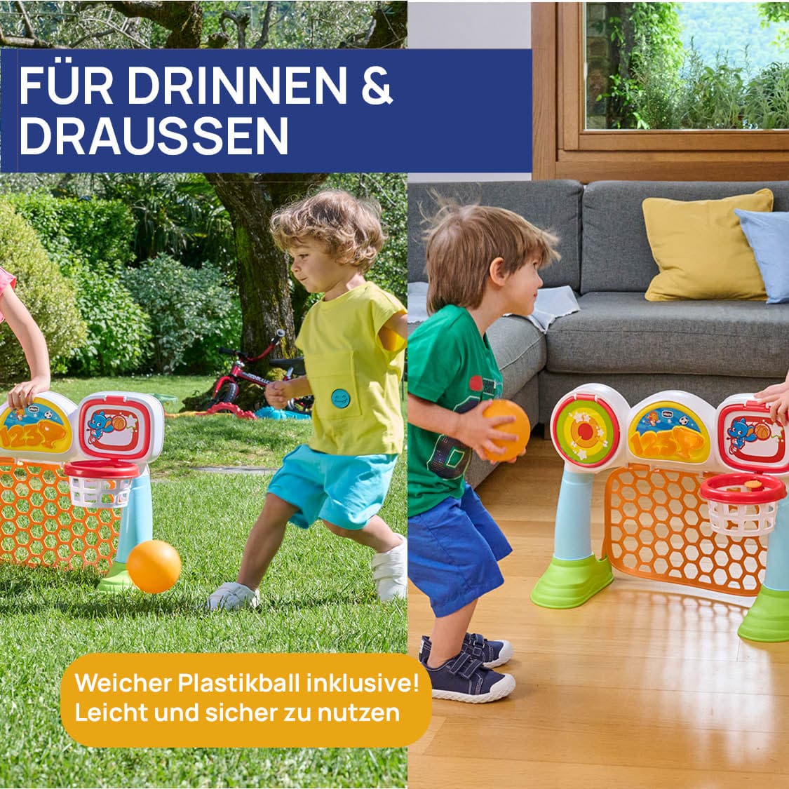 Chicco Multi-Sport-Aktivitätsspiel ist ein vielseitiges 3-in-1-Spielgerät, das Fußball, Basketball und Zielschießen kombiniert. Mit seinem neuen Design, lebendigen Farben und hochwertigen Materialien bietet es eine unterhaltsame Möglichkeit, die Präzision, manuelle Koordination und motorischen Fähigkeiten Ihres Kindes zu trainieren. Ausgestattet mit Lichtern und Geräuschen, reagiert das Spielzeug auf den Ballpass durch drei Sensoren und passt sich automatisch dem entsprechenden Spielmodus an. Ob drinnen oder draußen, dieses Spielzeug bietet endlose Stunden Spaß und fördert die körperliche Aktivität sowie die Entwicklung Ihres Kindes.