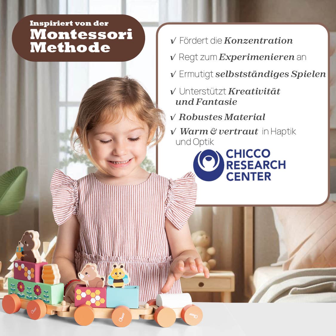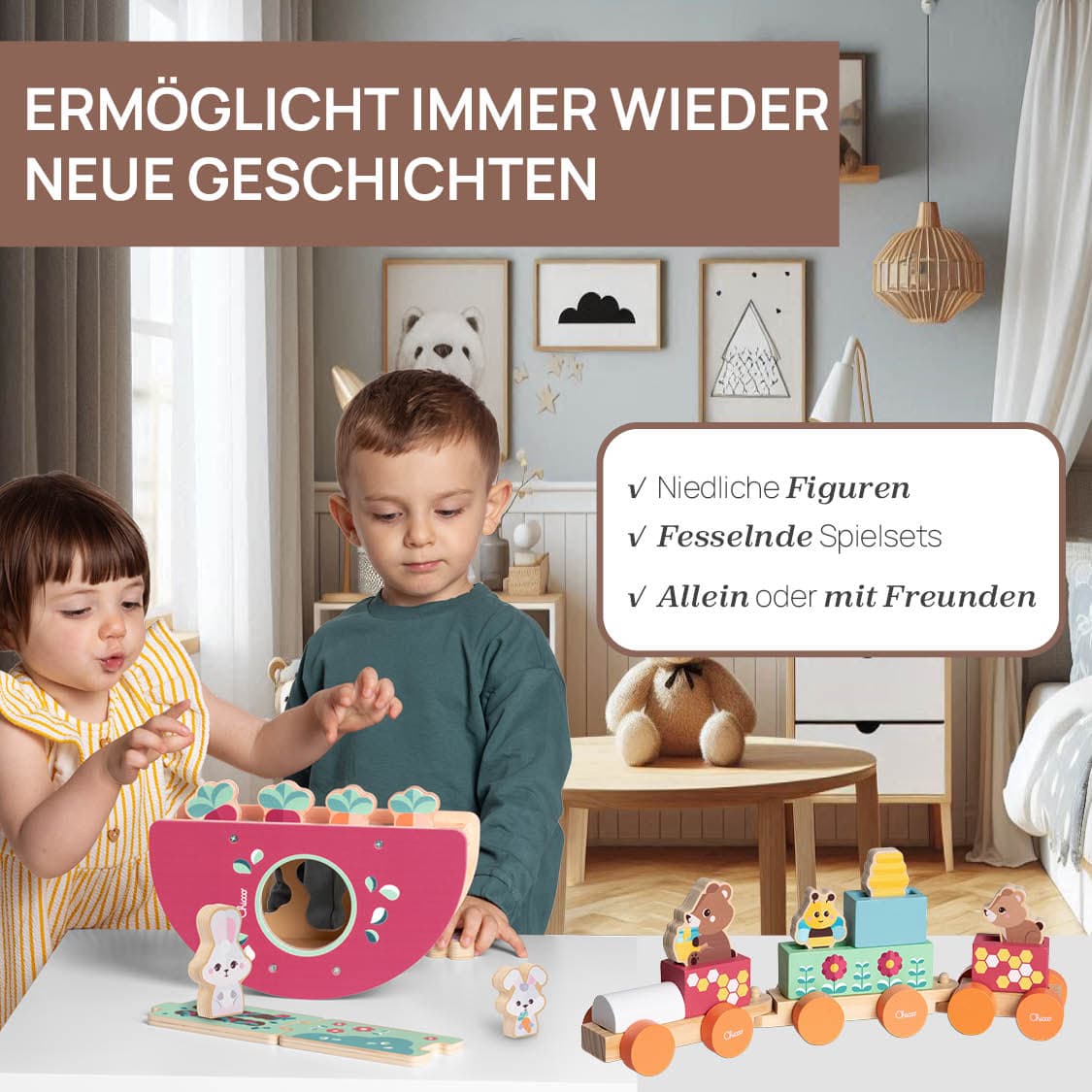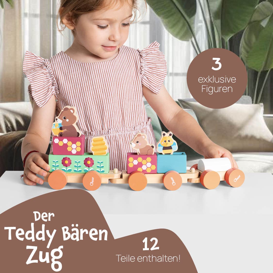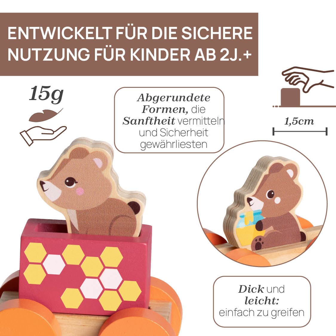 Der Teddyzug: Steig ein und begleite die süßen Bären auf Honigsuche! • Holzzug mit Freilauf und 3 Waggons: Die Waggons lassen sich dank eines intuitiven Stecksystems leicht verbinden. Diese Aktivität fördert die Feinmotorik der Kinder. • Freie Beweglichkeit in alle Richtungen: Durch die Freilauf-Räder kann der Zug vorwärts, rückwärts und in jede Richtung bewegt werden. Er ist besonders leicht und ideal zum Spielen. • Umfangreiches Spielset: Fünf bunte und illustrierte Bausteine ermöglichen es, den Zug nach Belieben zusammenzustellen. Kinder können ihrer Fantasie freien Lauf lassen und den Zug für das nächste Abenteuer vorbereiten. • Vier exklusive Figuren: Im Set enthalten sind zwei niedliche Bären, eine kleine Biene und ein Honigglas.