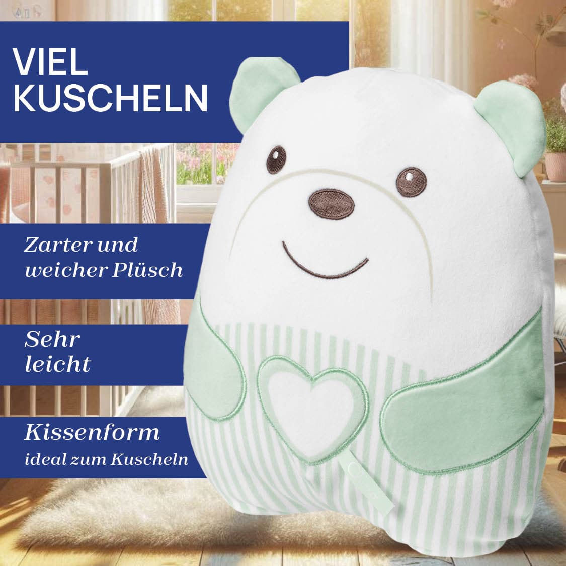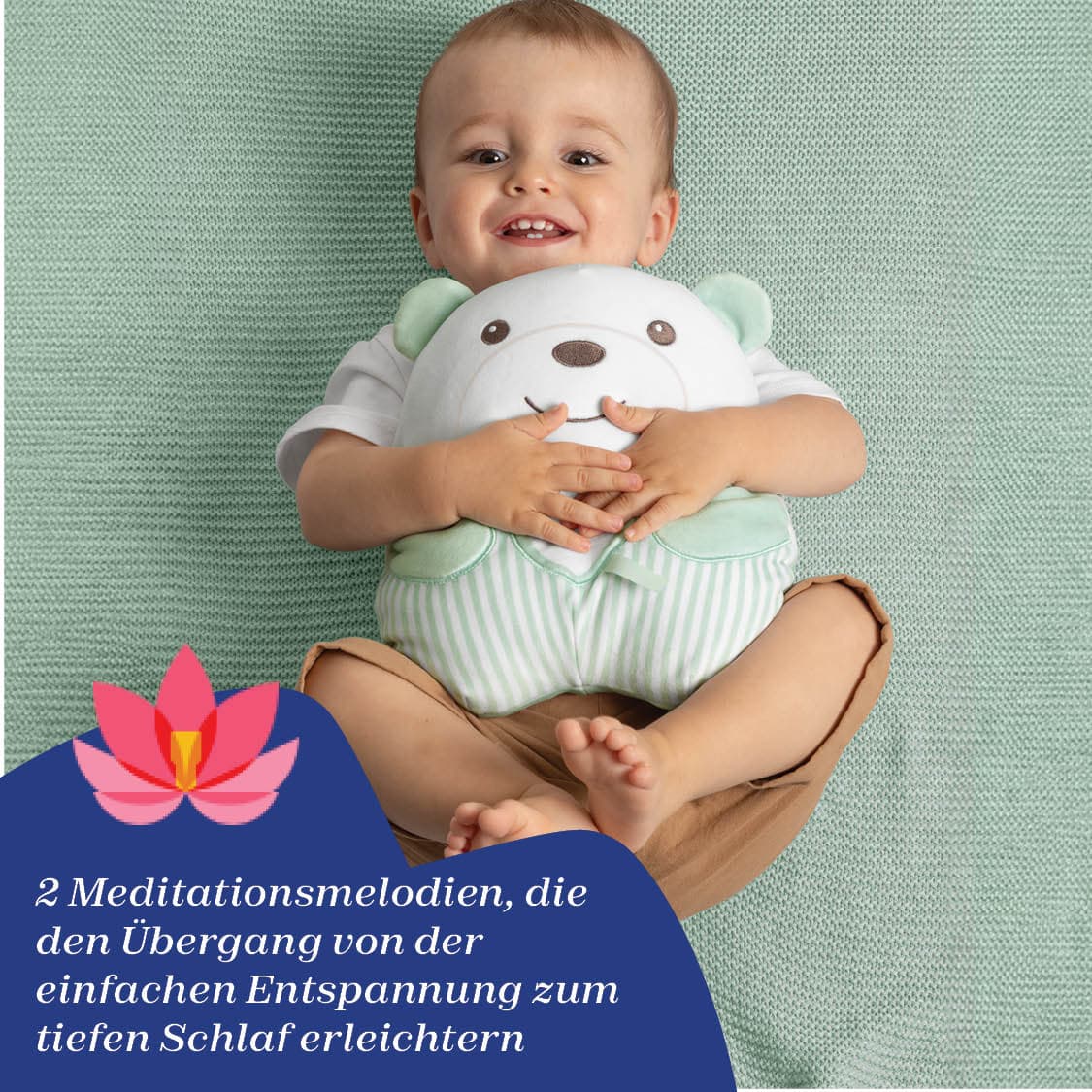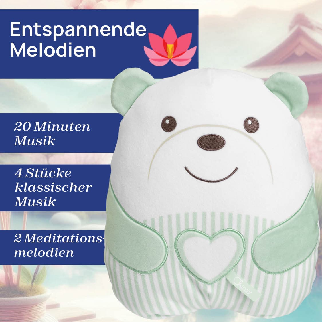 Süßer Kuschelbär: Sanfter Begleiter für entspannte Momente • Beruhigende Melodien: Der Kuschelbär spielt klassische Musik und Meditationsmelodien, die das Baby sanft beruhigen. Ein weiches, weißes Nachtlicht schafft eine entspannte Atmosphäre. • Sanftes Design: Kuscheliger Bär aus weichem Velours mit besonders softer Füllung. Seine kissenartige Form lädt Babys zum Kuscheln und Drücken ein. • Einfache Bedienung: Durch Drücken des herzförmigen Knopfes am Bauch startet ein 20-Minuten-Zyklus entspannender Melodien. Wähle eine Lieblingsmelodie, um das Baby sanft zu begleiten und eine tiefe Entspannung zu fördern. • Pflegeleicht: Der Kuschelbär ist maschinenwaschbar, nachdem das elektronische Modul entnommen wurde.