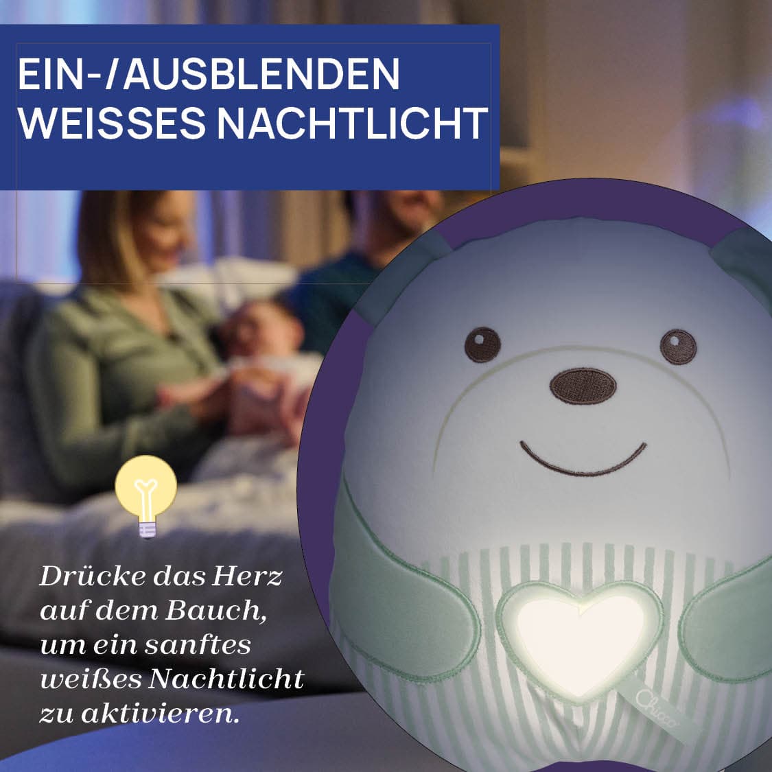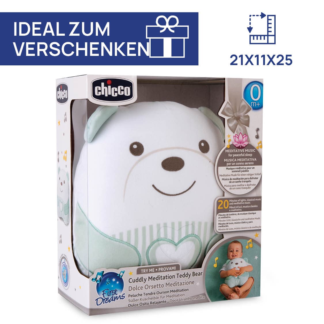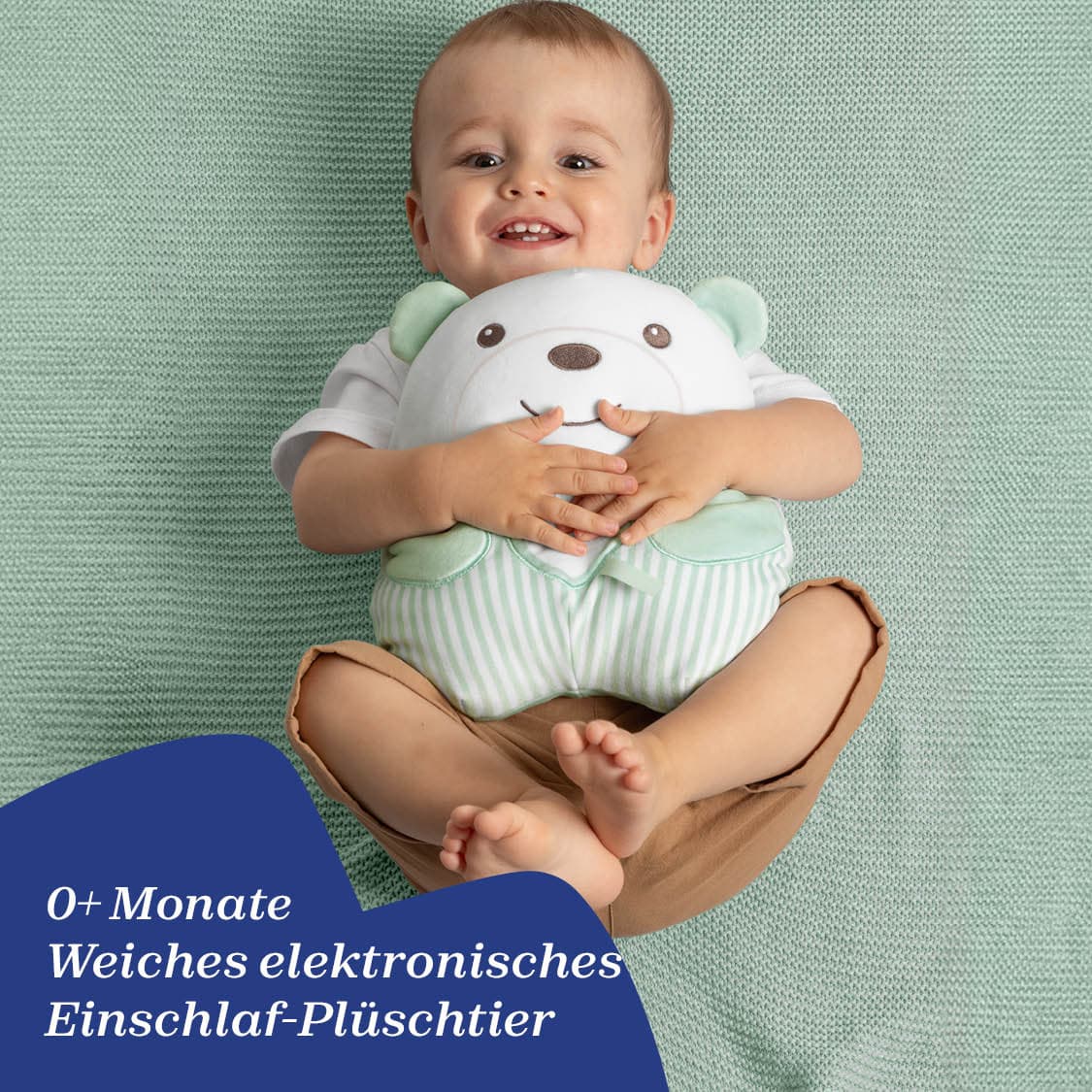 Süßer Kuschelbär: Sanfter Begleiter für entspannte Momente • Beruhigende Melodien: Der Kuschelbär spielt klassische Musik und Meditationsmelodien, die das Baby sanft beruhigen. Ein weiches, weißes Nachtlicht schafft eine entspannte Atmosphäre. • Sanftes Design: Kuscheliger Bär aus weichem Velours mit besonders softer Füllung. Seine kissenartige Form lädt Babys zum Kuscheln und Drücken ein. • Einfache Bedienung: Durch Drücken des herzförmigen Knopfes am Bauch startet ein 20-Minuten-Zyklus entspannender Melodien. Wähle eine Lieblingsmelodie, um das Baby sanft zu begleiten und eine tiefe Entspannung zu fördern. • Pflegeleicht: Der Kuschelbär ist maschinenwaschbar, nachdem das elektronische Modul entnommen wurde.