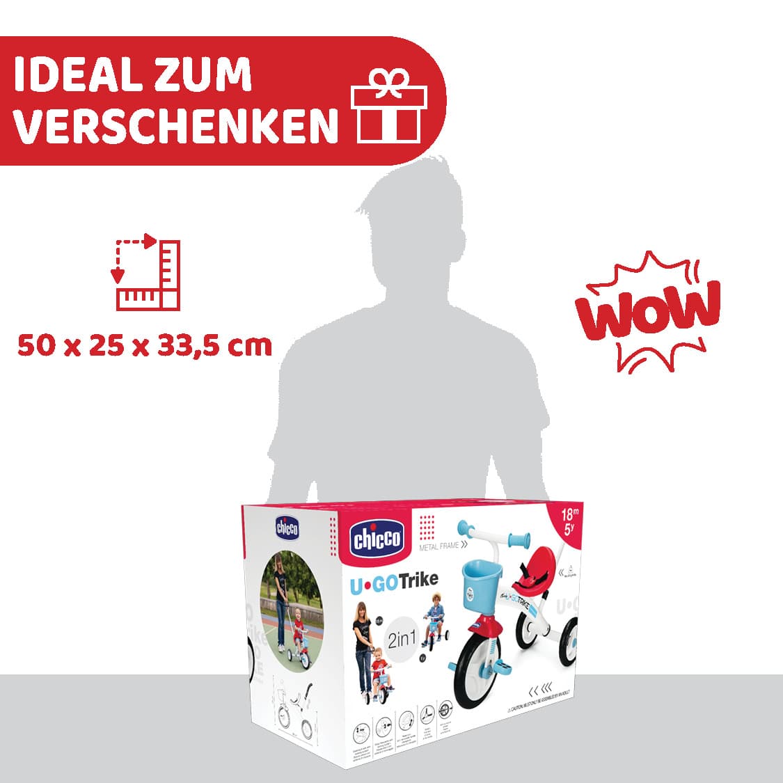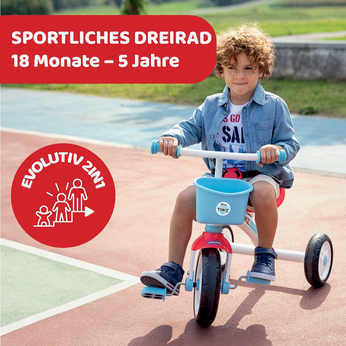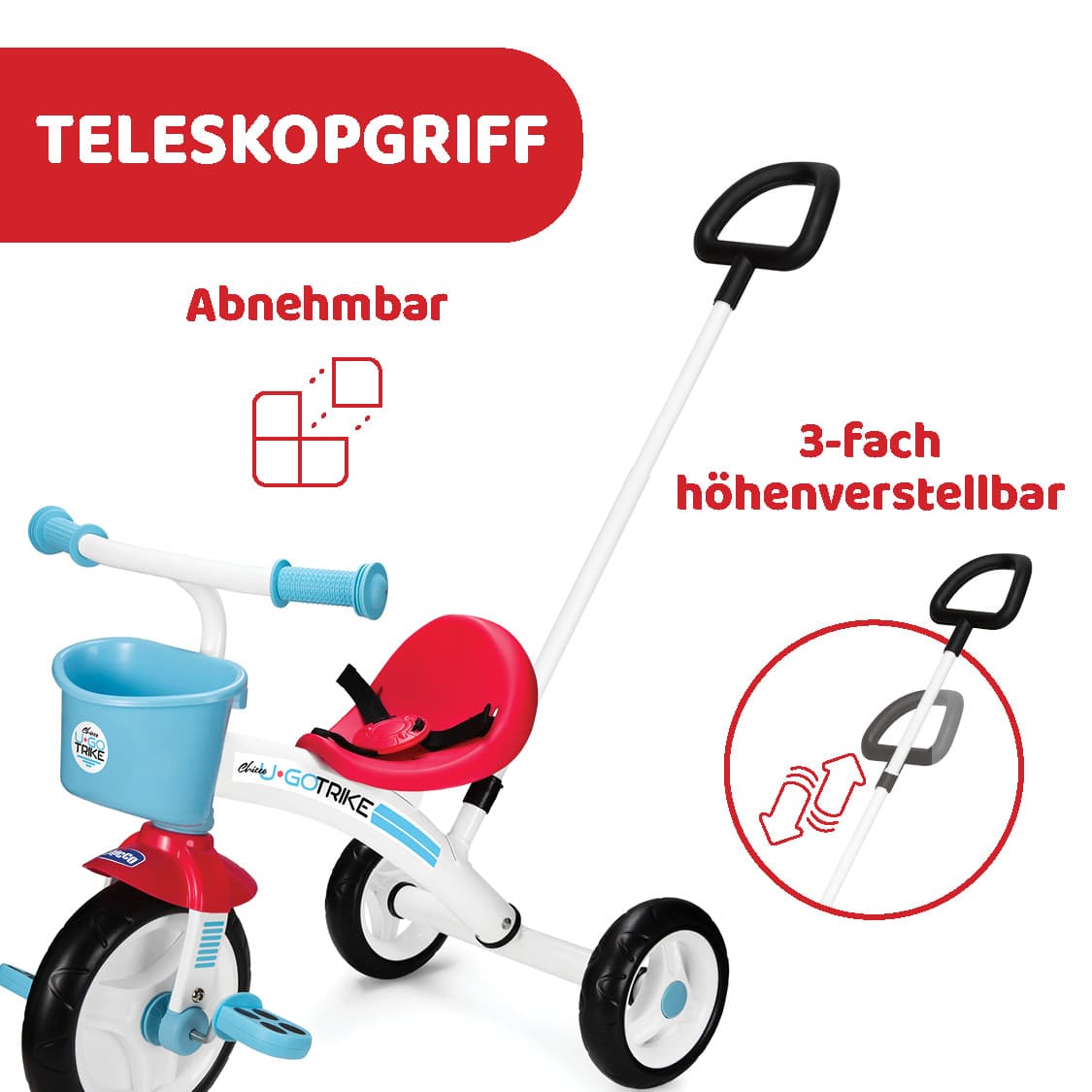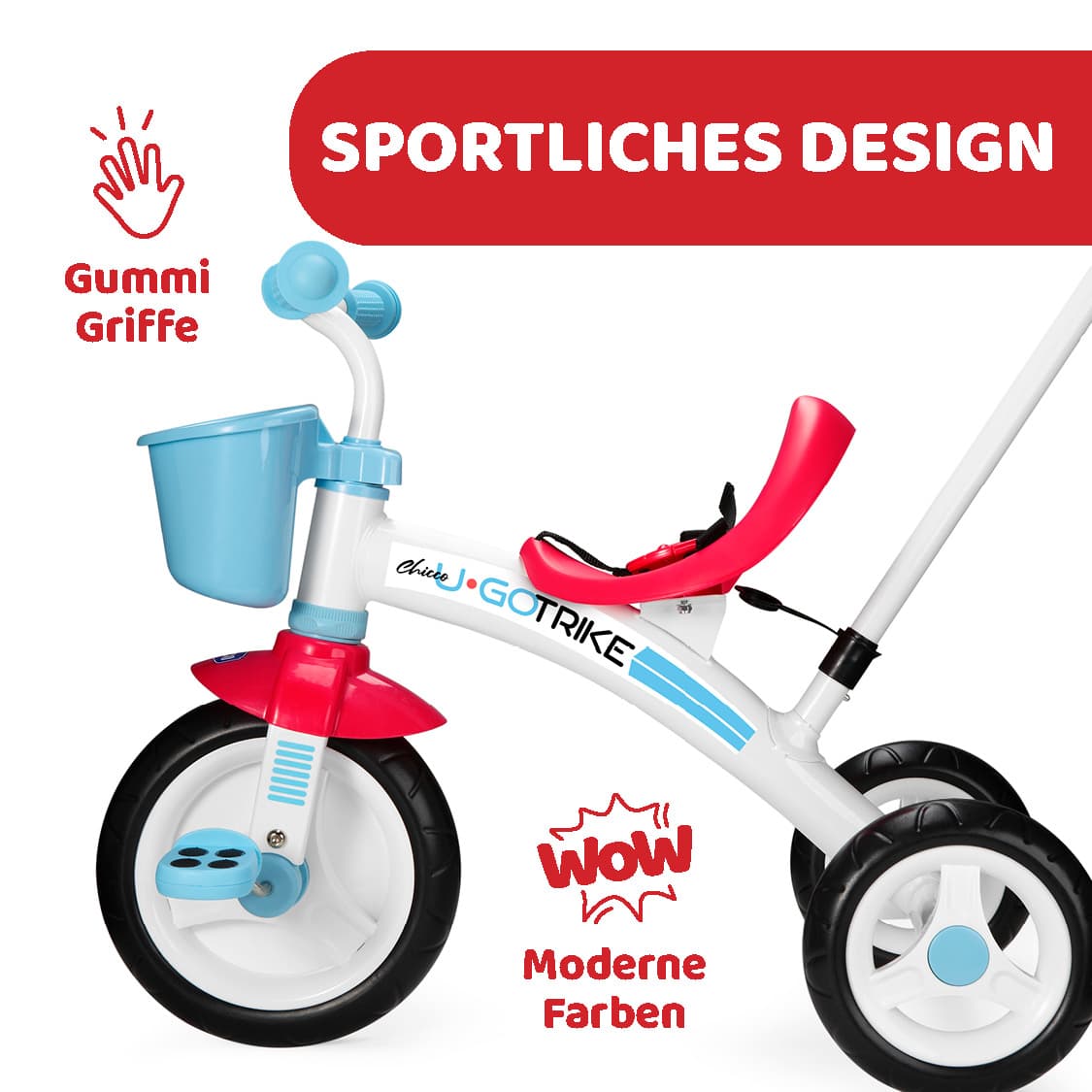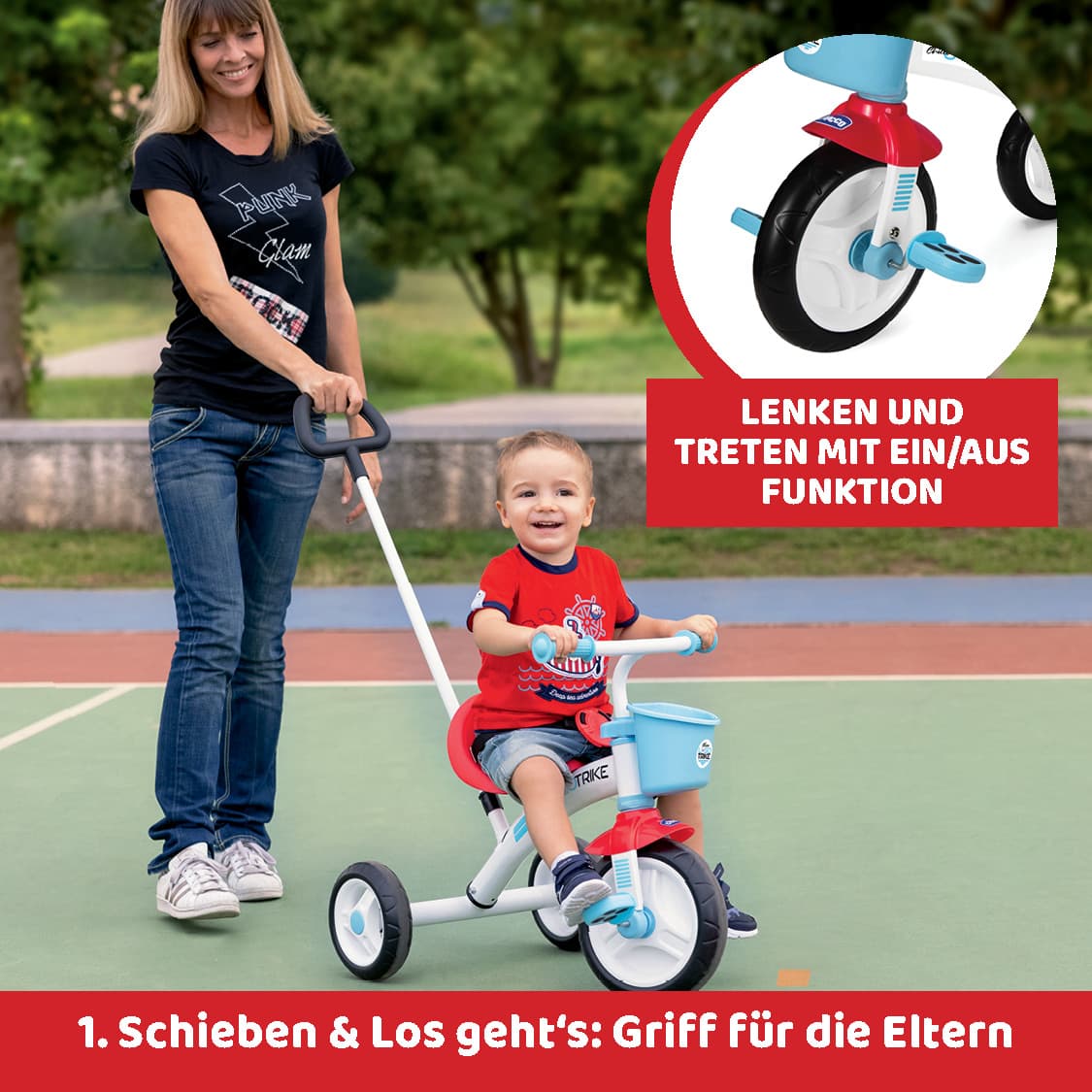 • 2in1 evolutives Dreirad• Mit Sicherheitsgurt und Aufbewahrungsmöglichkeiten• Lenkradsicherung, die ein Feststellen oder Bewegen des Rades ermöglicht• Zwei Nutzungsmöglichkeiten:1. Schieben und Laufen: Der Schieber ist in der Höhe verstellbar und kann so auf die Größe des Elternteils angepasst werden2. Freie Fahrt: Das Kind kann auf eigene Faust die Umgebung erkunden!• Höchstgewicht 20 kg