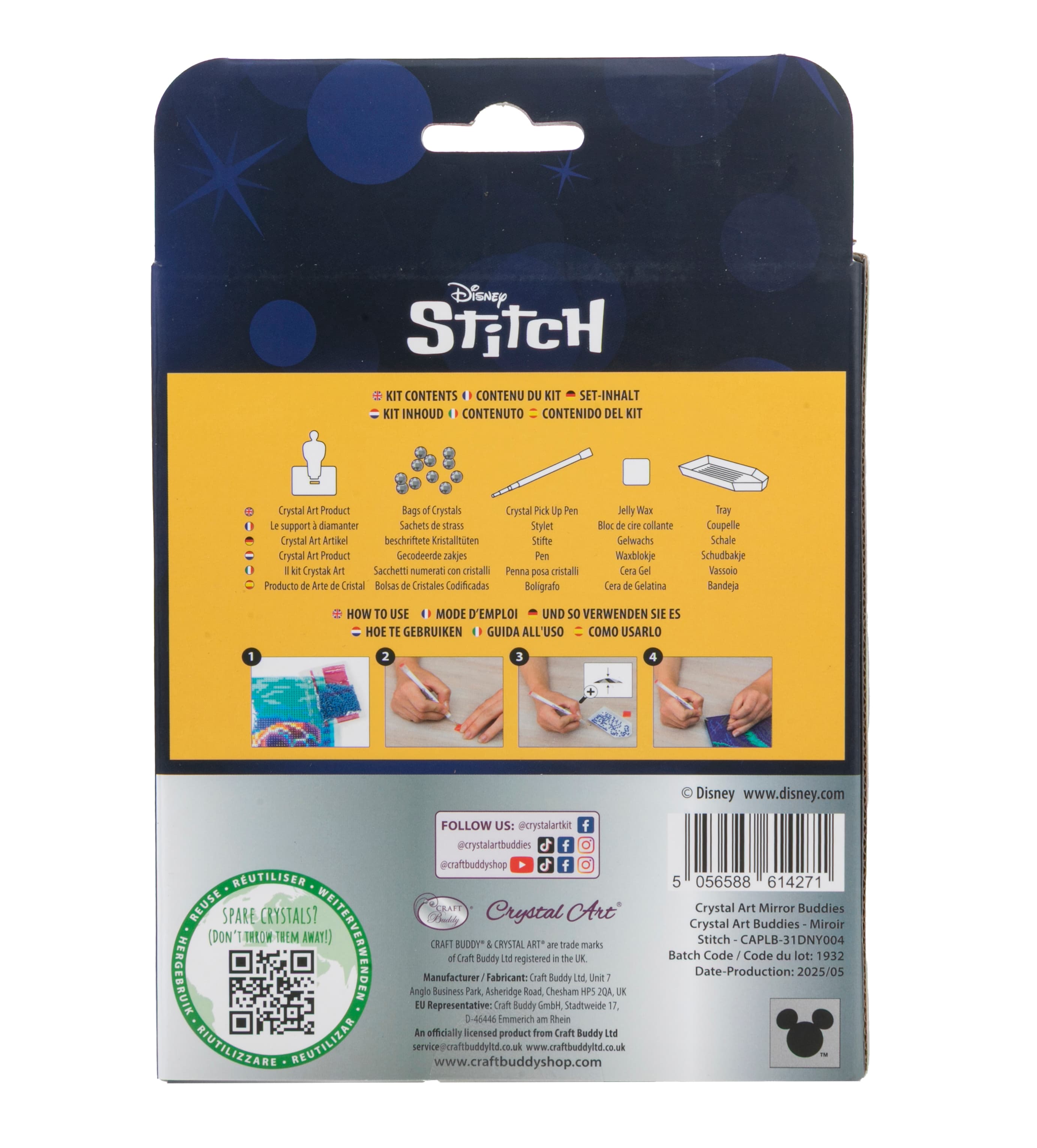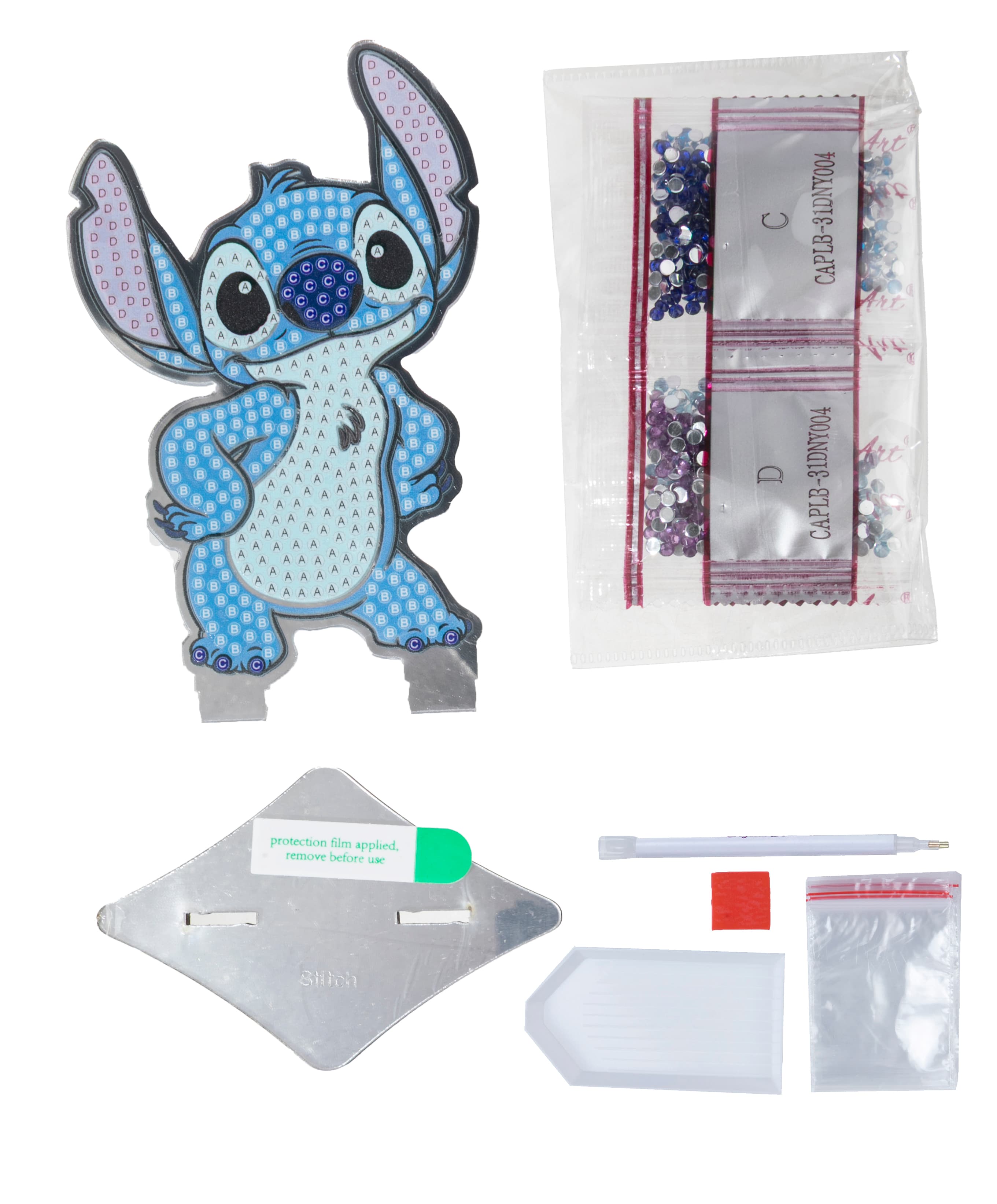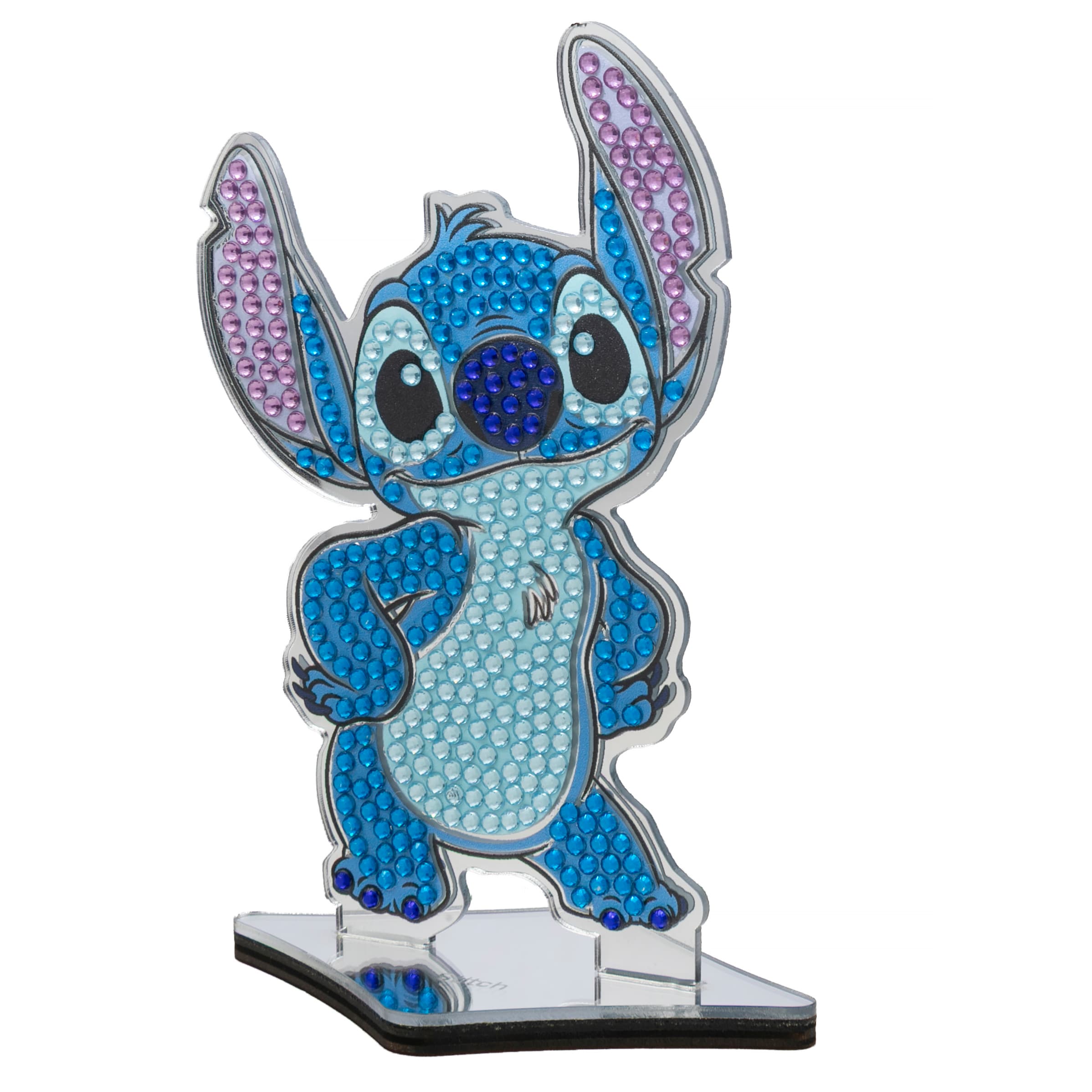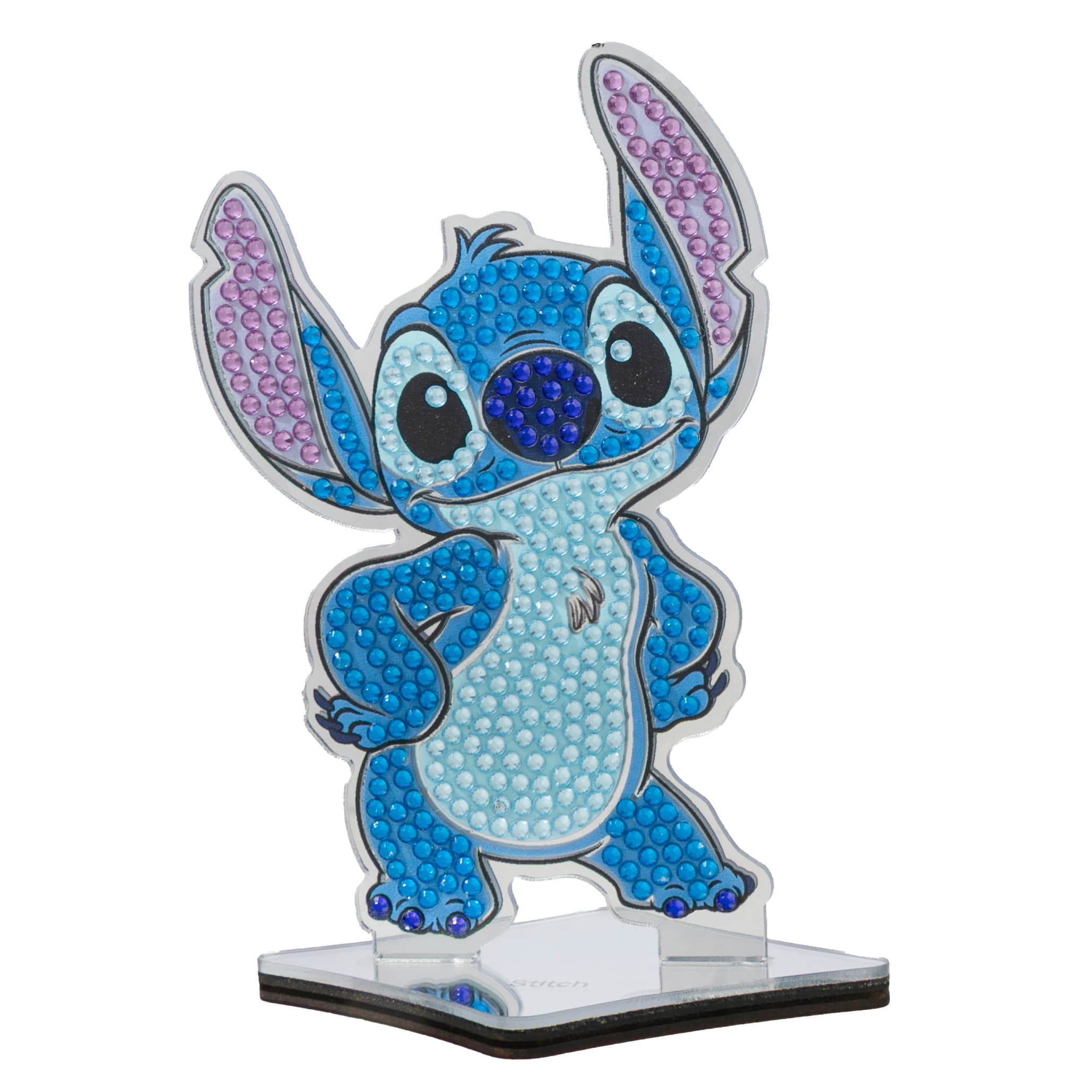 Gestalte eine funkelnde STITCH-Figur nach einem vorgegebenen, verspiegelten Design auf einer Holzvorlage Alle Kretaivstes enthalten: 1 selbstklebende Holzvorlage, vorsortierte Beutel mit farbigen Kristallen, Stift zum Aufnehmen der Kristalle, Schale, Gelwachs, Bastelanleitung