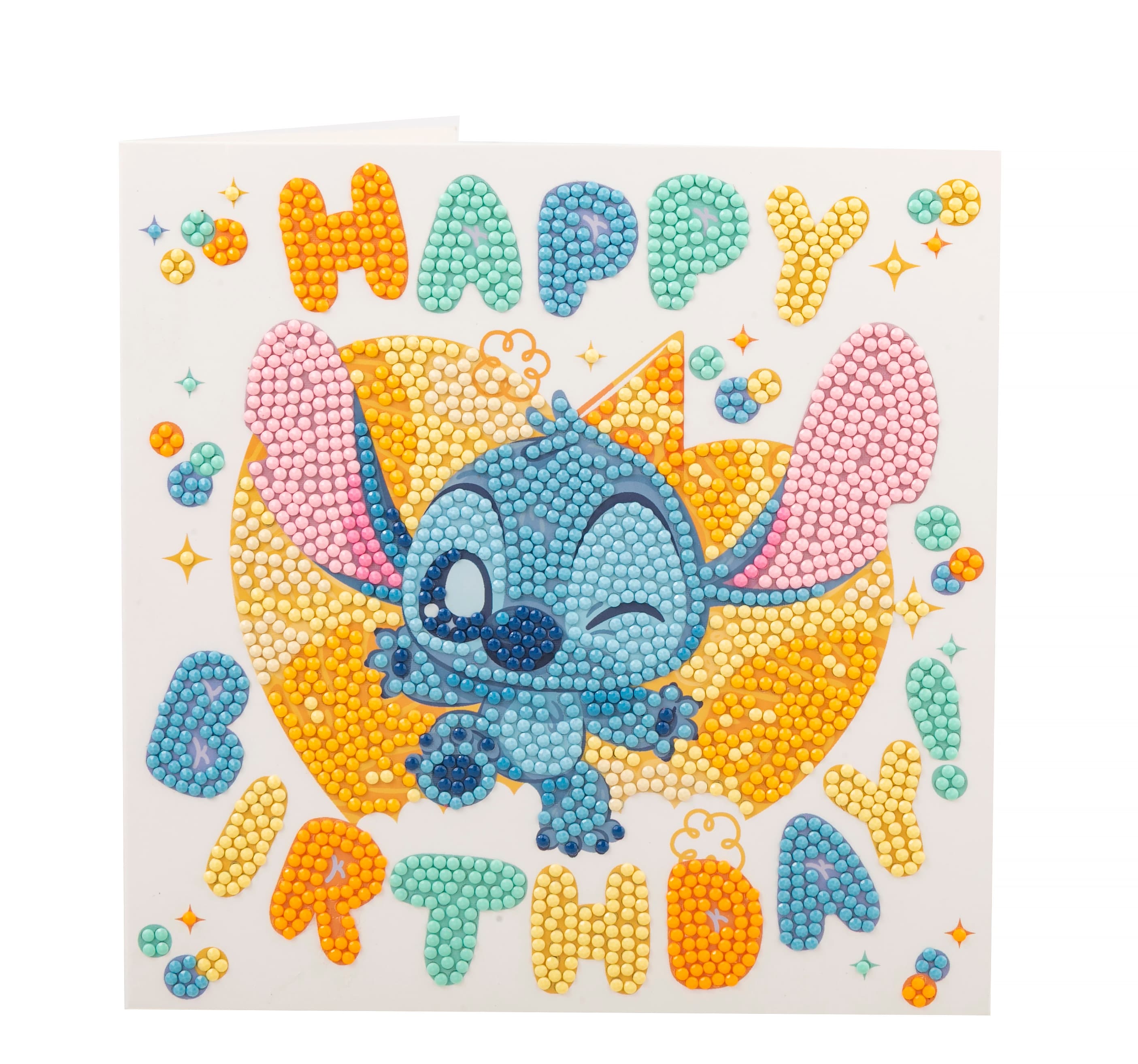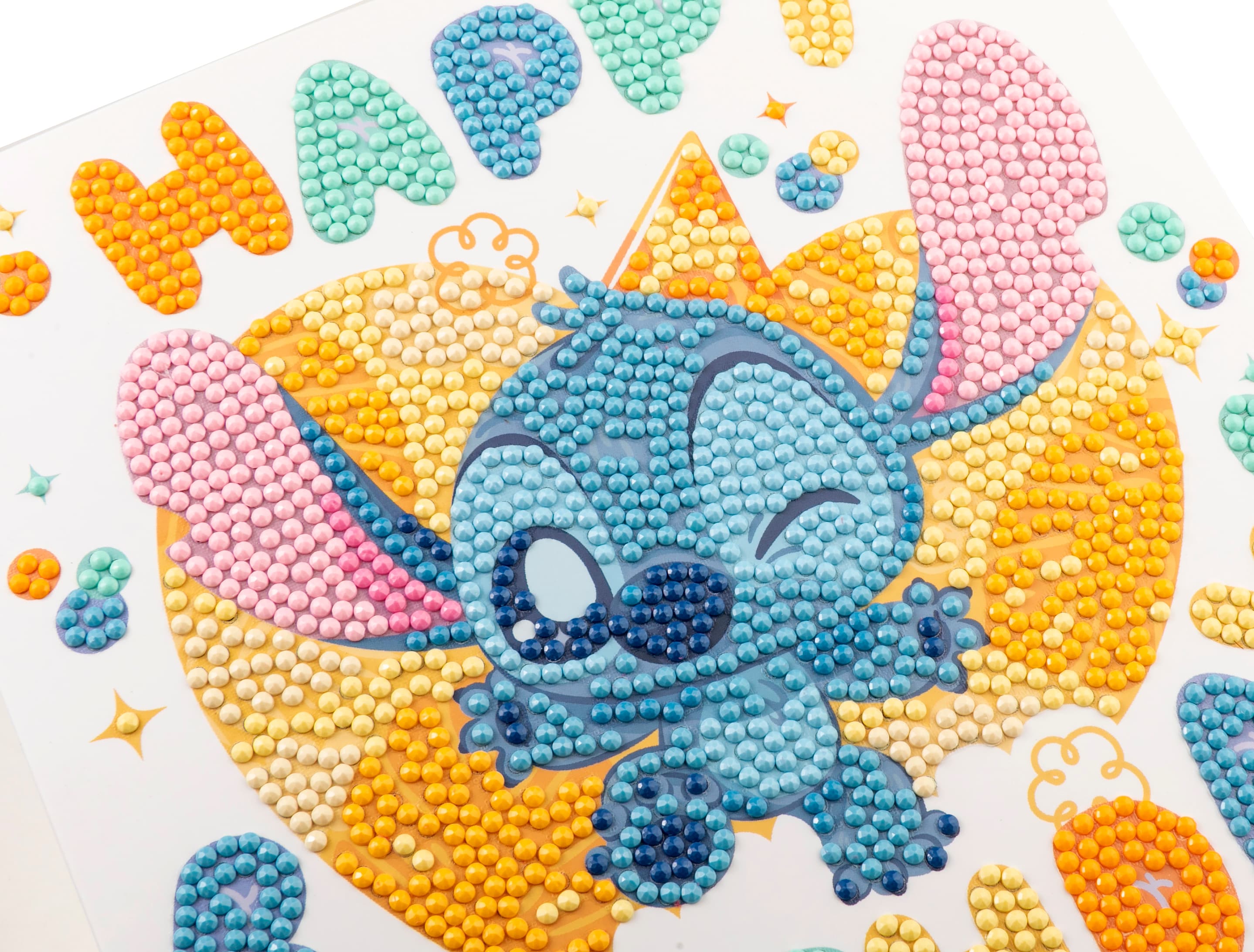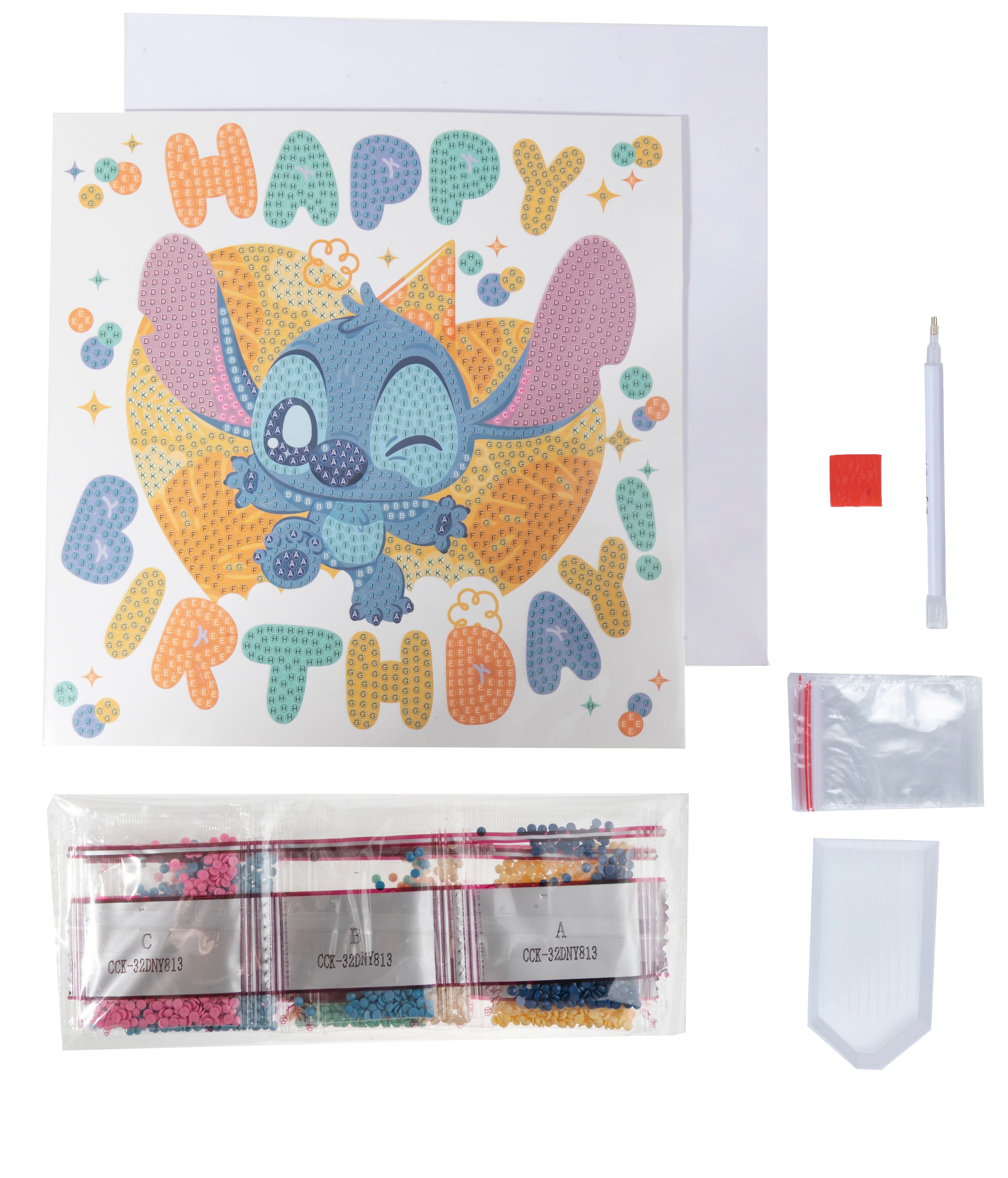 Gestalte deine eigene wunderschön funkelnde Grußkarte nach einem vorgegebenen STITCH GEBURTSTAGSDESIGN. Alle Kreativsets enthalten: 1 Grußkarte 18x18cm mit selbstklebender Vorlage, Briefumschlag, vorsortierte Beutel mit farbigen Kristallen, Stift zum Aufnehmen der Kristalle, Schale, Geleewachs, Bastelanleitung