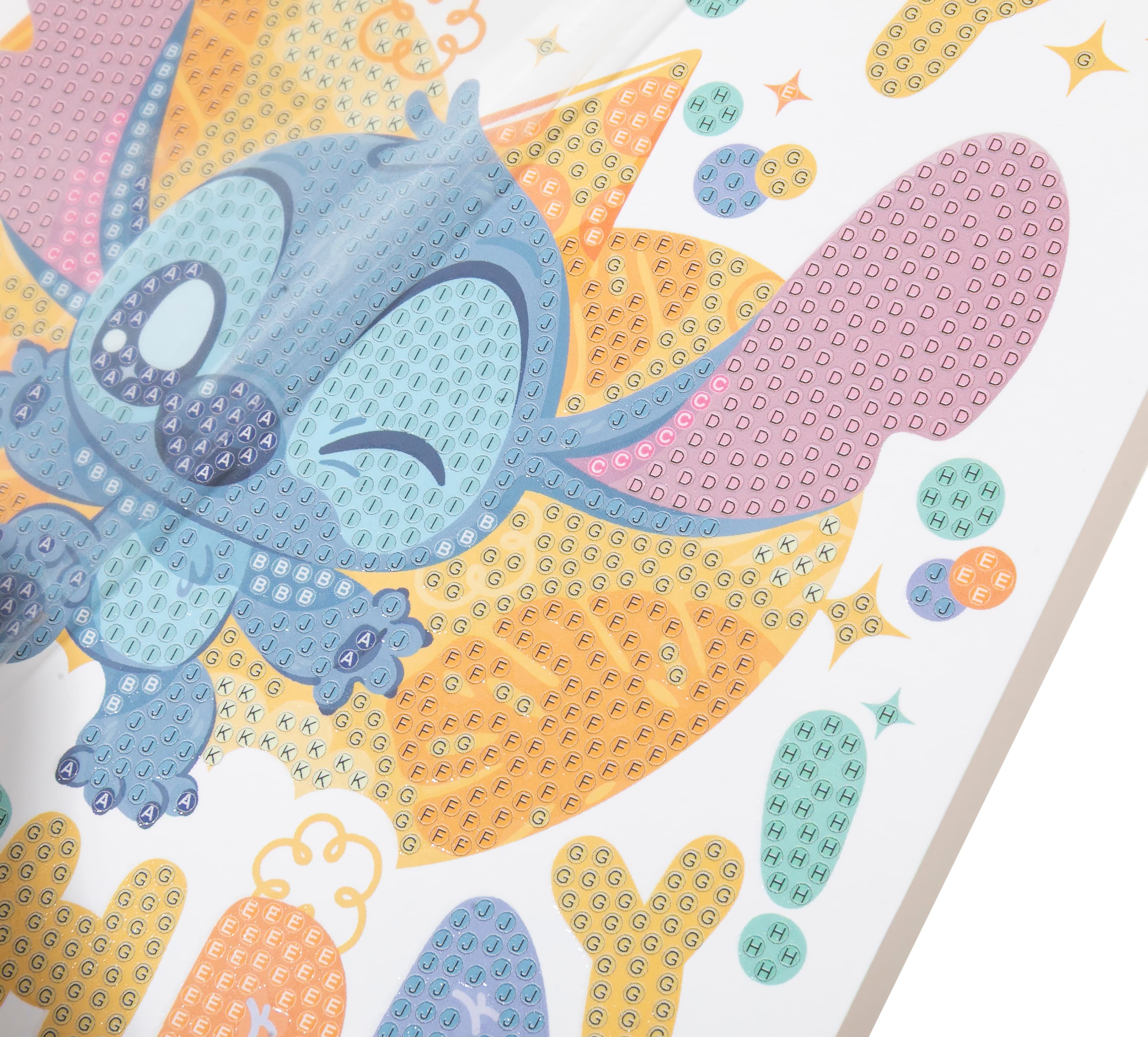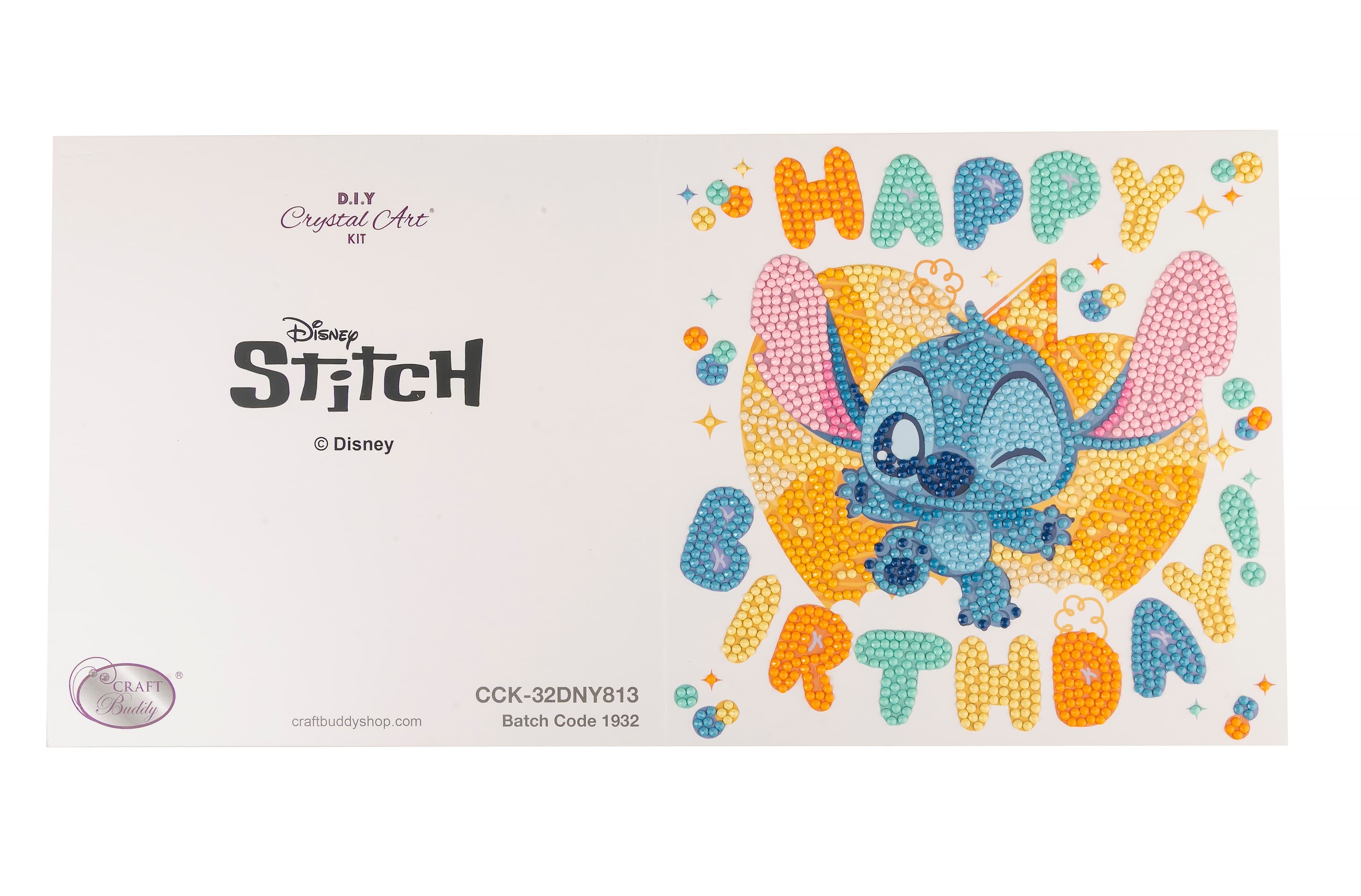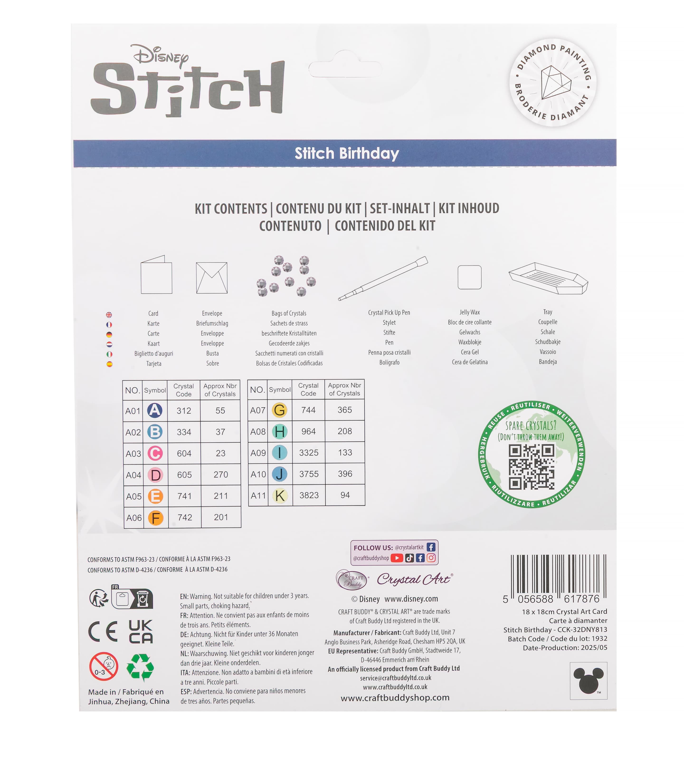 Gestalte deine eigene wunderschön funkelnde Grußkarte nach einem vorgegebenen STITCH GEBURTSTAGSDESIGN. Alle Kreativsets enthalten: 1 Grußkarte 18x18cm mit selbstklebender Vorlage, Briefumschlag, vorsortierte Beutel mit farbigen Kristallen, Stift zum Aufnehmen der Kristalle, Schale, Geleewachs, Bastelanleitung