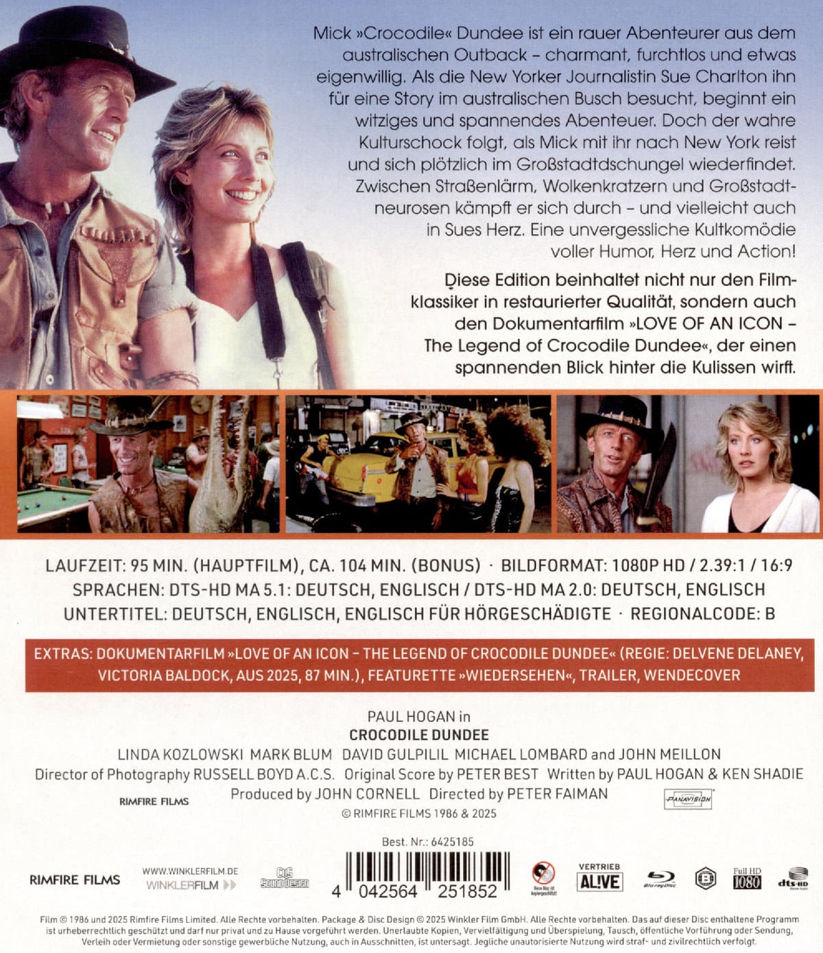 | Zusatzinfos / Bonusmaterial beim Film dabei | Dokumentarfilm LOVE OF AN ICON ; The Legend of Crocodile Dundee (AUS 2025; 84 Min.; Regie: Delvene Delaney; Victoria Baldock); Featurette WIEDERSEHEN; Trailer; Wendecover |
