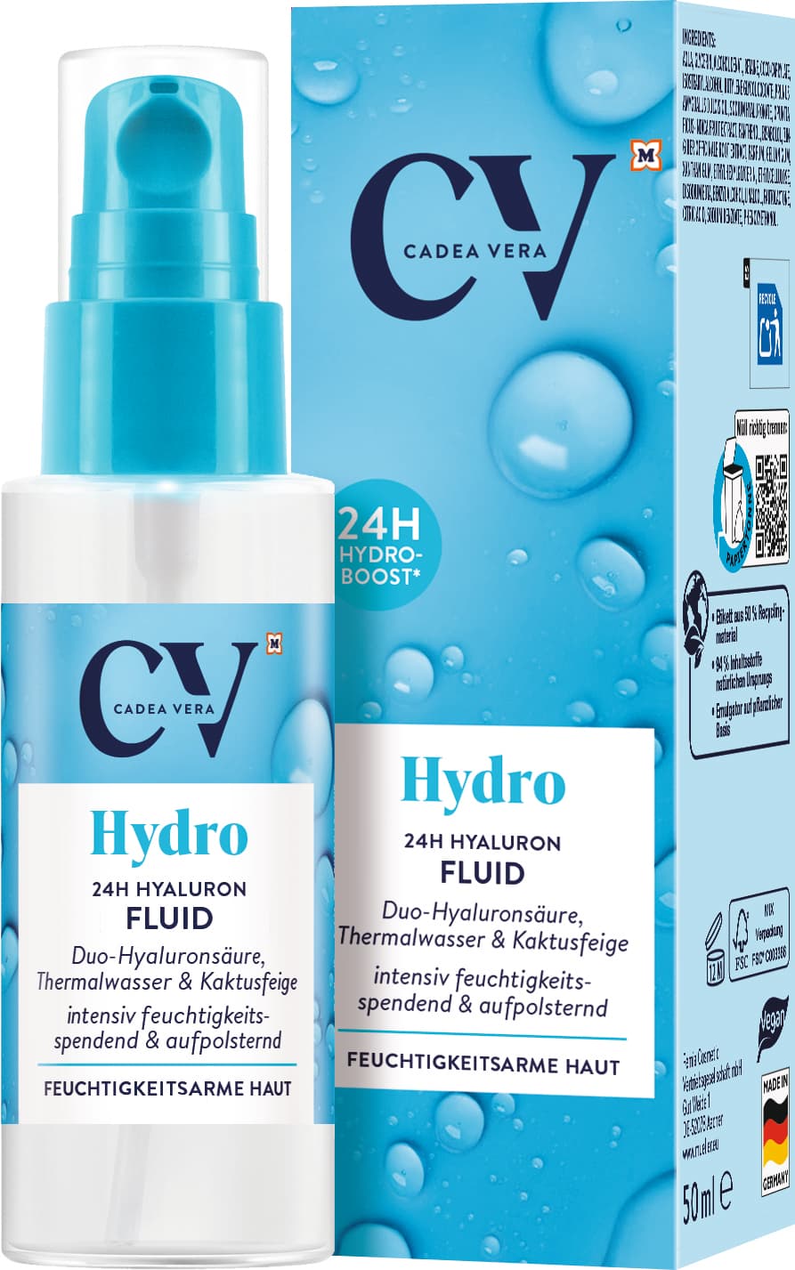 Die CV 24h Hyaluron Fluid mit Duo-Hyaluronsäure, Thermalwasser und Kaktusfeige verleiht der Haut einen puren Frische-Kick und spendet sofort bis zu 24h* intensive Feuchtigkeit. Feine Linien, Trockenheitsfältchen und Spannungsgefühle werden gemildert. Für einen aufgepolsterten, glatteren Teint.