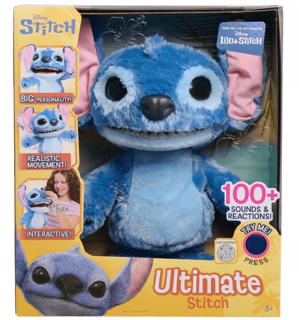Erlebe die volle Bandbreite von Stitchs Persönlichkeit – von liebevoll bis wild! Der Disney Lilo & Stitch Ultimate Animatronic Plush ist ein 43 cm großer interaktiver Plüschfreund, inspiriert vom Live-Action-Film „Lilo & Stitch“. Mit über 100 Sound- und Bewegungs-Kombinationen bringt Stitch Emotionen zum Leben: Er kichert, tanzt, singt, schnurrt und zeigt sogar seine feurige Seite mit witzigen Alien-Tiraden.