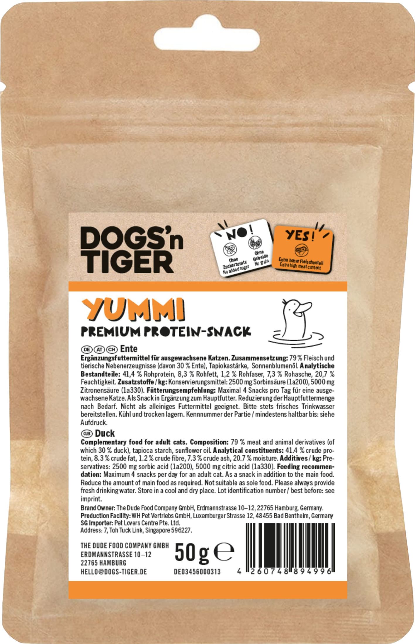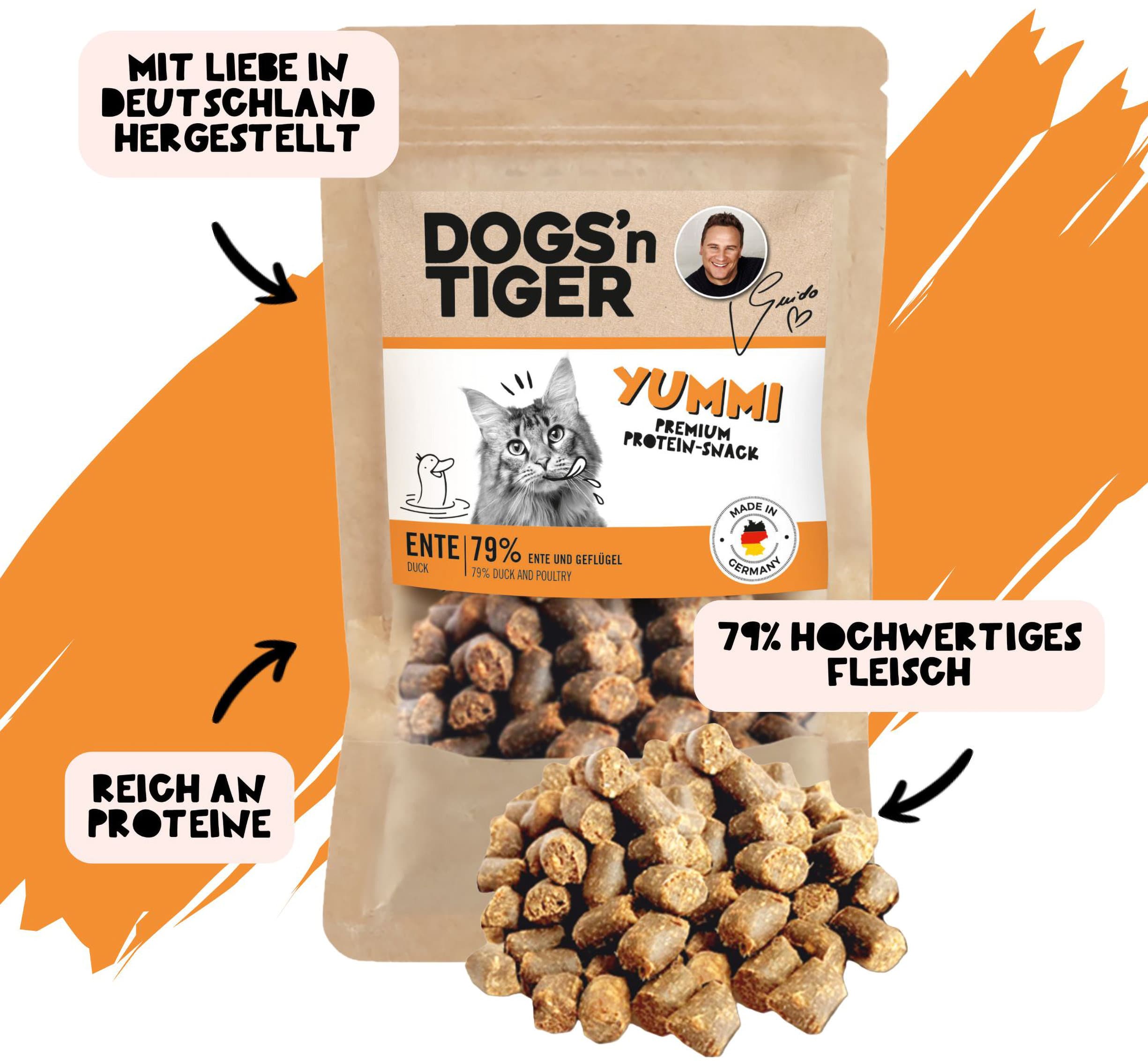 Mit unseren Yummi Ente Snacks verwöhnst du deine Katze mit saftigem Entenfleisch und einer Rezeptur, die auf Natürlichkeit und Qualität setzt. Die zarten Snacks sind ideal portioniert, schonend verarbeitet und frei von Getreide sowie Zuckerzusatz – perfekt für anspruchsvolle Samtpfoten und Katzenhalter, die Wert auf artgerechte Ernährung legen. Hochwertige Proteine aus Entenfleisch fördern eine gesunde Muskulatur und unterstützen die Vitalität deiner Katze. Die bekömmlichen Zutaten sorgen für ein rundum gutes Gefühl und machen die Snacks zur idealen Belohnung. Selbstverständlich verzichten wir auf künstliche Farb-, Aroma- und Konservierungsstoffe. Mit Dogs’n Tiger entscheidest du dich für ehrliche Zutaten, bewusste Katzenfütterung und Snacks, die Katzen lieben – natürlich, lecker und voller Qualität.