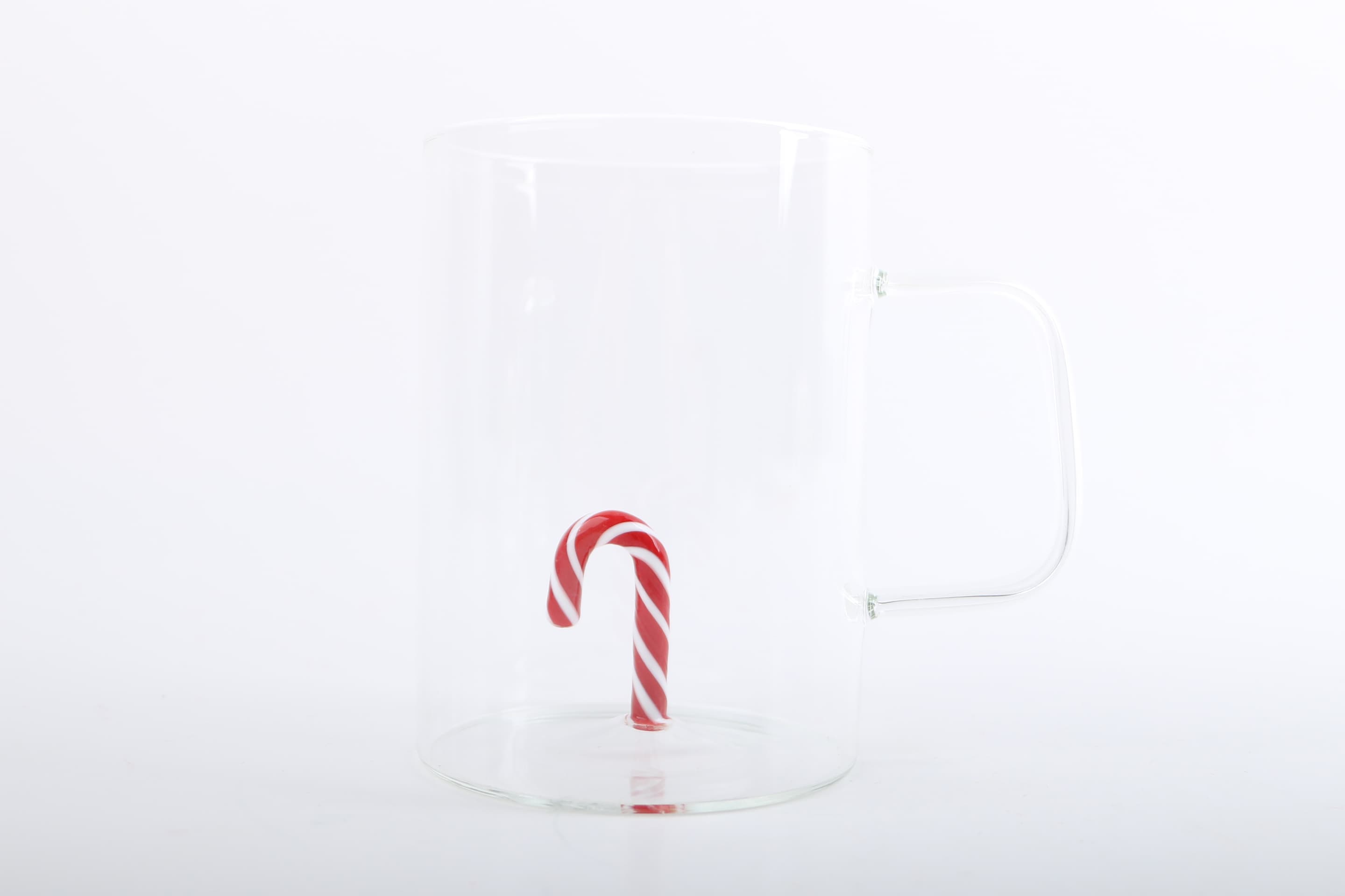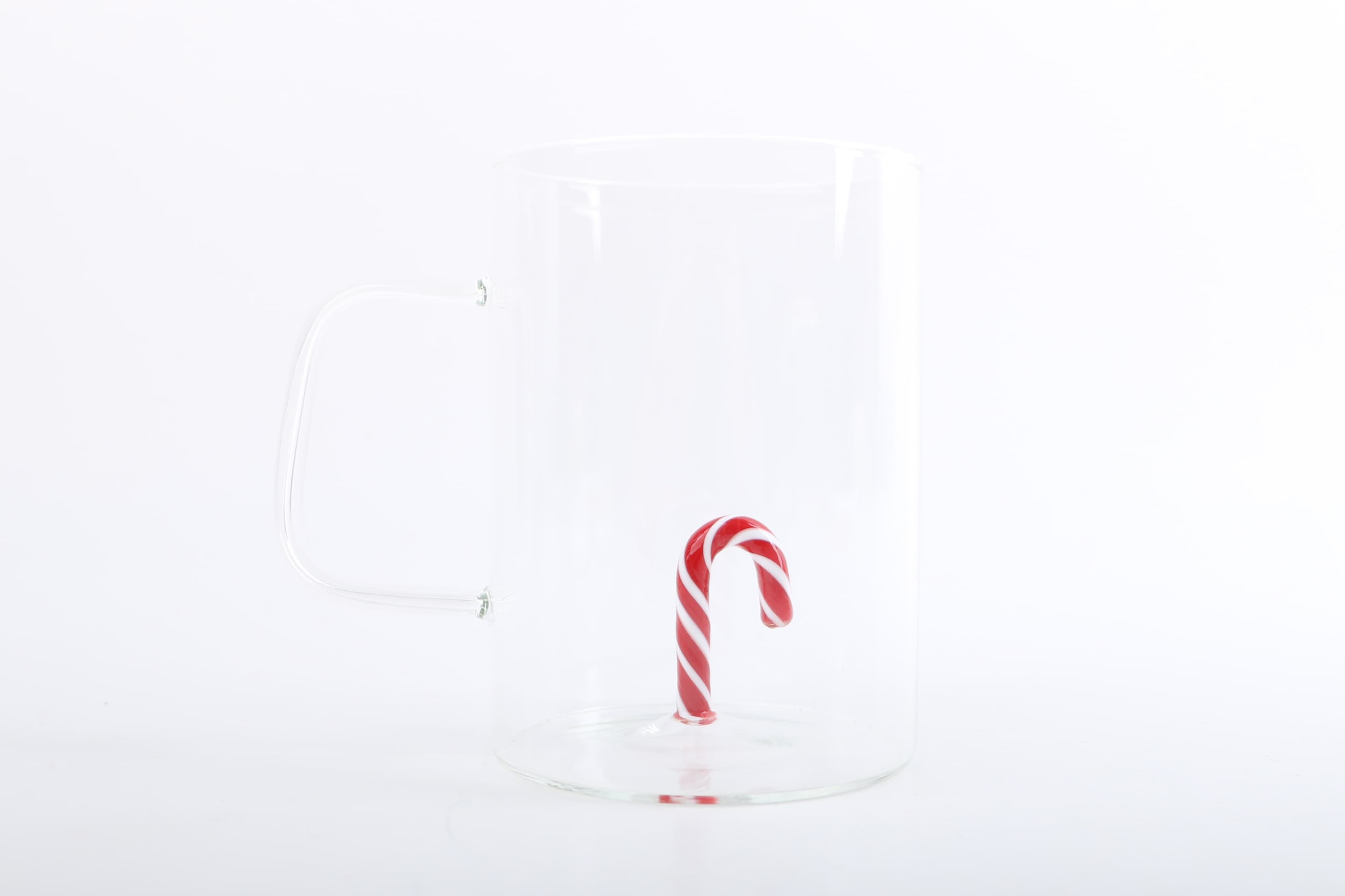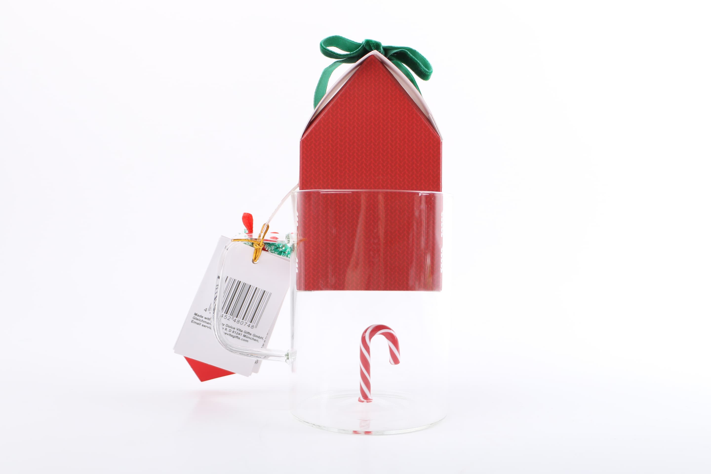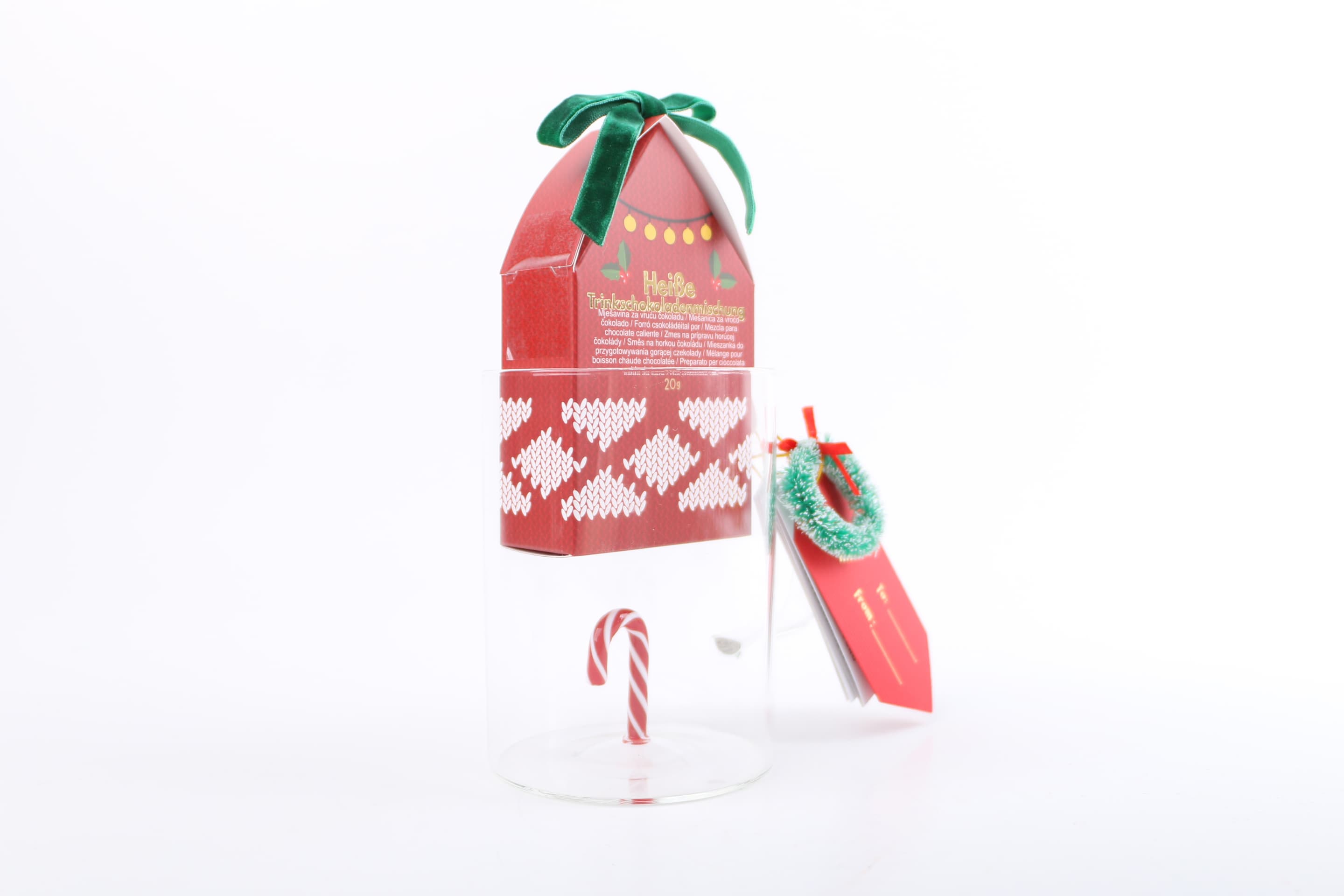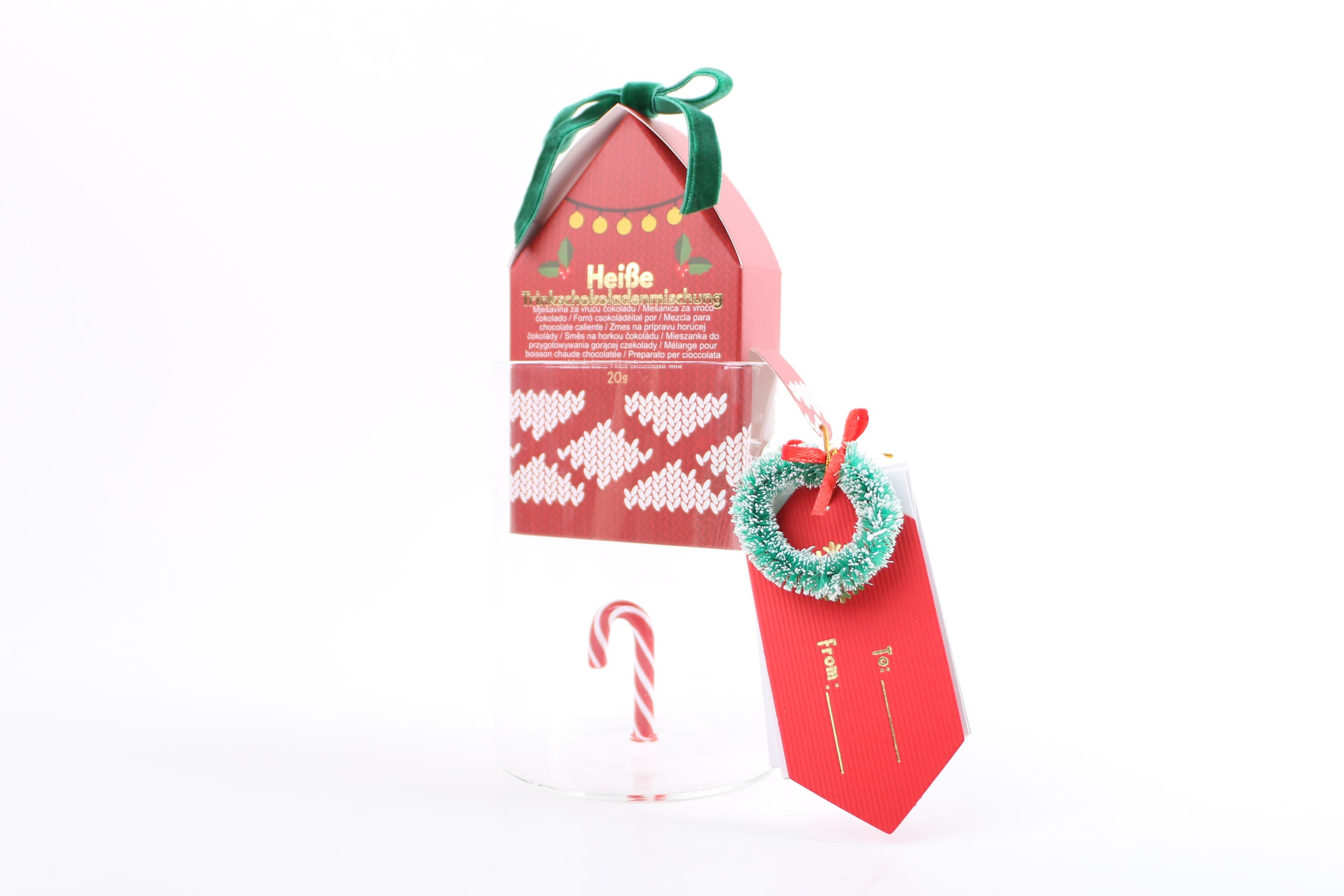 Geschenk-Set Glasbecher mit Zuckerstange und Heißer Trinkschokoladenmischung.