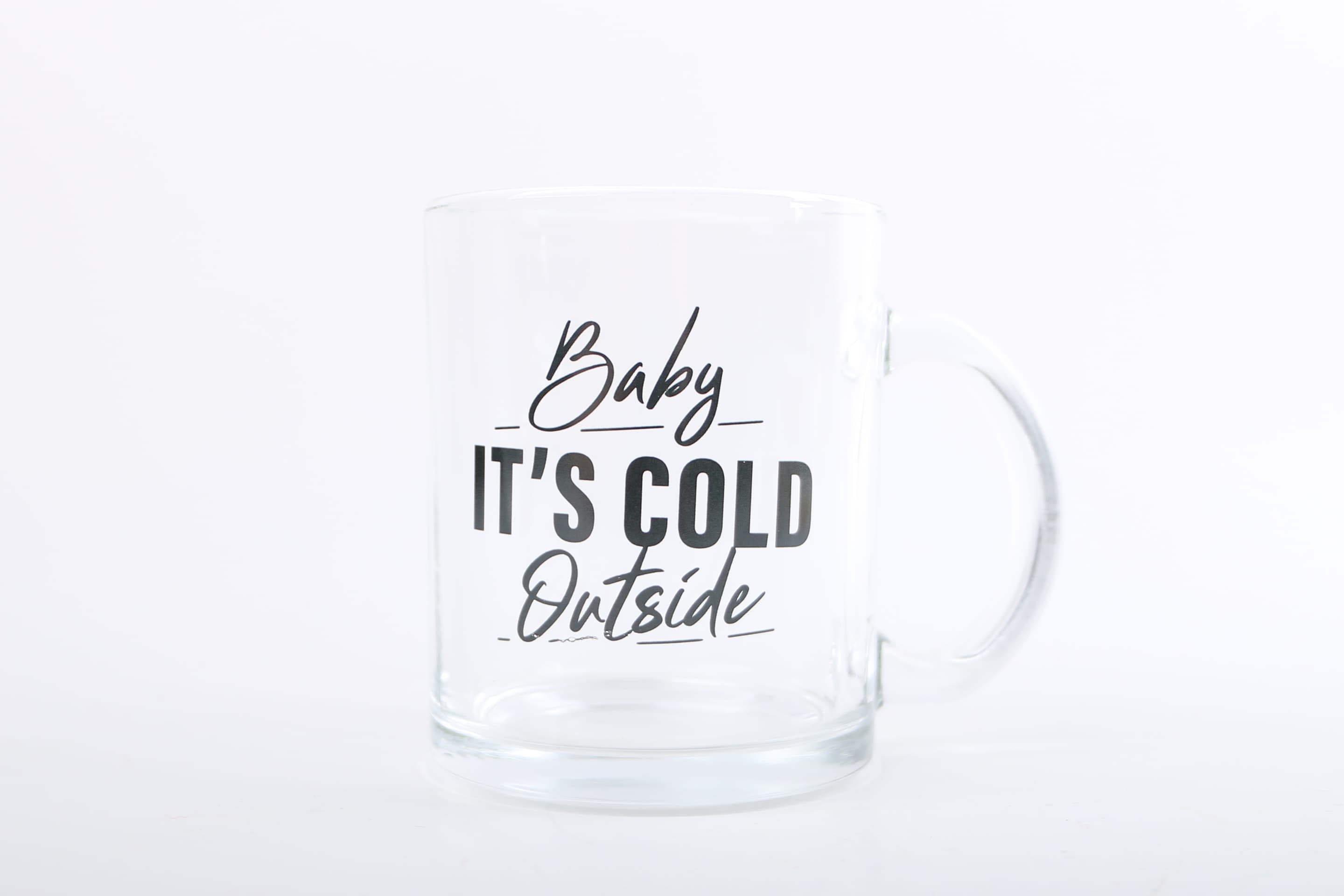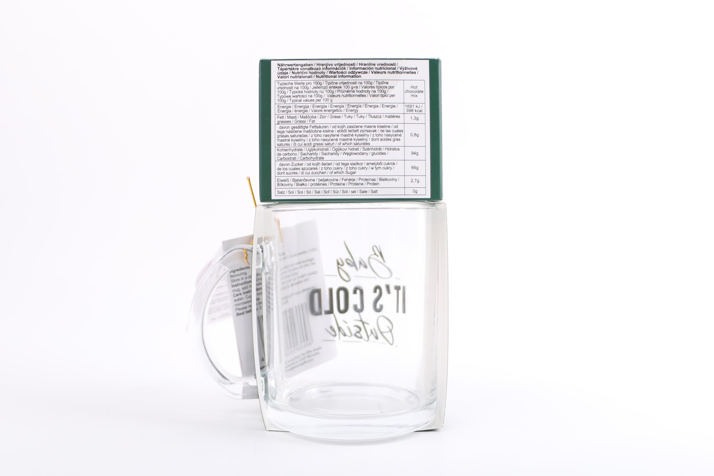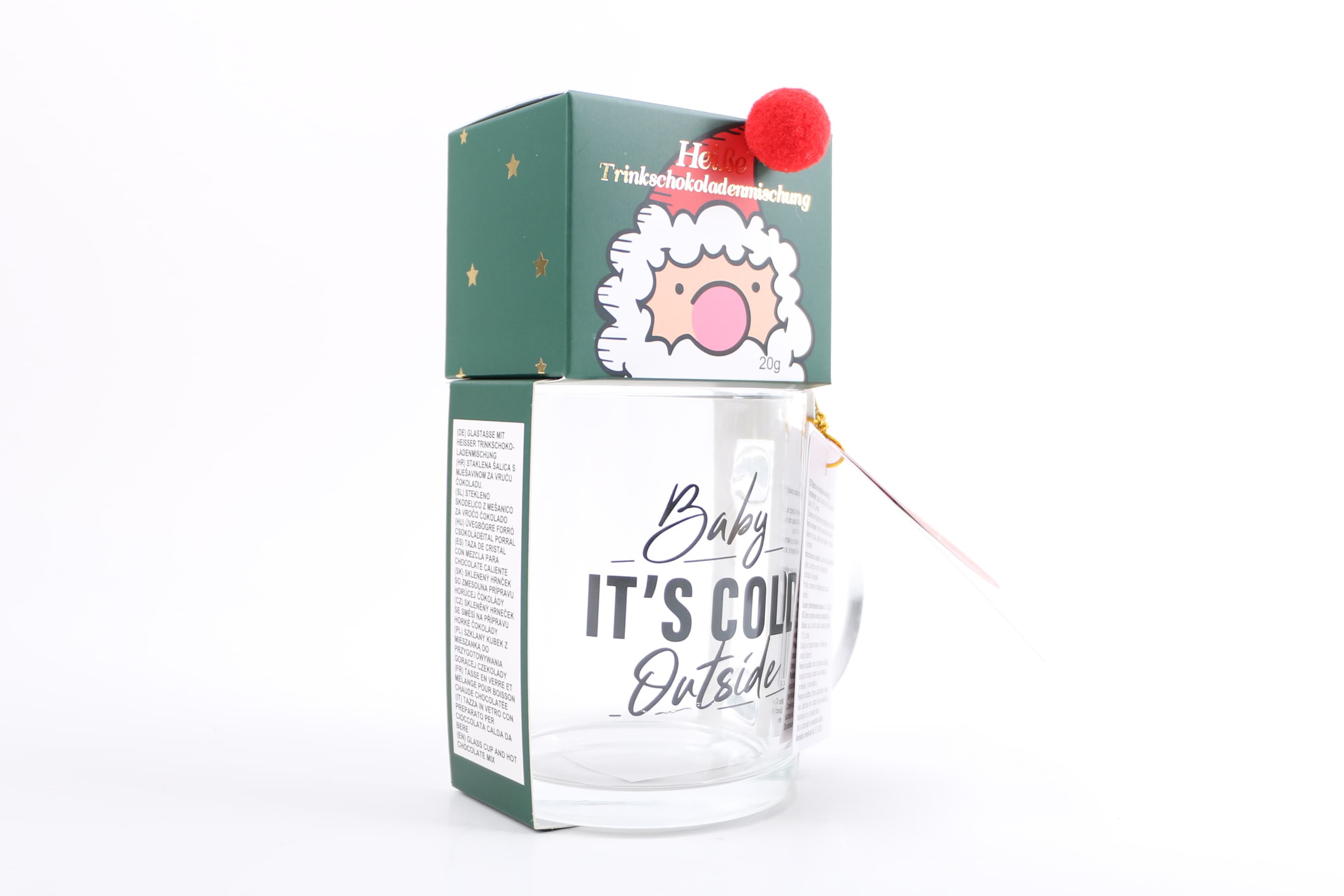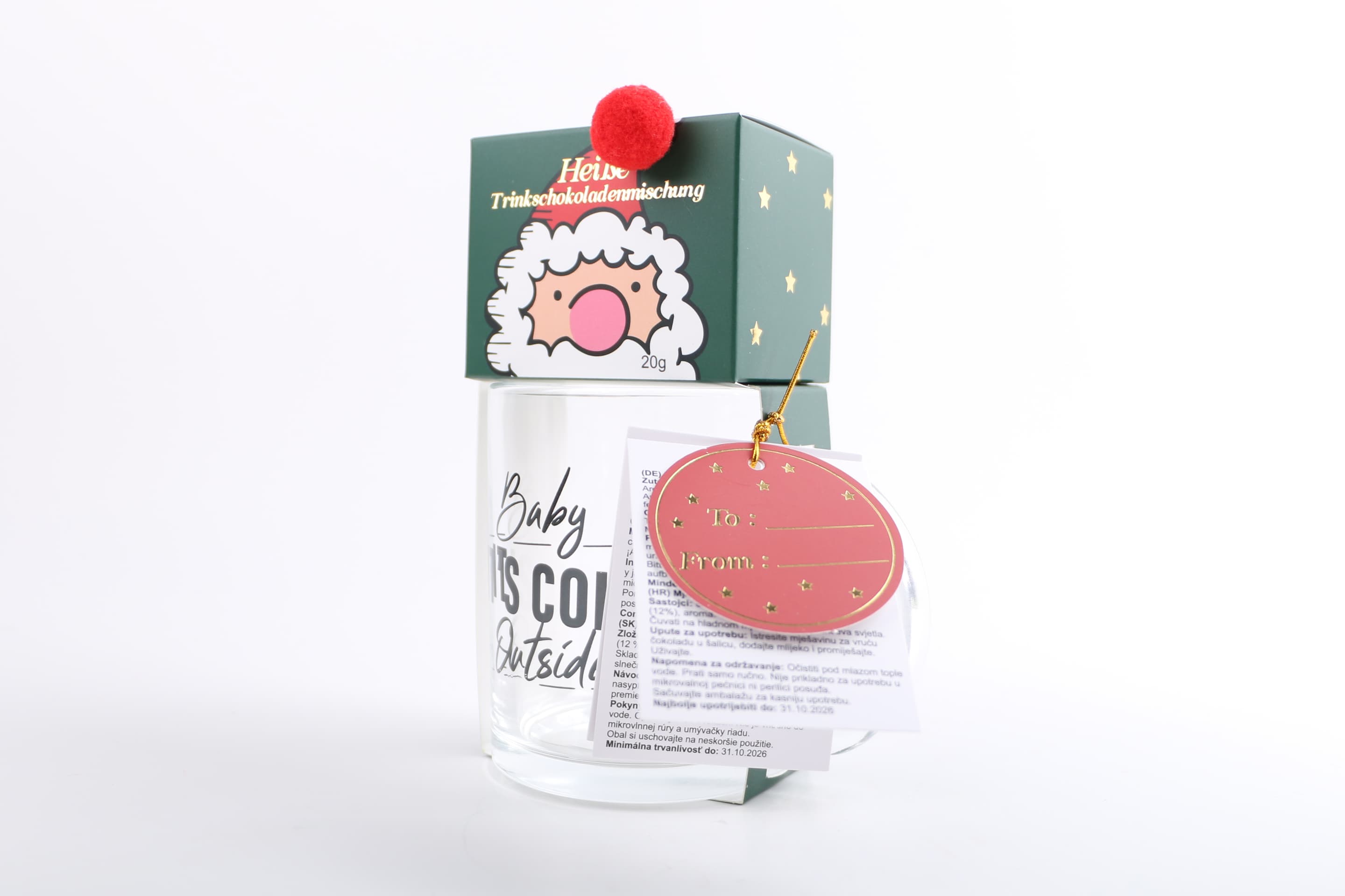 Geschenk-Set Glasbecher SANTA mit heißer Trinkschokoladenmischung.