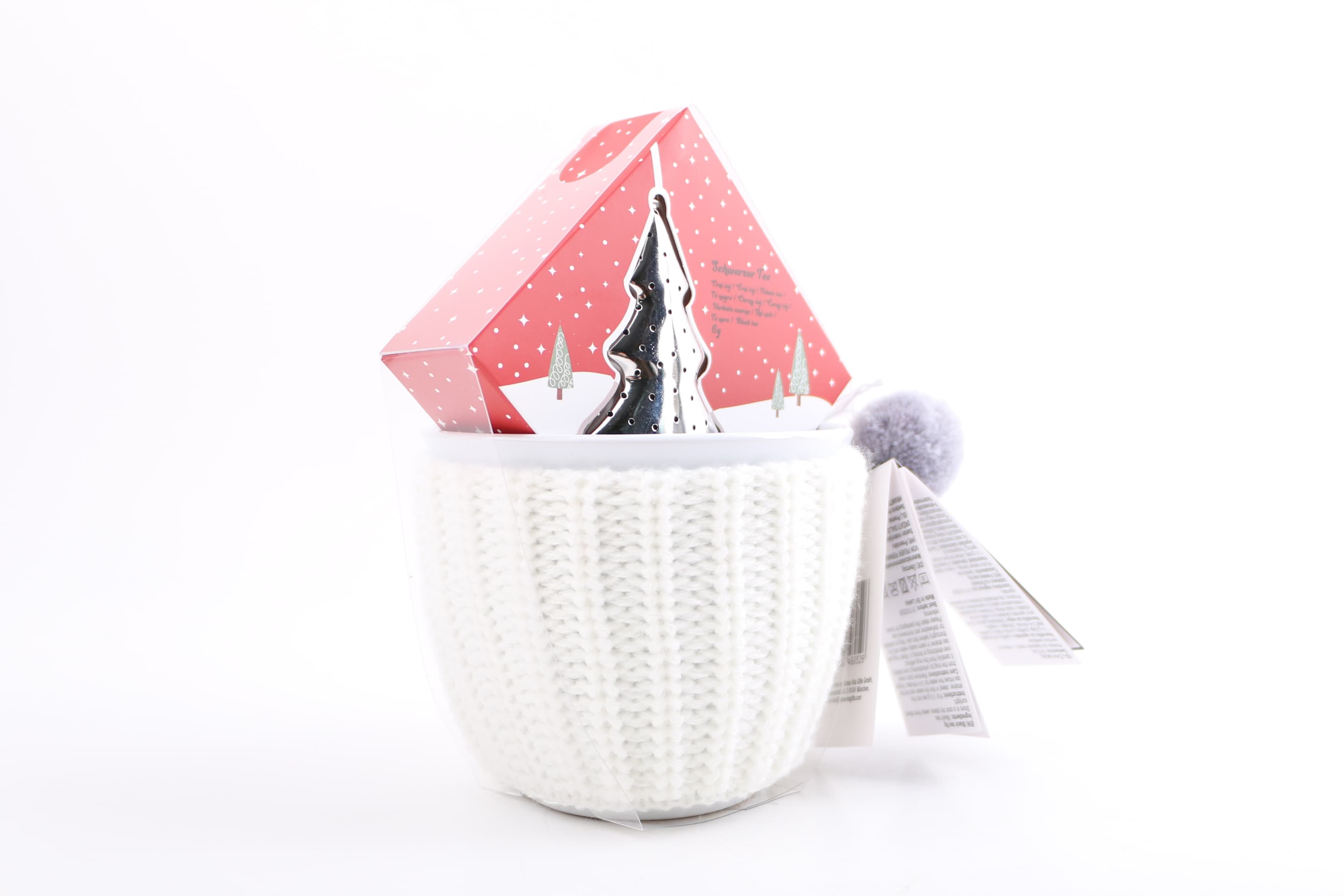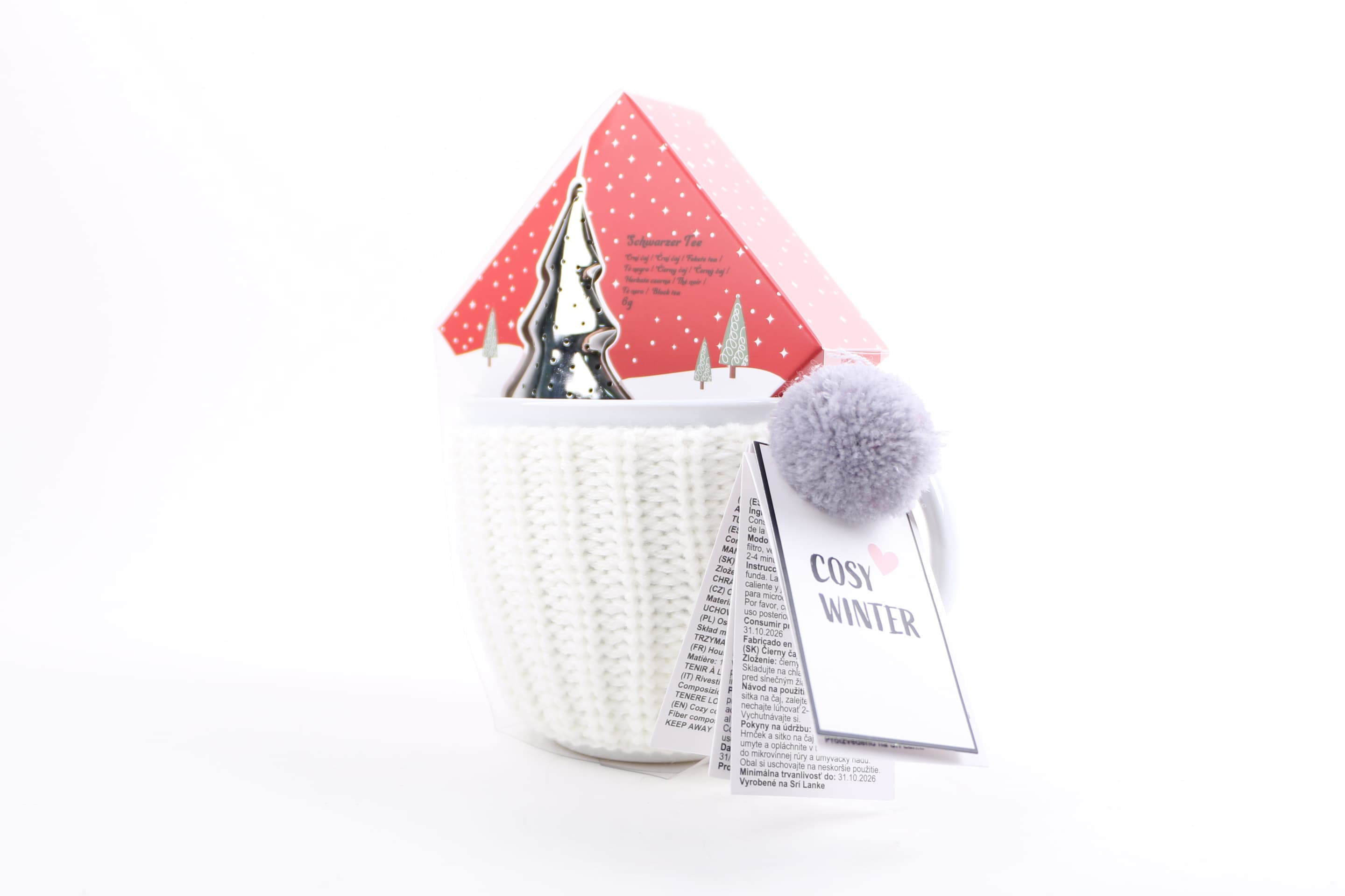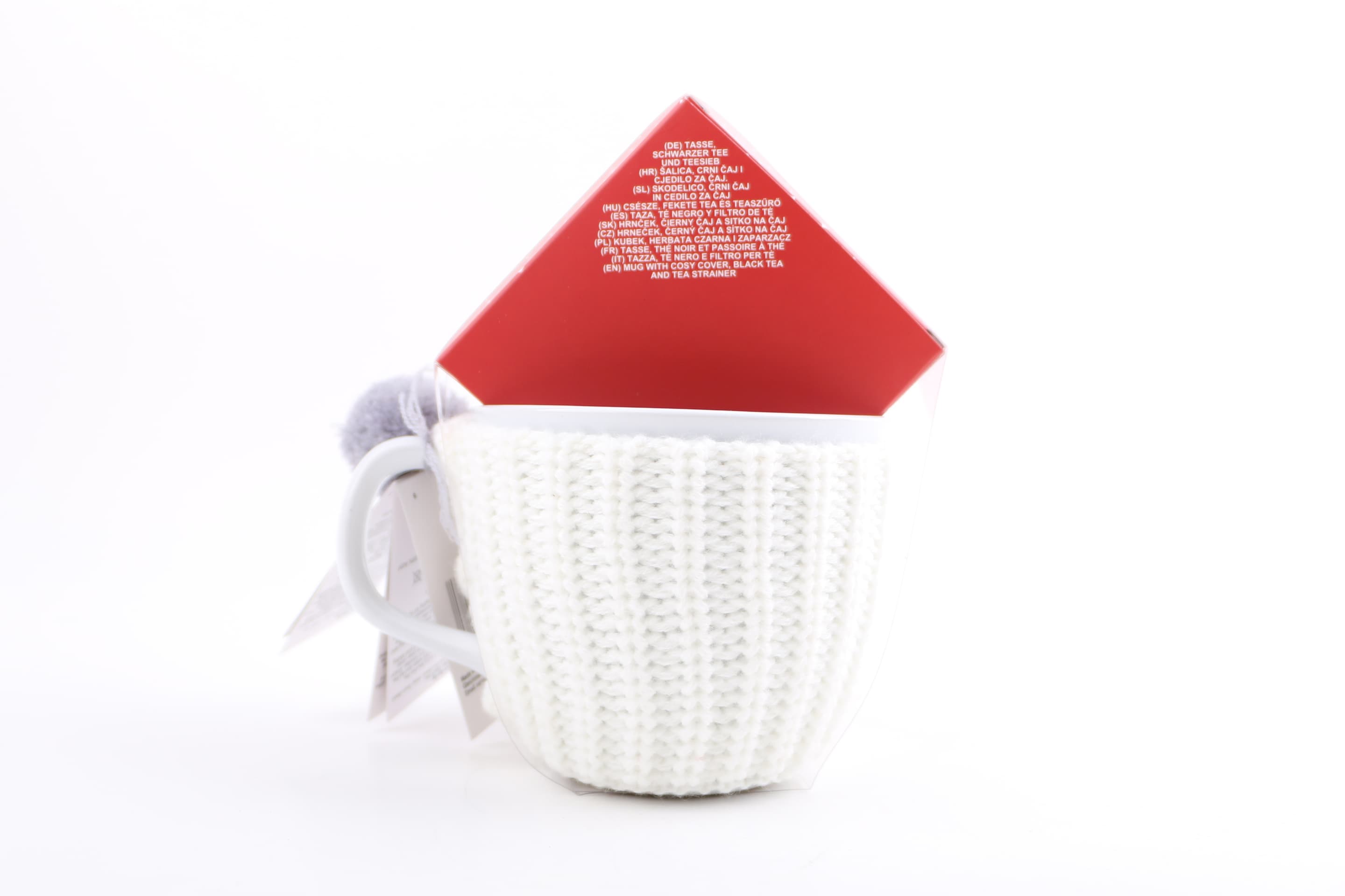 Geschenk-Set Tasse mit Stricküberzug, Teesieb Tannenbaum und Schwarzem Tee.