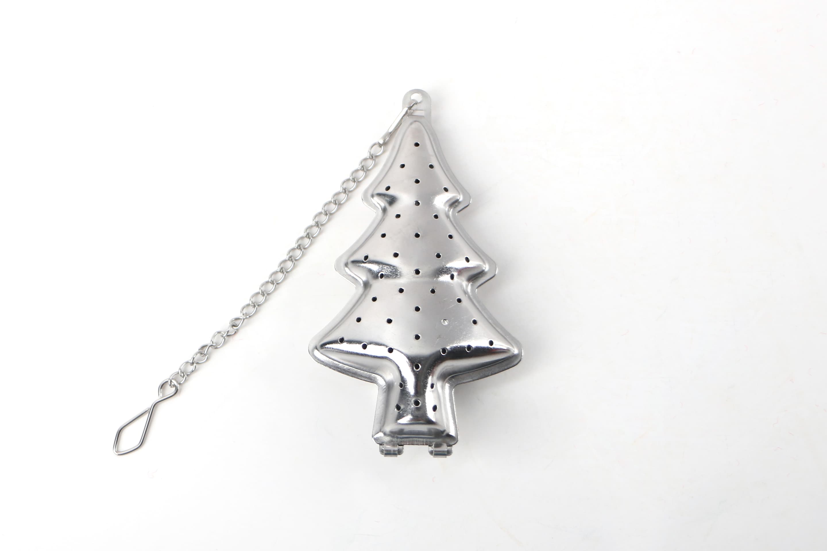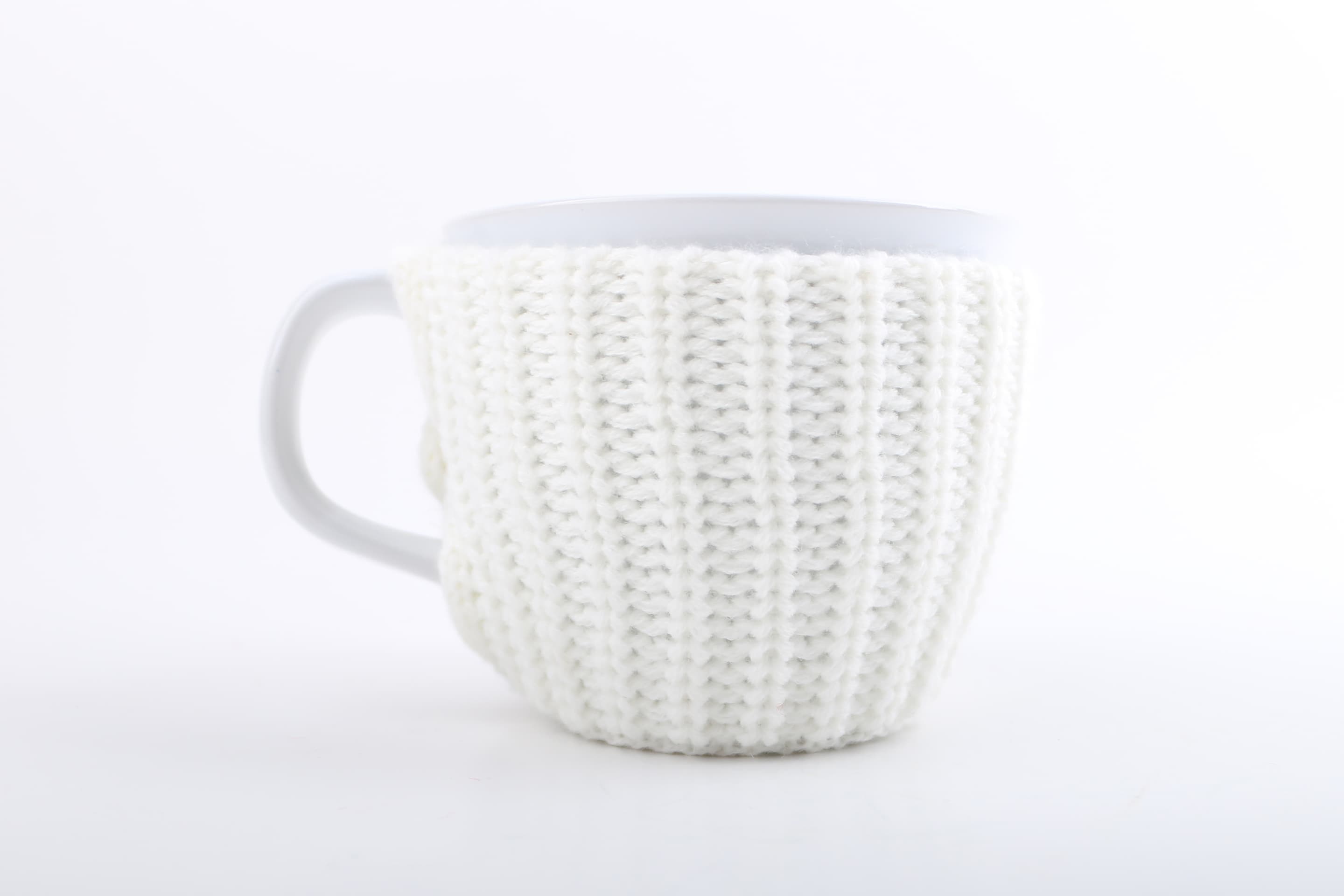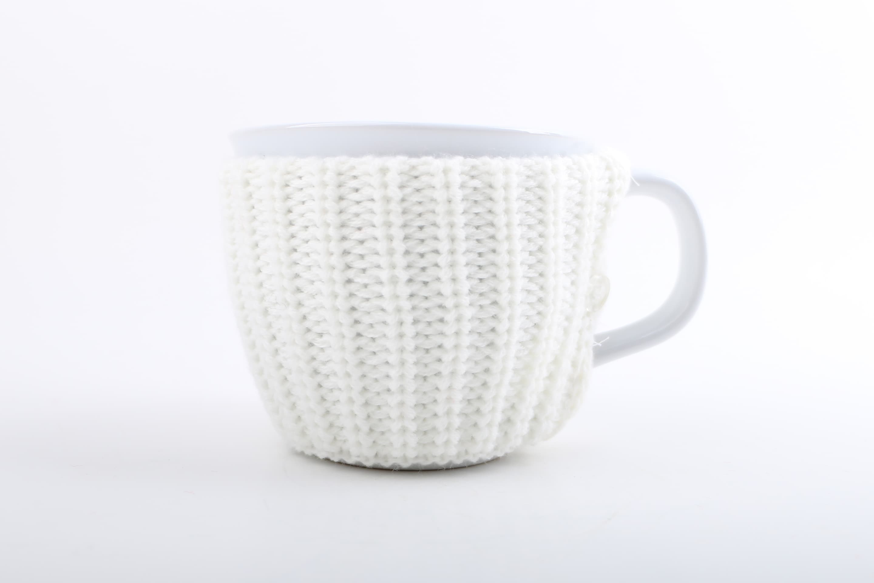 Geschenk-Set Tasse mit Stricküberzug, Teesieb Tannenbaum und Schwarzem Tee.