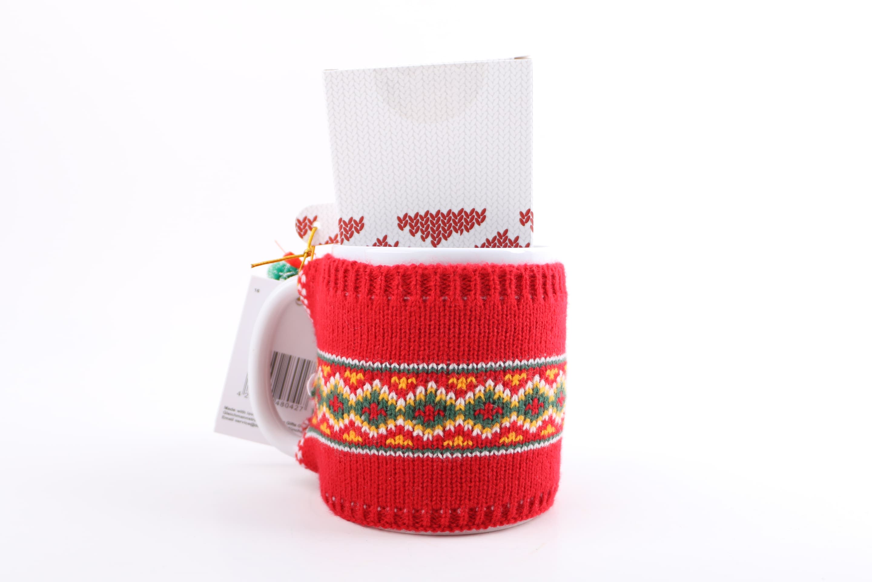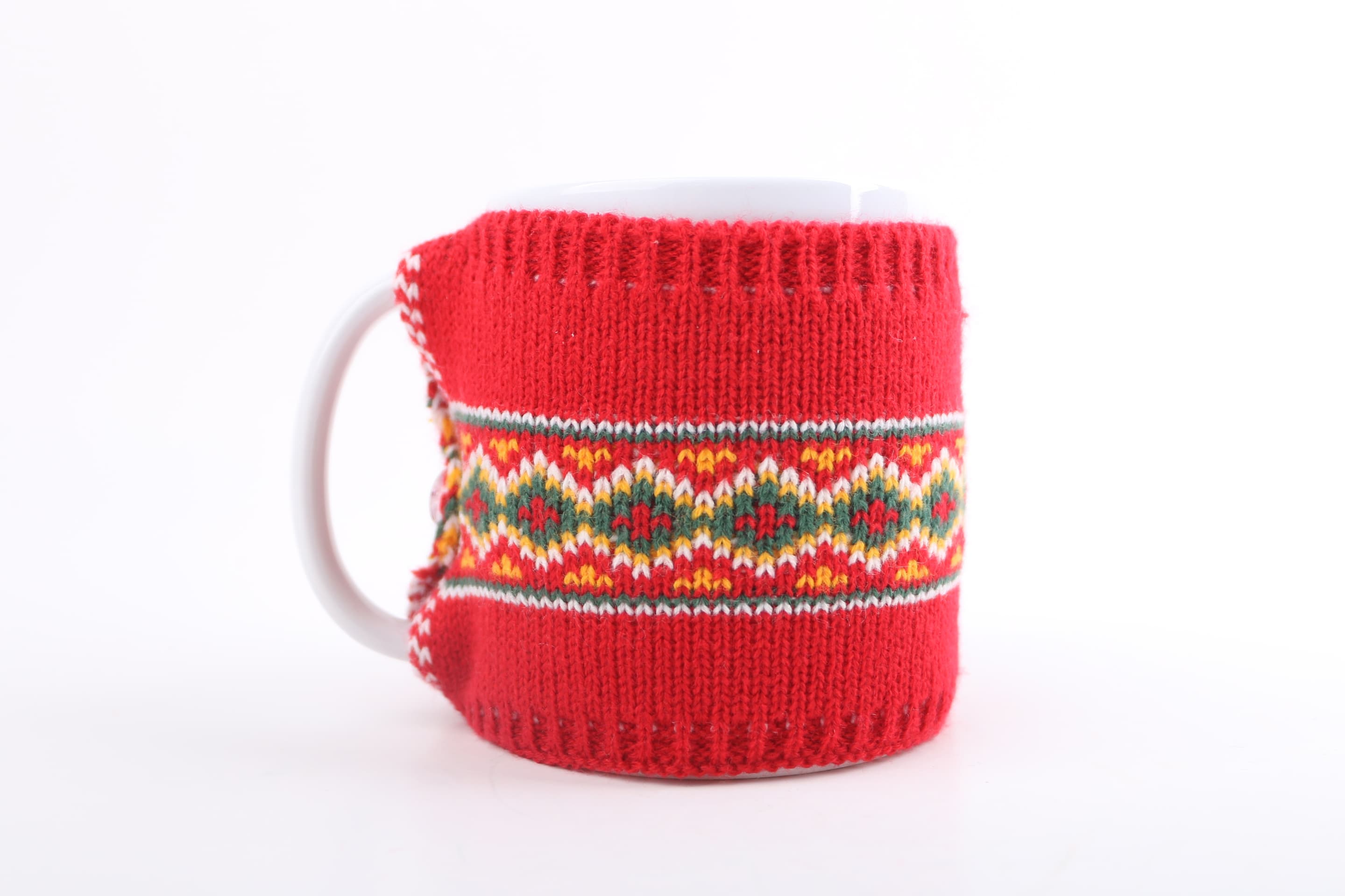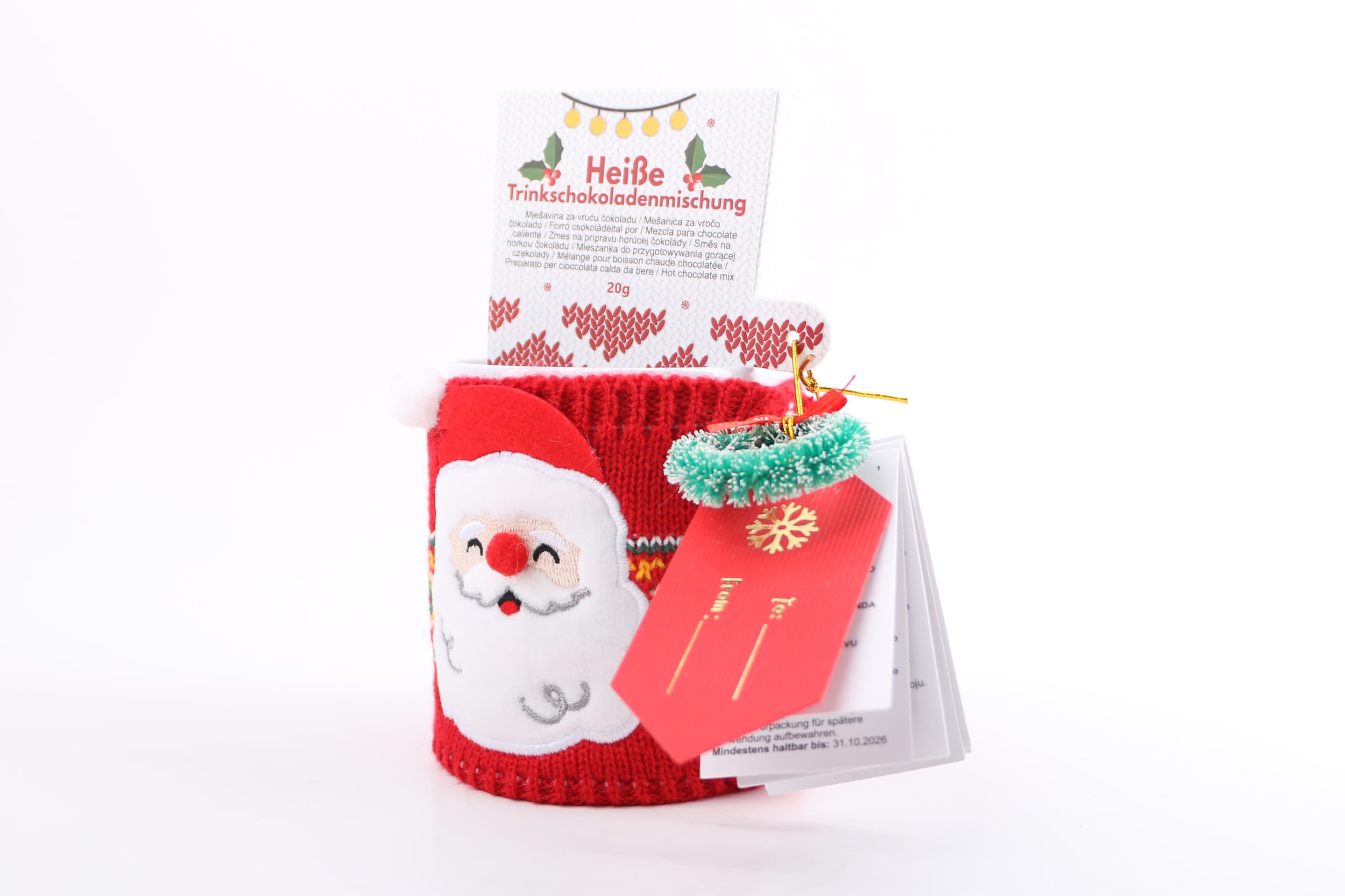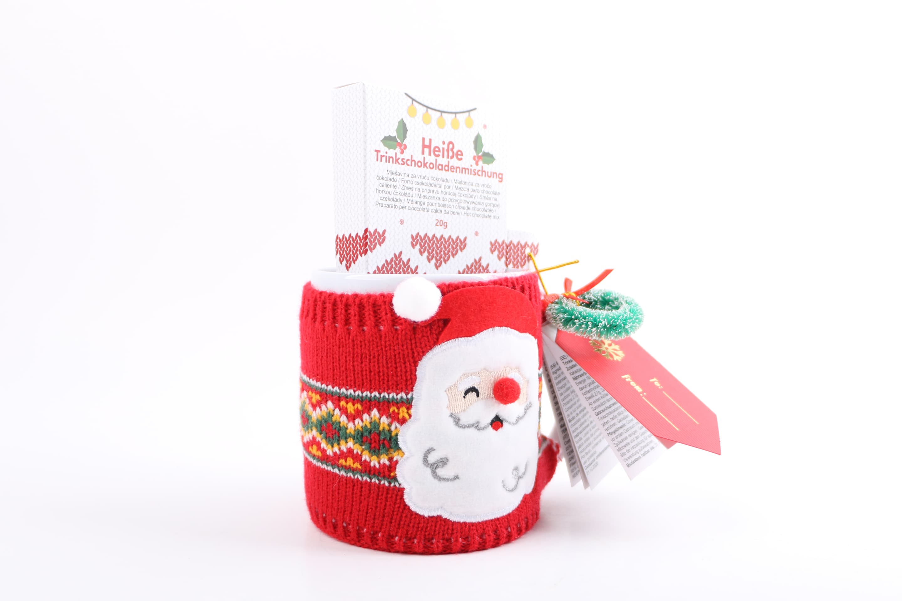 Geschenk Set Tasse mit Stricküberzug & Heißer Trinkschokoladenmischung.