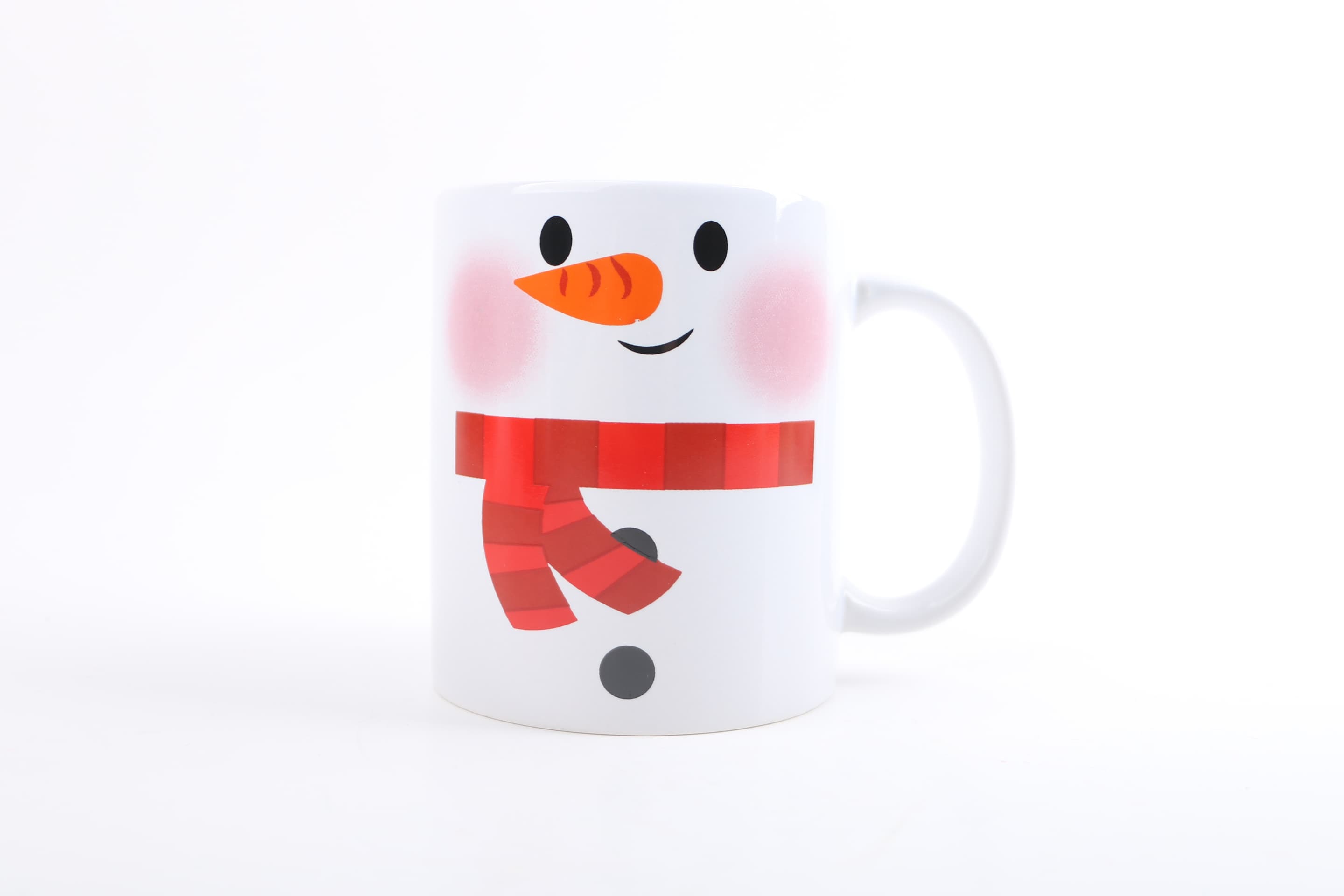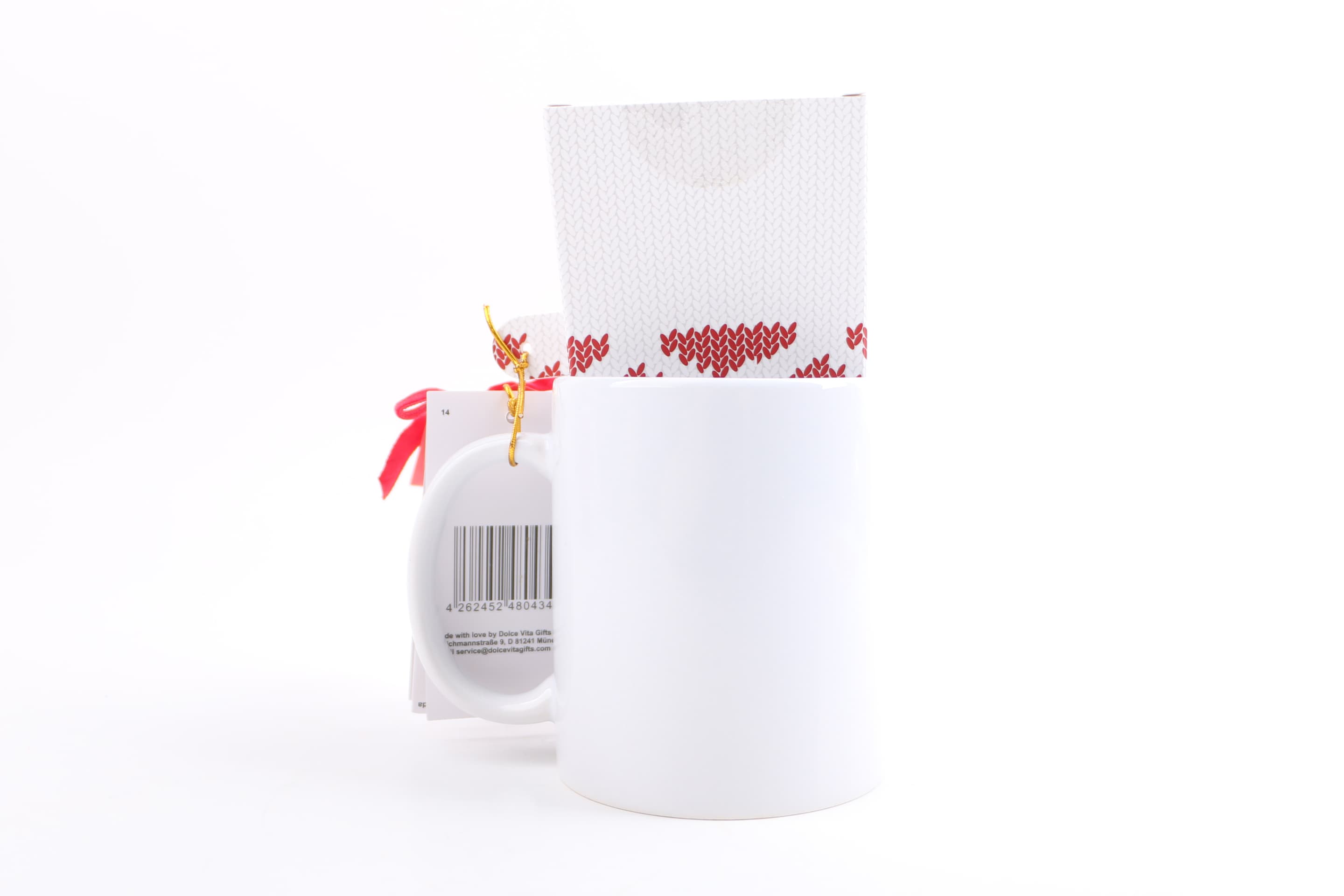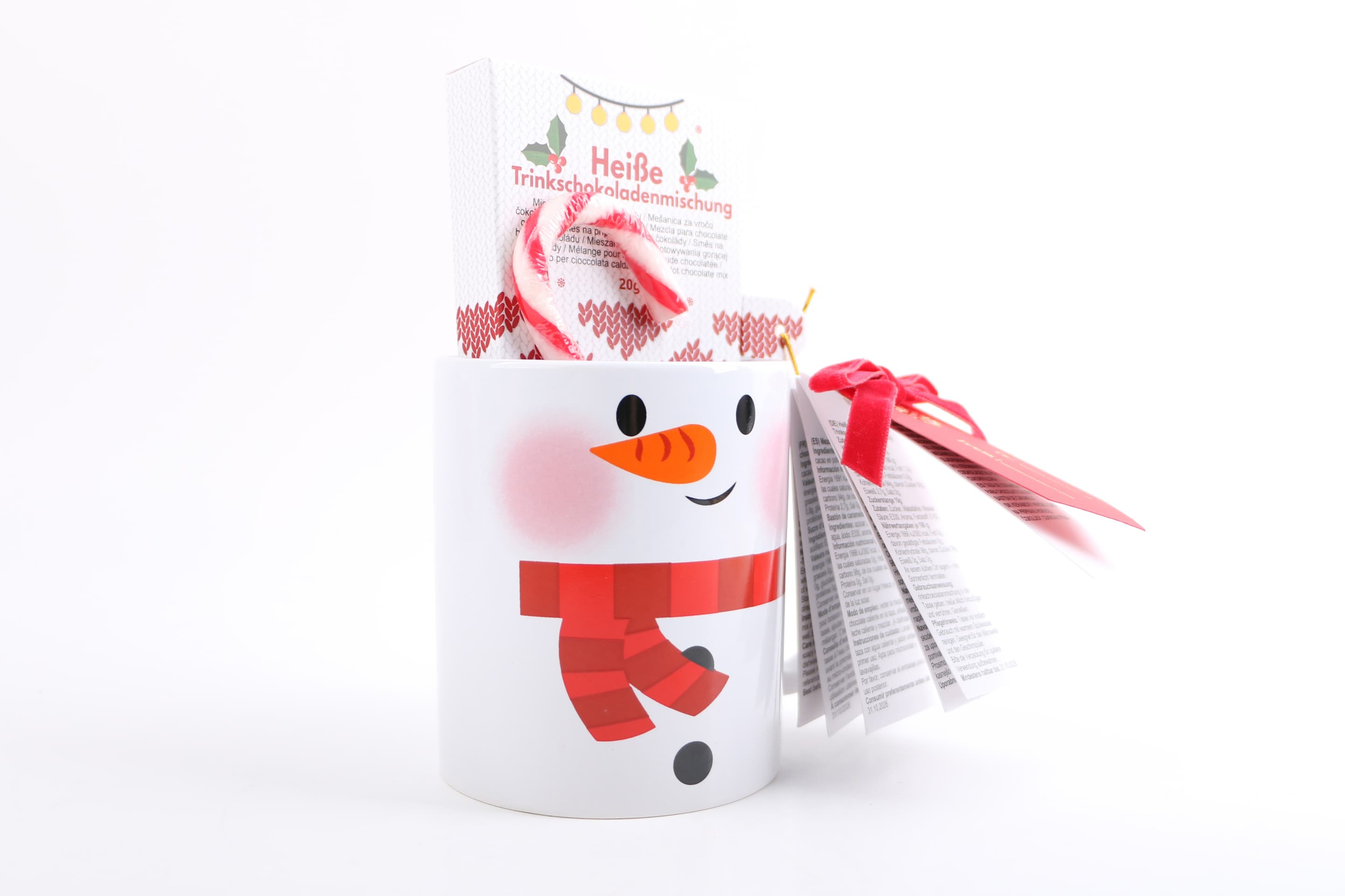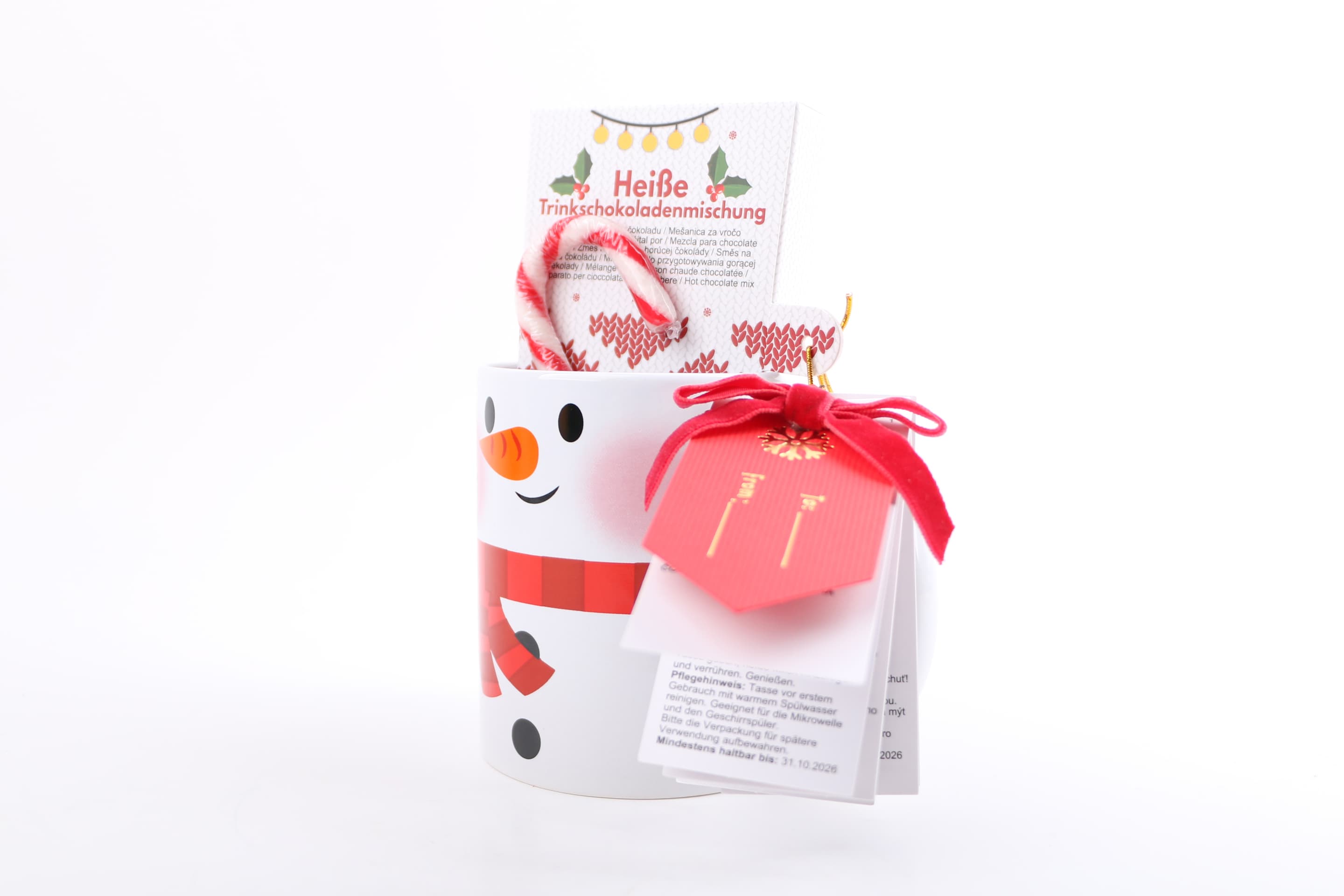 Geschenk-Set Tasse Schneemann und Heißer Trinkschokoladenmischung.
