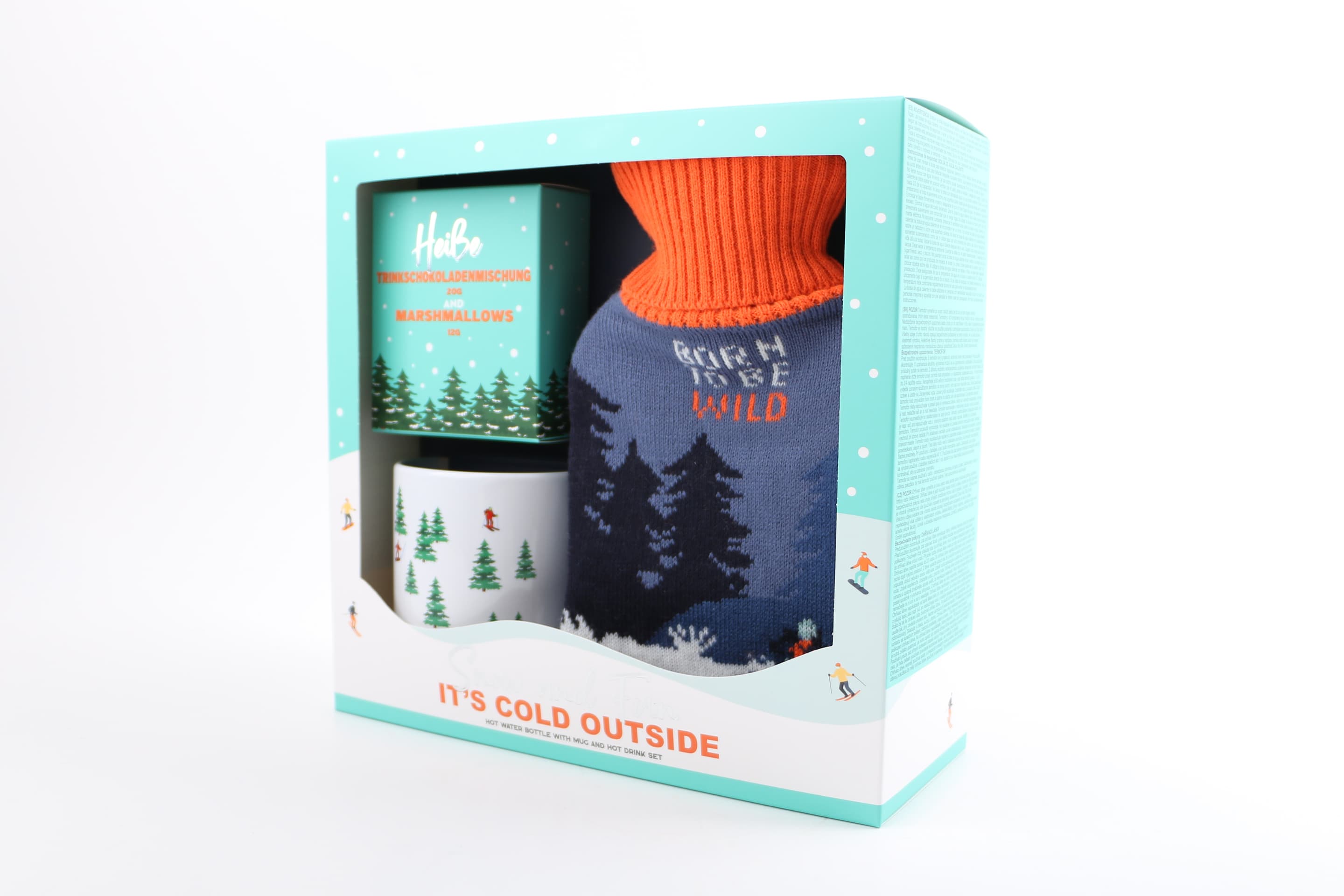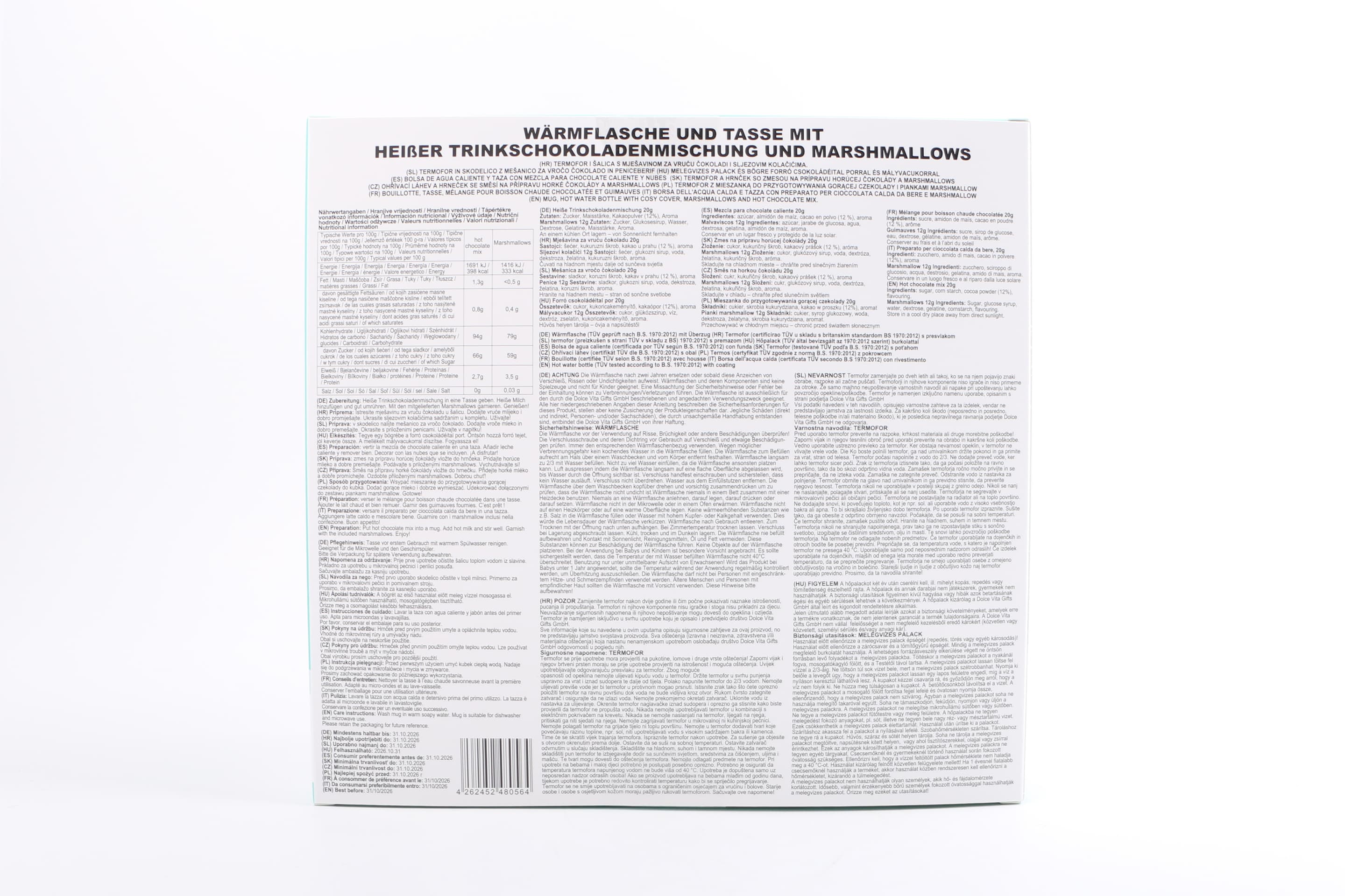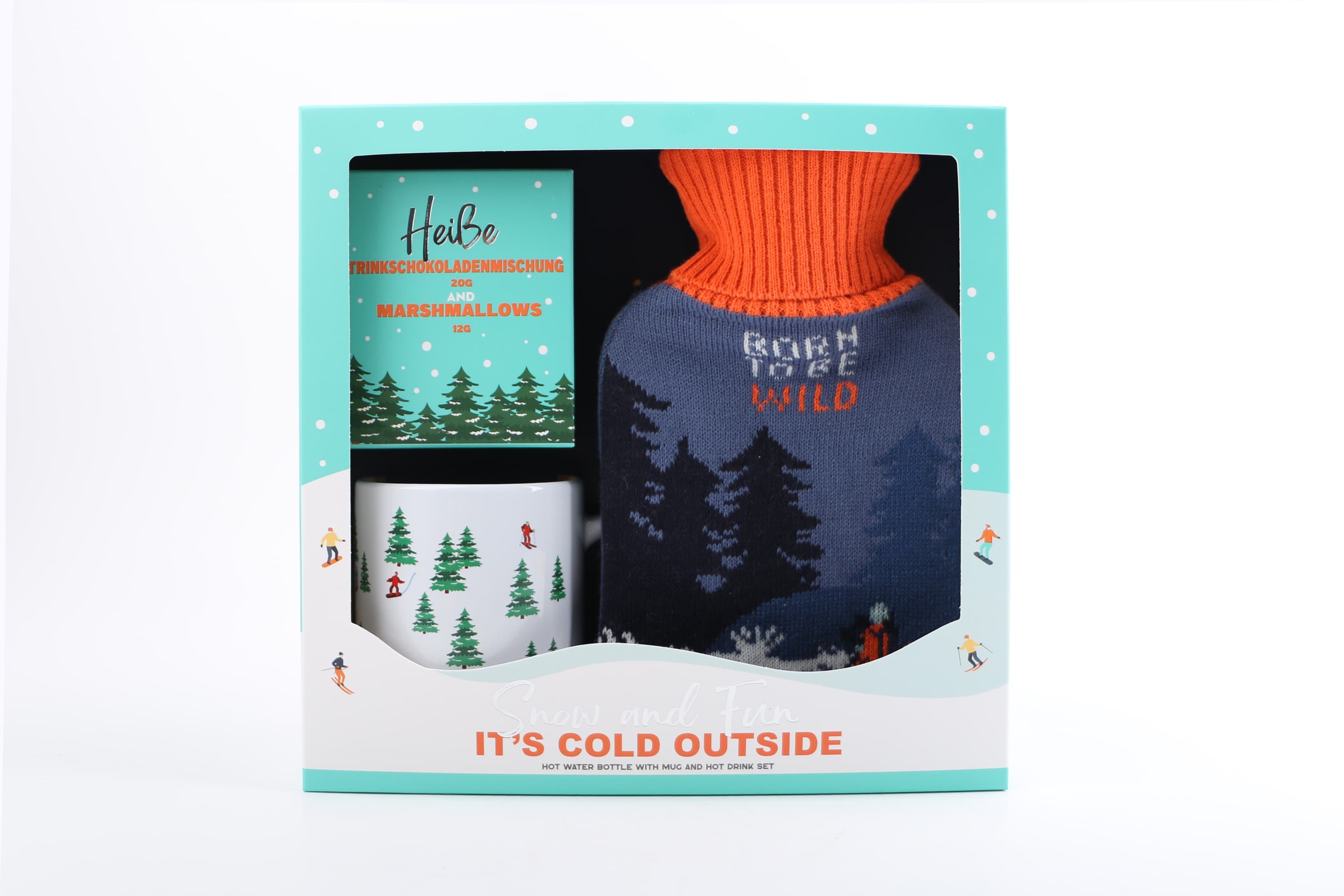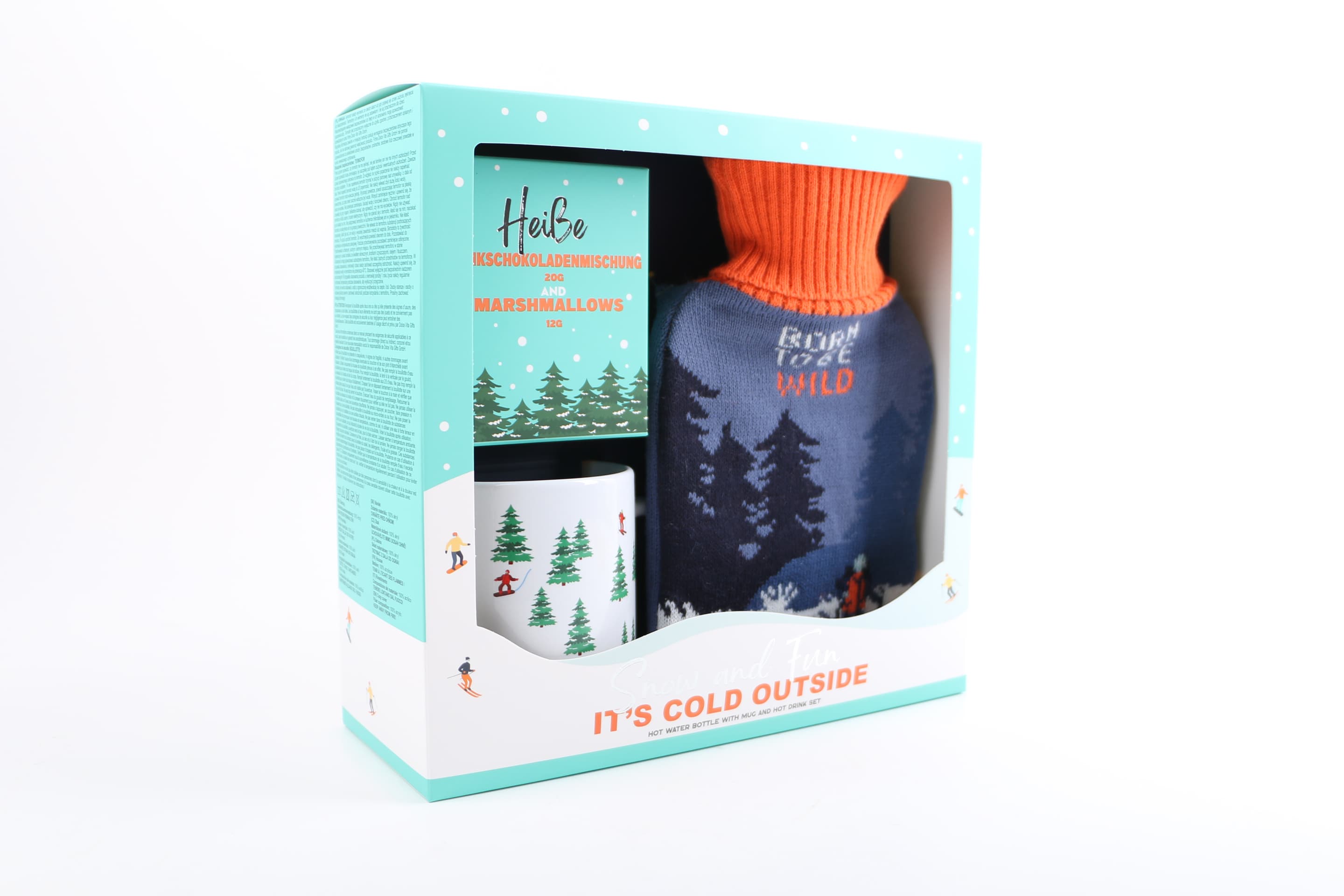 Geschenk-Set Wärmflasche mit Überzug, Tasse, Heißer Trinkschokoladenmischung und Marshmallows.