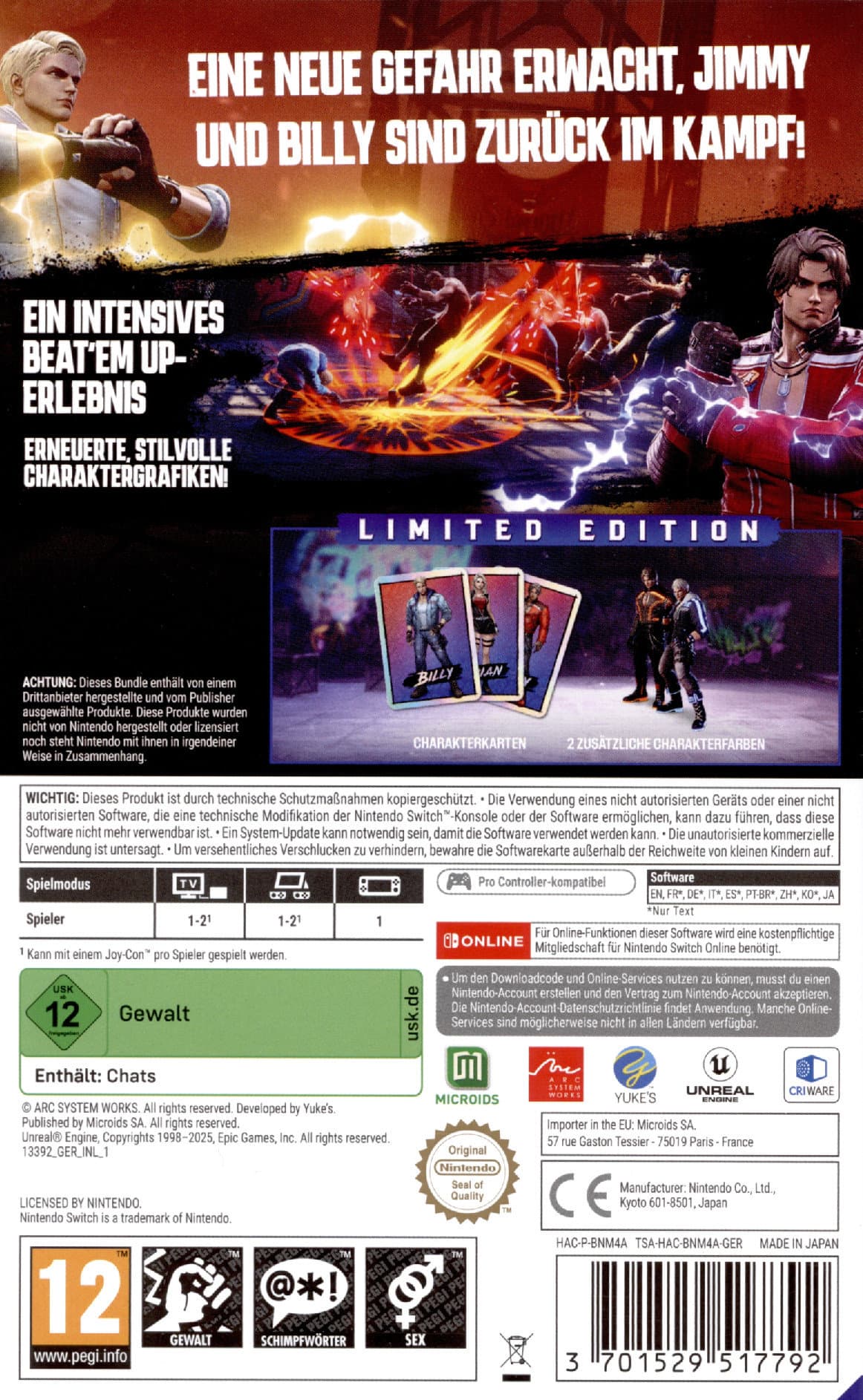 Die Double Dragon-Reihe hat das Genre der Beat-Em-Up-Action seit ihrem Erscheinen in den Spielhallen 1987 geprägt. Jetzt kehrt sie als Double Dragon Revive zurück, dank der leidenschaftlichen Unterstützung von Retro-Spiel-Fans über Jahrzehnte hinweg! Spielefeatures: • Erneuerte, stilvolle Charaktere! • Erlebe deine Lieblingsfiguren aus dem goldenen Zeitalter der Spielhallen in moderner 3D-Grafik. Mächtige Feinde aus der Vergangenheit kehren zurück, um gegen die Lee-Brüder anzutreten. Das ultimative Beat-Em-Up-Action-Erlebnis! Der Spieler bewegt sich horizontal über den Bildschirm, um seine Feinde in diesem beliebten Genre auszuschalten. Erlebe das gleiche einfache und intuitive Gameplay, mit einer für die moderne Zeit verfeinerten Steuerung und Balance. Das sorgfältig ausgearbeitete Erlebnis, das von Mitarbeitern mit Erfahrung mit Arc System Works-Kampfspieltiteln betreut wird, macht es neuen Spielern leicht, sich sofort in das Spiel zu vertiefen. Spannende, strategische Action! Der Kampf erfordert Anpassungsfähigkeit und Abwechslung, mehr als ein einfacher Button-Masher. Erforsche die Strategie, indem du die Muster der Feinde lernst und das effektivste Angriffs-Timing findest. Sammle die in den Levels verstreuten Waffen ein und nutze die Gimmicks der Umgebung, um im Kampf die Oberhand zu gewinnen! Die Limited Edition enthält zusätzlich zum physischen Spiel: 3 Charakterkarten, 2 zusätzliche Charakterfarben (kostenloser DLC bei Neukauf enthalten, einmalig verwendbar)