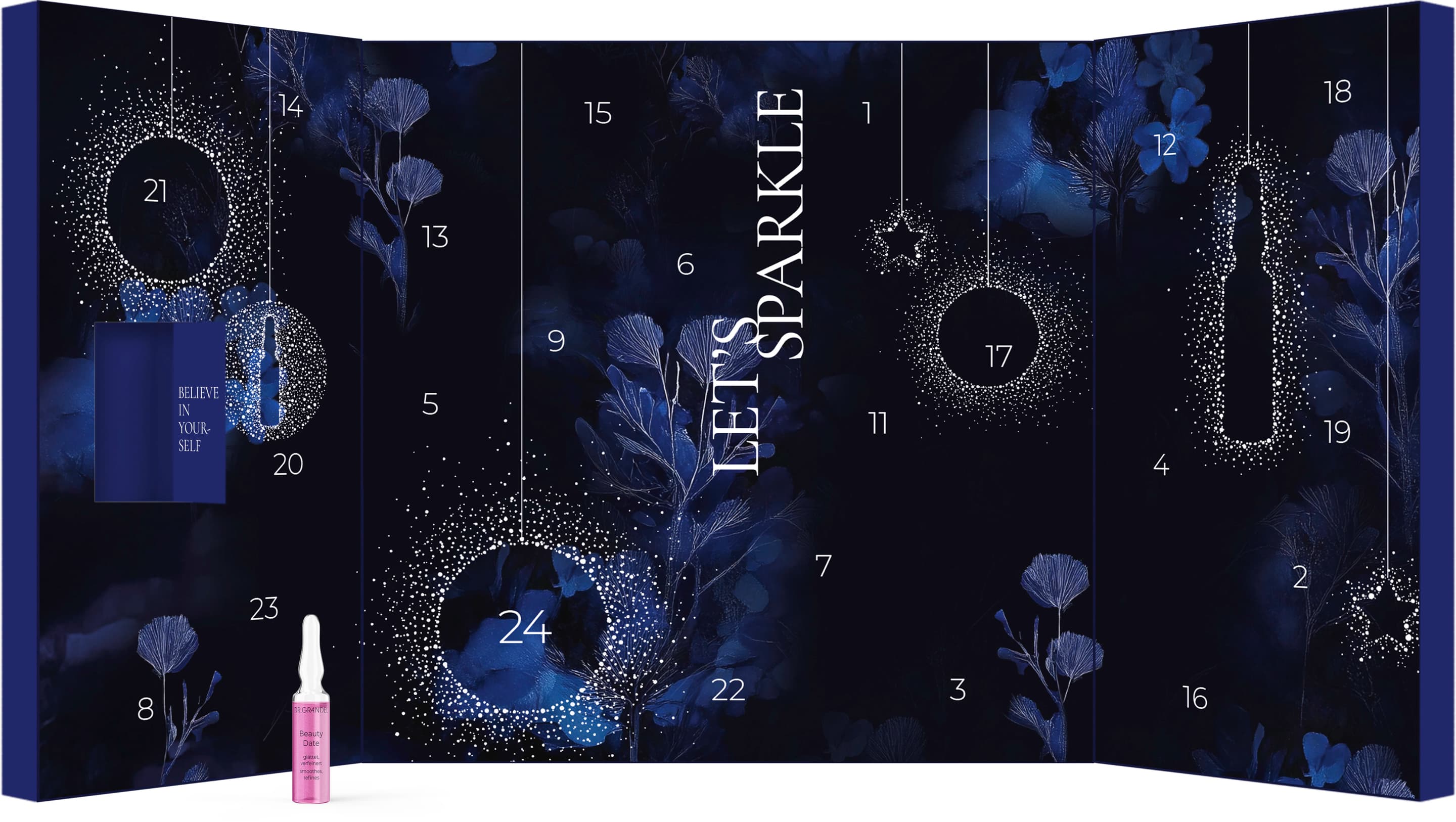 25 Wirkstoffampullen fürs Gesicht im Adventskalender. 24 Türchen mit kostbaren Ampullen. Besondere Texturen in Glasphiolen. Eine Minibar zum Aufstellen der Beauty Stars. Täglich ein motivierender Spruch. Besondere Texturen, wertvollste Ingredienzien und eine prächtige Farbvielfalt sorgen für unvergessliche Verwöhnmomente. Hinter den 24 Türchen des Adventskalenders verstecken sich zauberhafte Beauty Stars, die die Haut erstrahlen lassen.