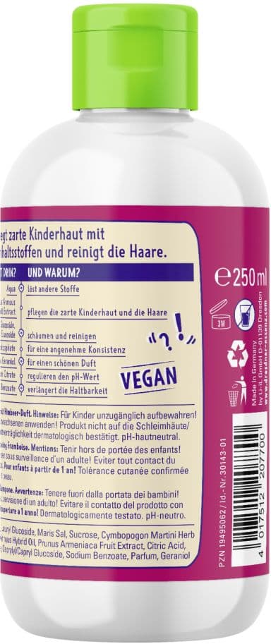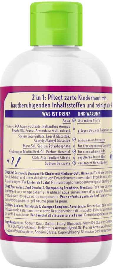 Das 2in1 Duschgel & Shampoo für Kinder FREU DICH mit dem fröhlichen Gute-Laune-Duft nach Himbeere bringt mehr Spaß ins Badezimmer. Es reinigt die Haare sanft ohne Tränen oder Ziepen und macht das Duschen und Haarewaschen zu einem freudigen Erlebnis. Die milden Tenside sorgen für eine besonders schonende Reinigung von Haut und Haar, sodass sich dein Kind rundum wohlfühlt. Perfekt für ein fröhliches und sanftes Duscherlebnis.