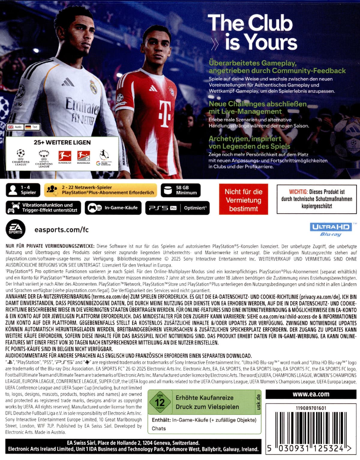 Erlebe beispiellose Authentizität in EA SPORTS FC™ 26, mit über 20.000 Profis in mehr als 750 Clubs und Nationalmannschaften, in über 120 Stadien und mehr als 35 Ligen. EA SPORTS FC™ 26 ist der einzige Ort, an dem du die legendäre UEFA Champions League, UEFA Europa League, UEFA Europa Conference League, CONMEBOL Libertadores, Premier League, Bundesliga und LALIGA EA SPORTS im selben Spiel spielen kannst, sowie die Google Pixel Frauen-Bundesliga, Liga F Moeve, Barclays Women's Super League, Arkema Premiere Ligue, National Women's Soccer League und die UEFA Women's Champions League.
