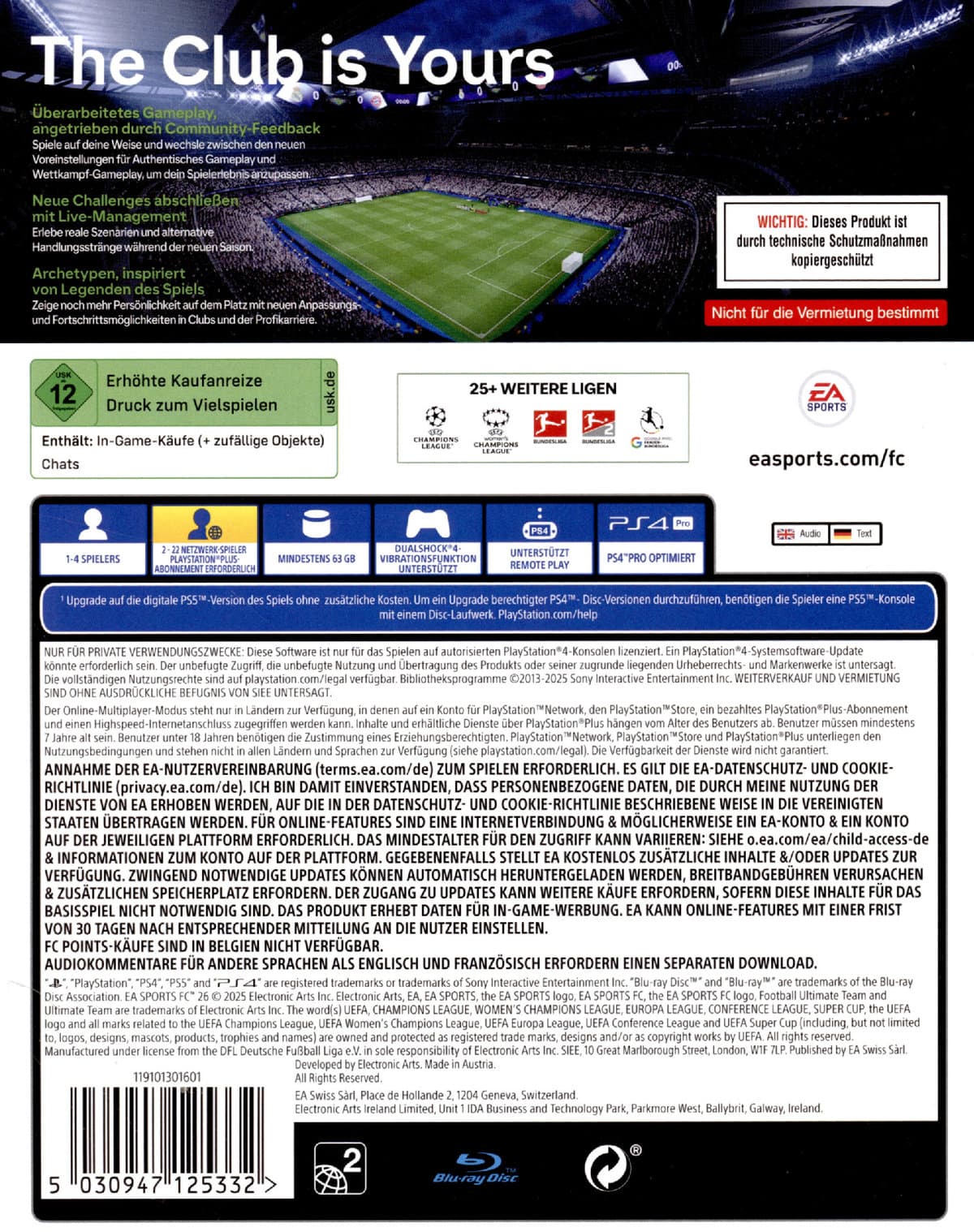 Erlebe beispiellose Authentizität in EA SPORTS FC™ 26, mit über 20.000 Profis in mehr als 750 Clubs und Nationalmannschaften, in über 120 Stadien und mehr als 35 Ligen. EA SPORTS FC™ 26 ist der einzige Ort, an dem du die legendäre UEFA Champions League, UEFA Europa League, UEFA Europa Conference League, CONMEBOL Libertadores, Premier League, Bundesliga und LALIGA EA SPORTS im selben Spiel spielen kannst, sowie die Google Pixel Frauen-Bundesliga, Liga F Moeve, Barclays Women's Super League, Arkema Premiere Ligue, National Women's Soccer League und die UEFA Women's Champions League.