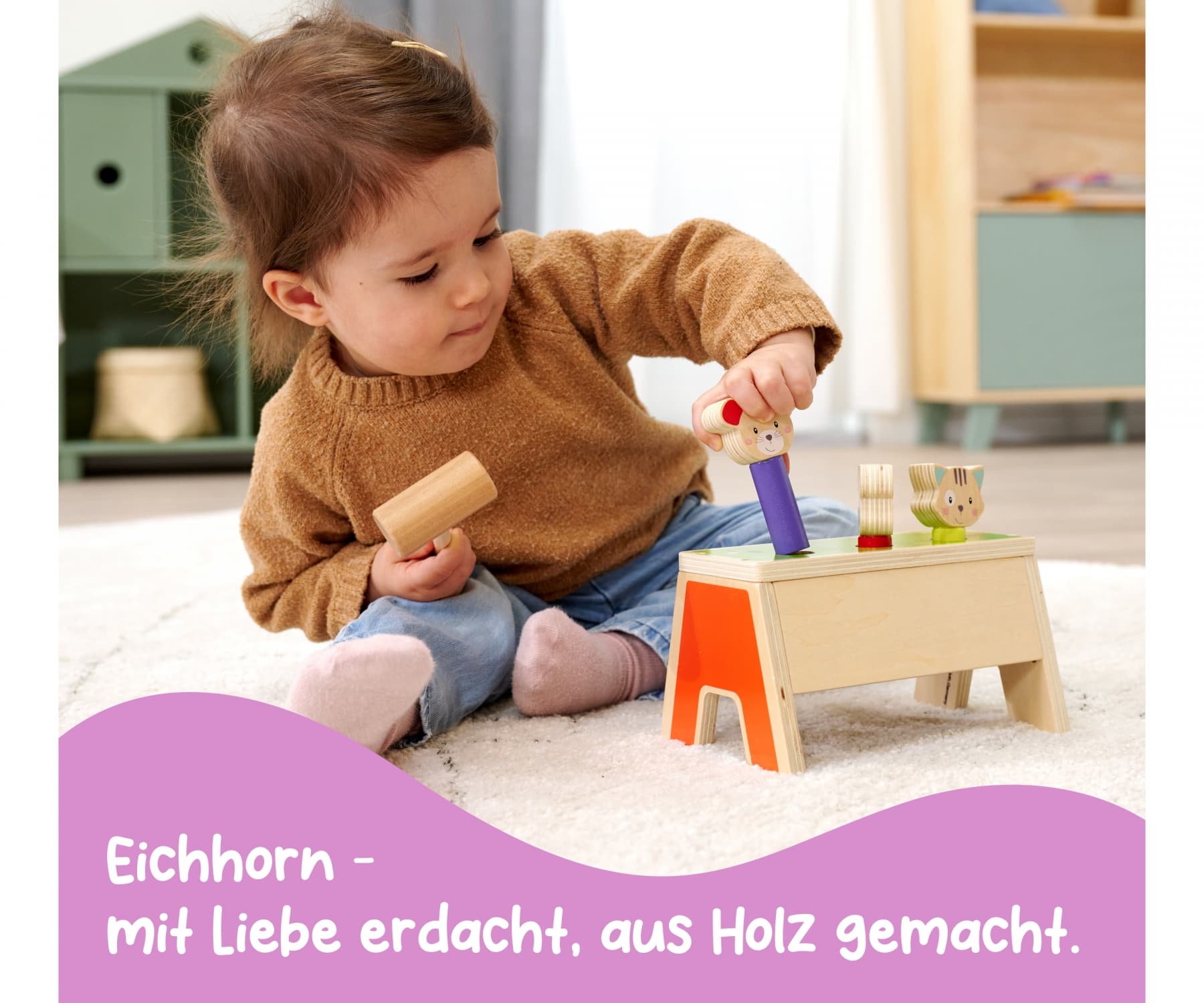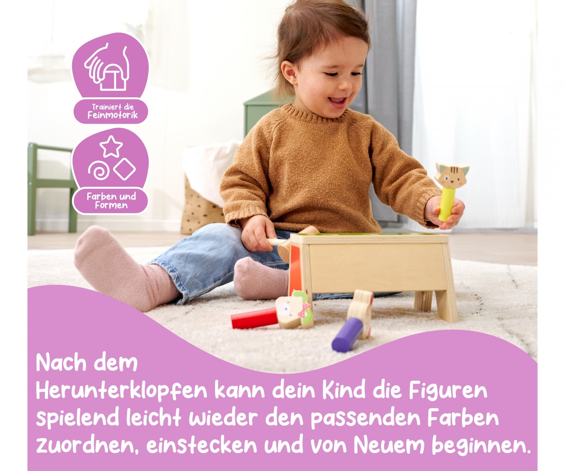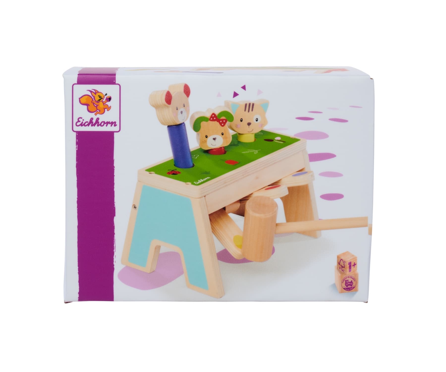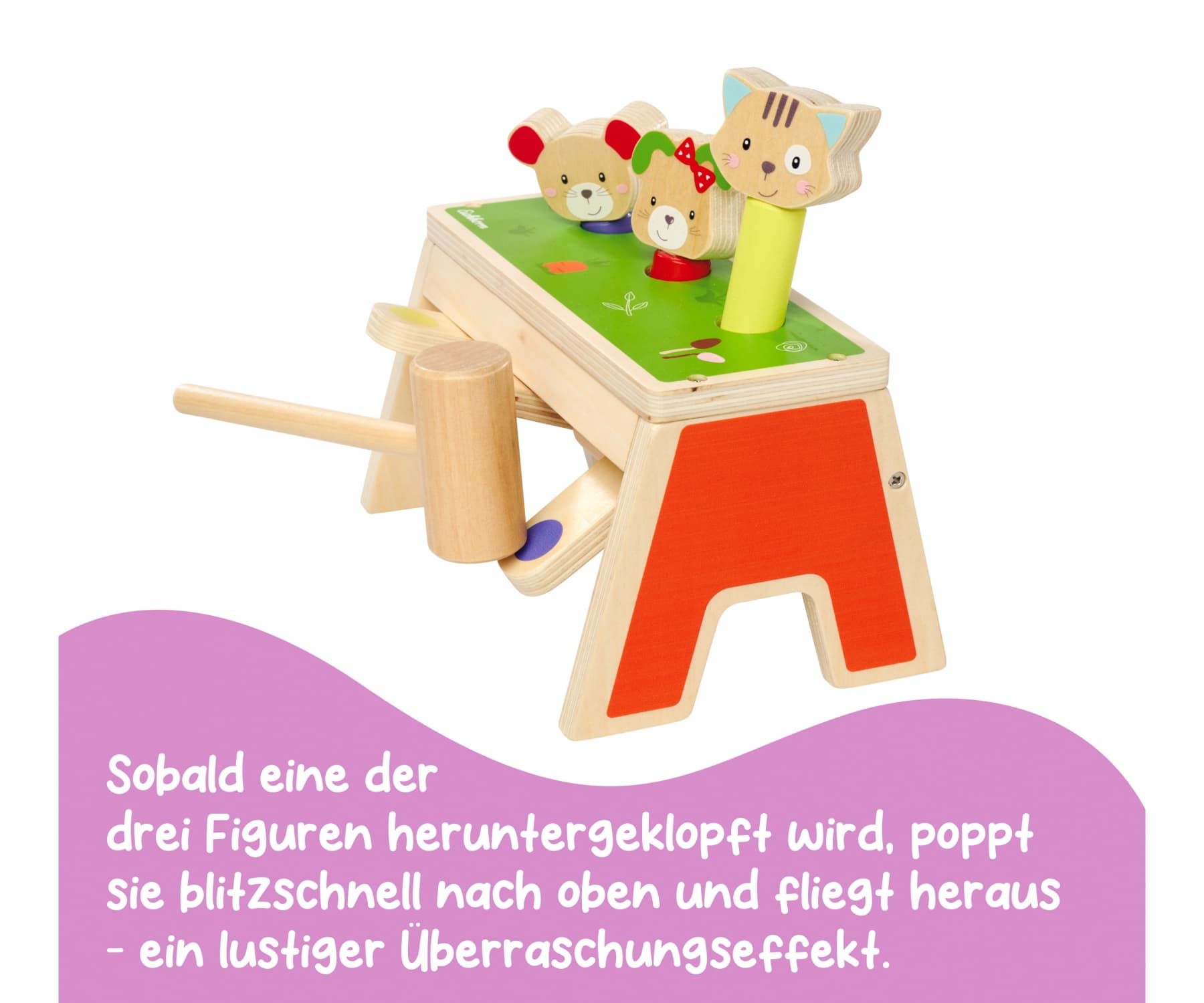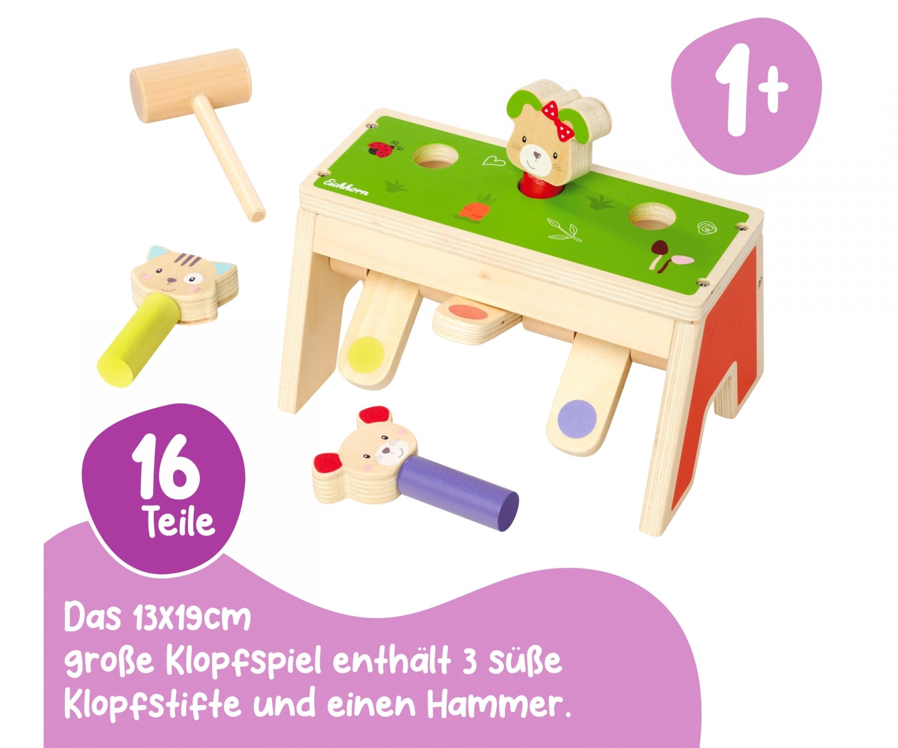Entdecke das fröhliche Klopfspiel von Eichhorn aus der Friends Linie – das perfekte Spielzeug für kleine Entdecker ab 1 Jahr! Mit den drei bunten Spielflächen und einem Holzhammer bringt dieses Spiel stundenlangen Spaß und fördert gleichzeitig die Feinmotorik sowie die Auge-Hand-Koordination deines Kindes. Sobald eine der drei Figuren heruntergeklopft wird, poppt sie blitzschnell nach oben und fliegt heraus – ein lustiger Überraschungseffekt, der immer wieder für Begeisterung sorgt! Nach dem Herunterklopfen kann dein Kind die Figuren spielend leicht wieder den passenden Farben zuordnen, einstecken und von Neuem beginnen. Das Eichhorn Klopfspiel besteht zu 100 % aus FSC-zertifiziertem Holz und steht für höchste Qualität und Nachhaltigkeit. Lass dein Kind die Welt des Klopfens und Entdeckens erleben – mit dem Friends Klopfspiel von Eichhorn!