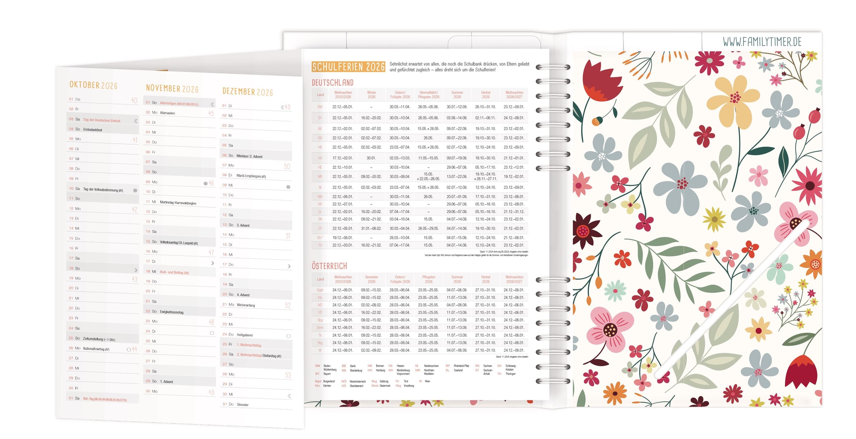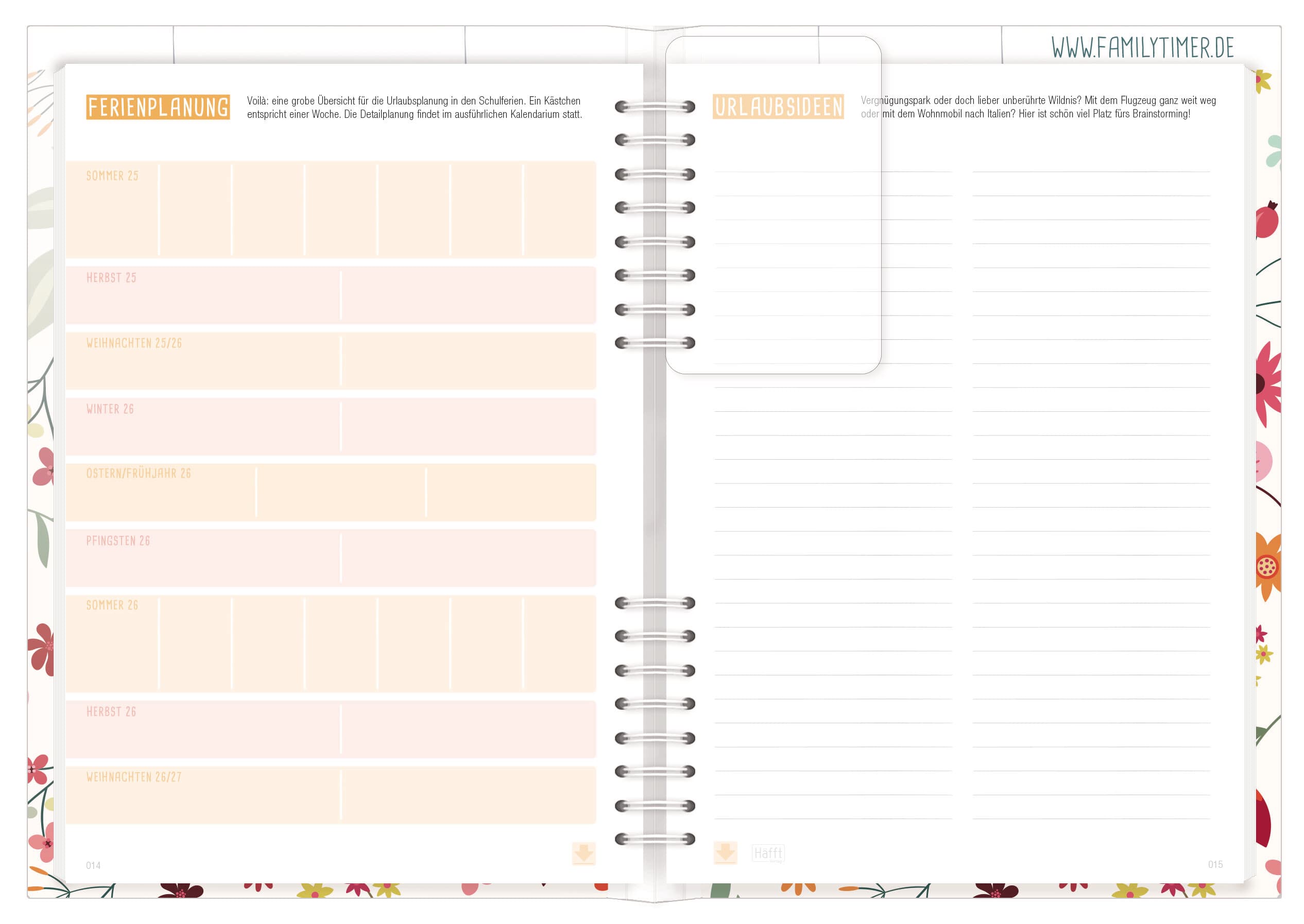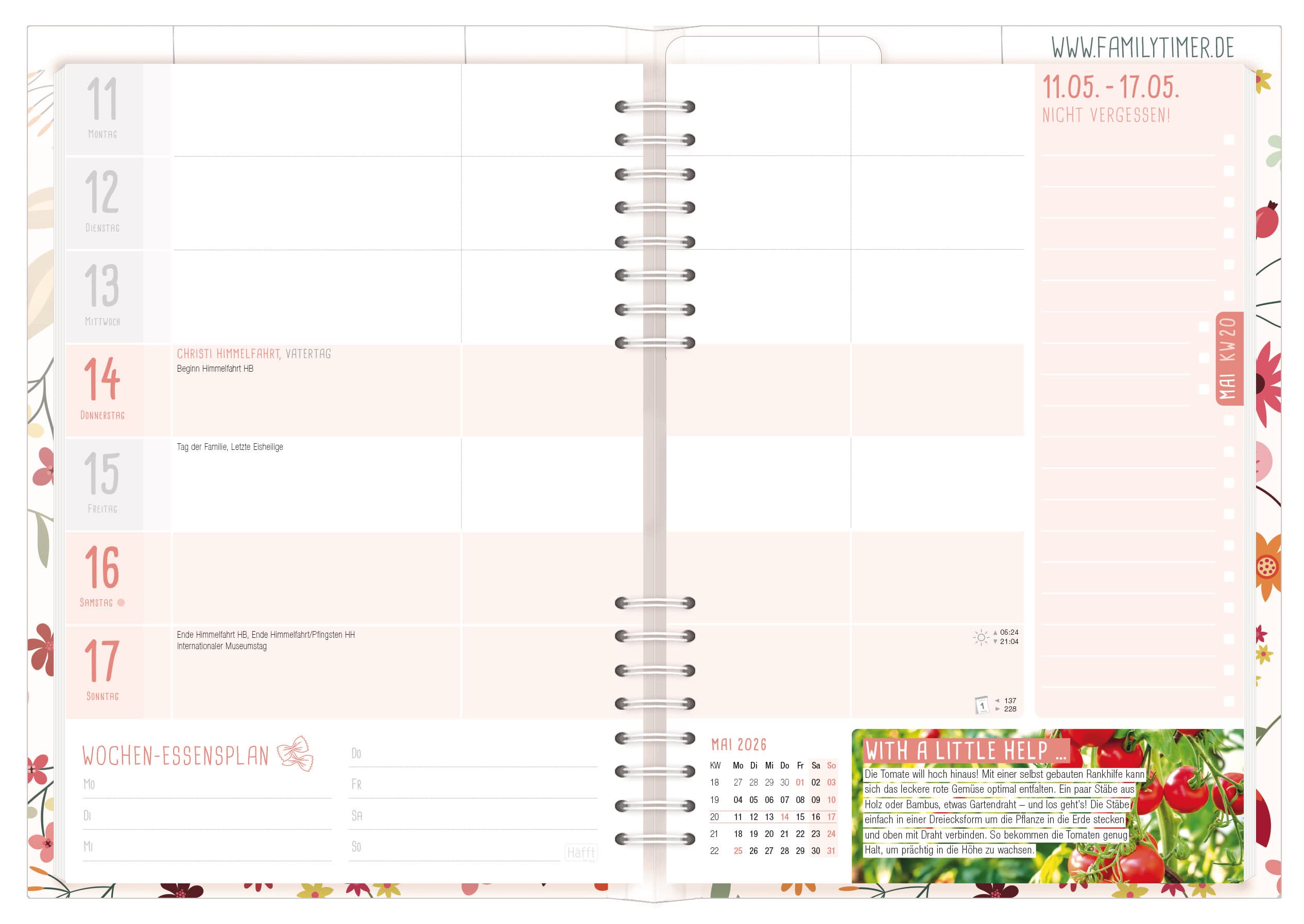 Familienkalender für bis zu vier Familienmitglieder, 12 Monate, Laufzeit Januar bis Dezember, immer eine Woche auf einer Doppelseite, mit vertikalen Spalten für die Familienmitglieder und vielen hilfreichen Extras wie Wochen-To-do-Listen, Monatsvorschauseiten, Haushalts- und Urlaubsplanung, Kochplan und vielem mehr, Format A5+, teilverdeckte Wire-O-Bindung, Leporello, Lesezeichen und Einstecktasche