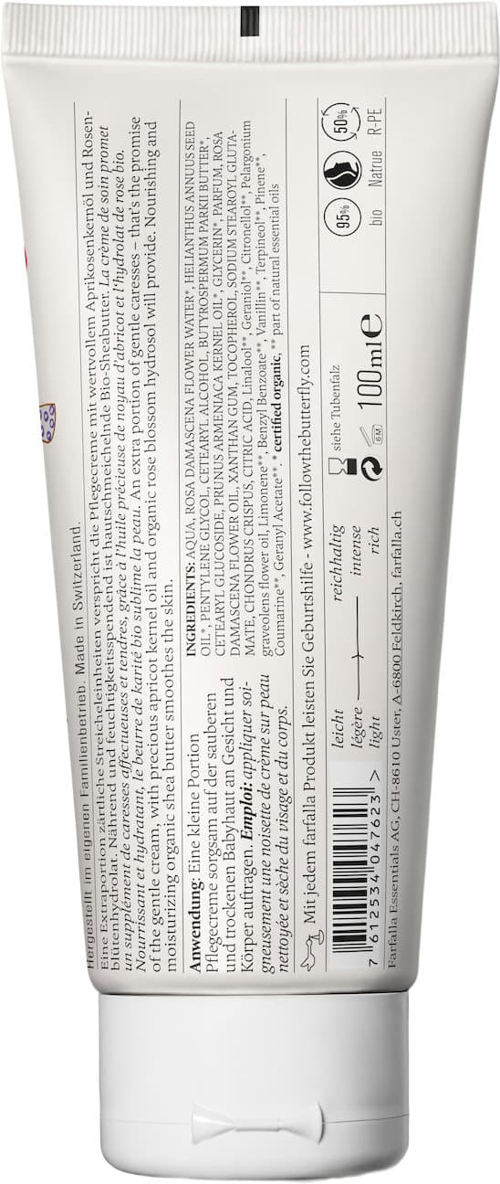 Eine Extraportion zärtliche Streicheleinheiten verspricht die Pflegecreme mit wertvollem Aprikosenkernöl und Bio-Lindenblütenhydrolat. Nährend und feuchtigkeitsspendend ist hautschmeichelnde Bio-Sheabutter.