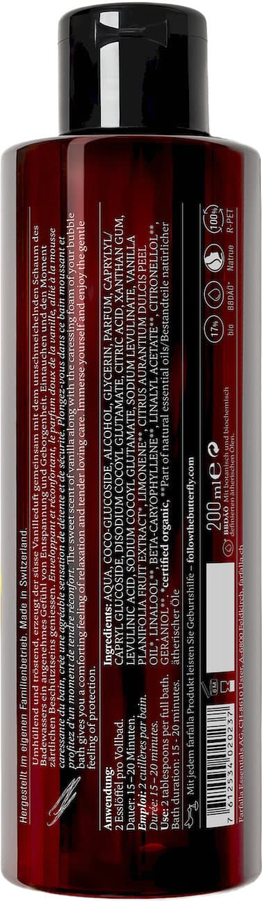 Umhüllend und tröstend, erzeugt der süsse Vanilleduft gemeinsam mit dem umschmeichelnden Schaum des Badewassers ein angenehmes Gefühl von Entspannung und Geborgenheit. Eintauchen und den Moment zärtlicher Beschütztheit geniessen.