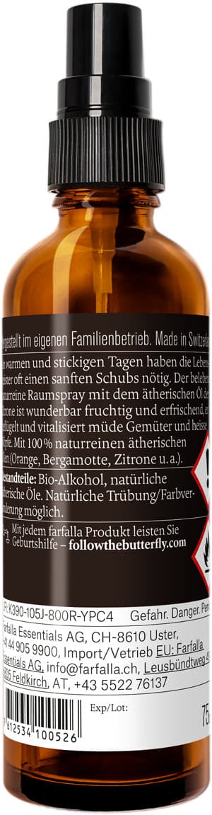 Der Bio-Raumspray Sei erfrischt Zitrone von FARFALLA sorgt für eine angenehme Atmosphäre in jedem Raum. Mit seinem fruchtigen Duft schafft er ein belebendes Ambiente, besonders an warmen Tagen.