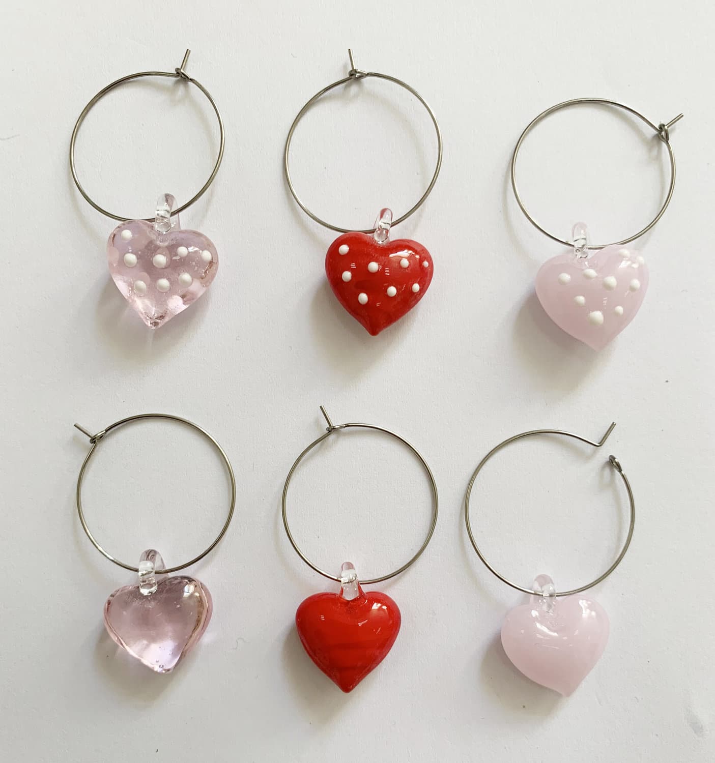 Jeder Anhänger ist mit einem herzförmigen Element aus Kunststoff gestaltet, das an einem Ring aus Metall befestigt ist. Die verschiedenen Farben und Muster der Herzen sorgen dafür, dass jedes Glas leicht zugeordnet werden kann. Die Ringe lassen sich einfach am Stiel von Wein- oder Sektgläsern anbringen und wieder entfernen.