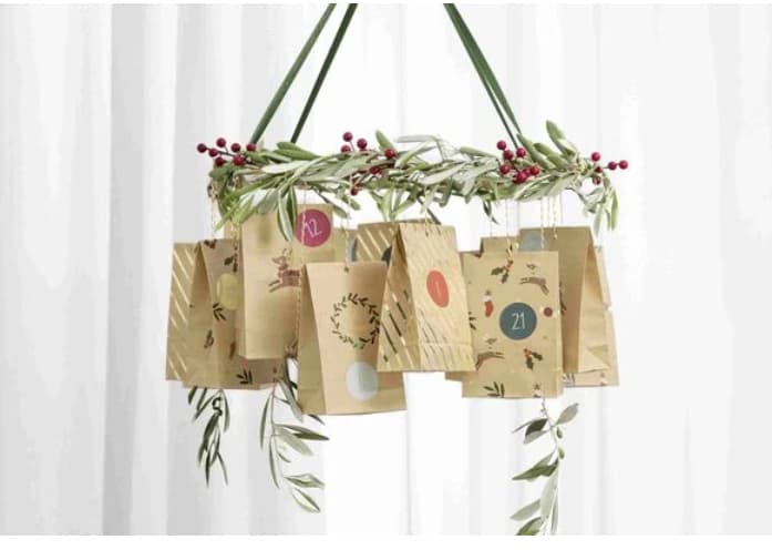 | Lieferumfang | 24 bedruckte, Blockbodenbeutel, 24 Zahlensticker, Bäckerkordel weiß/gold |