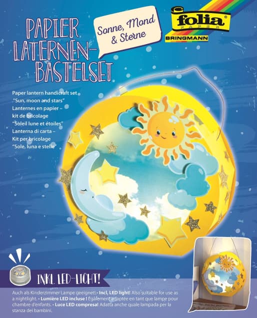 Laternen Bastelset für eine runde Motivlaterne. Mit 1 Laternenrohling aus 3D-Wellpappe, bedruckten Stanzteilen zum Verzieren für einen schnellen Bastelerfolg. Zusammen mit einer LED-Lichtquelle (nicht im Set enthalten) auch als Kinderzimmerlampe geeignet.