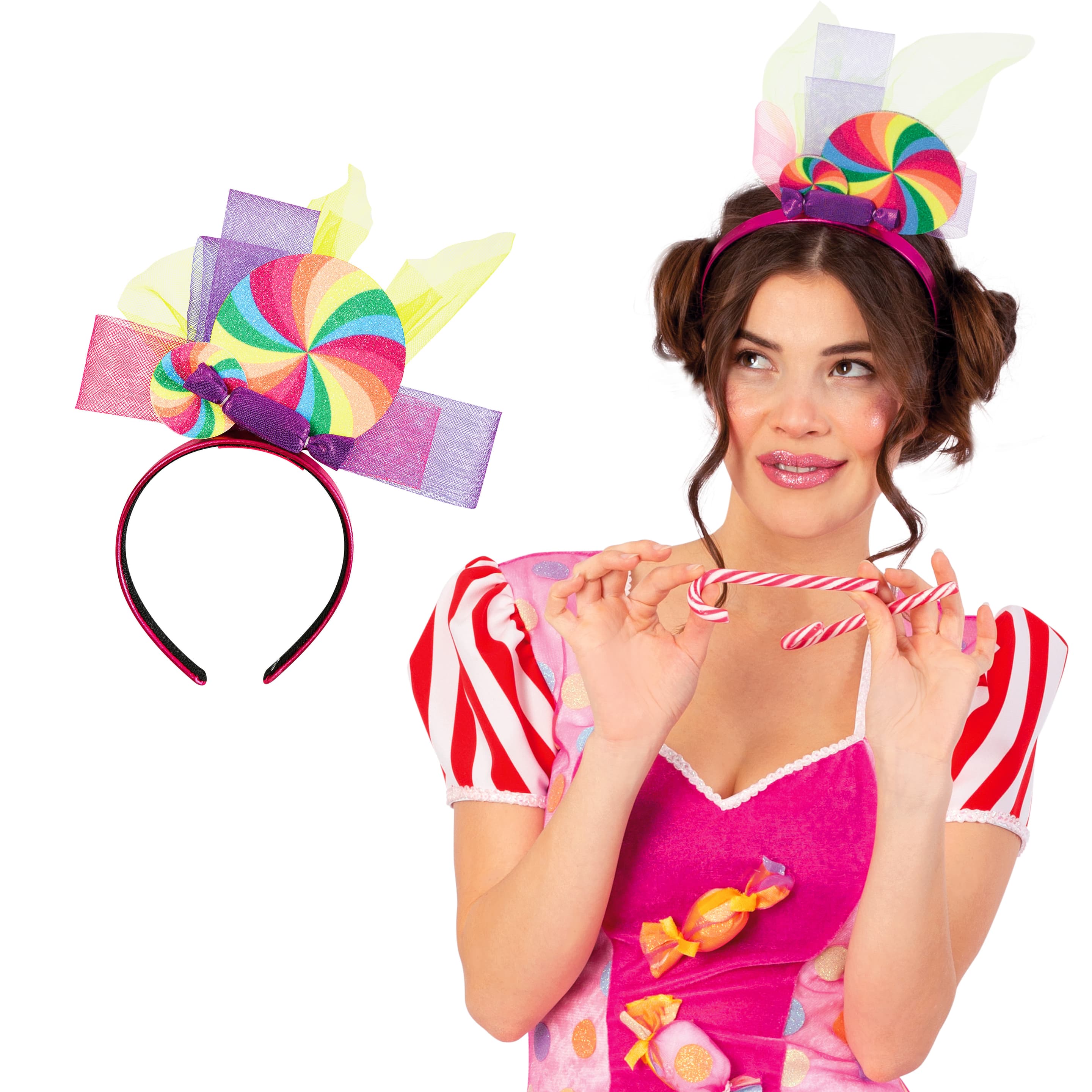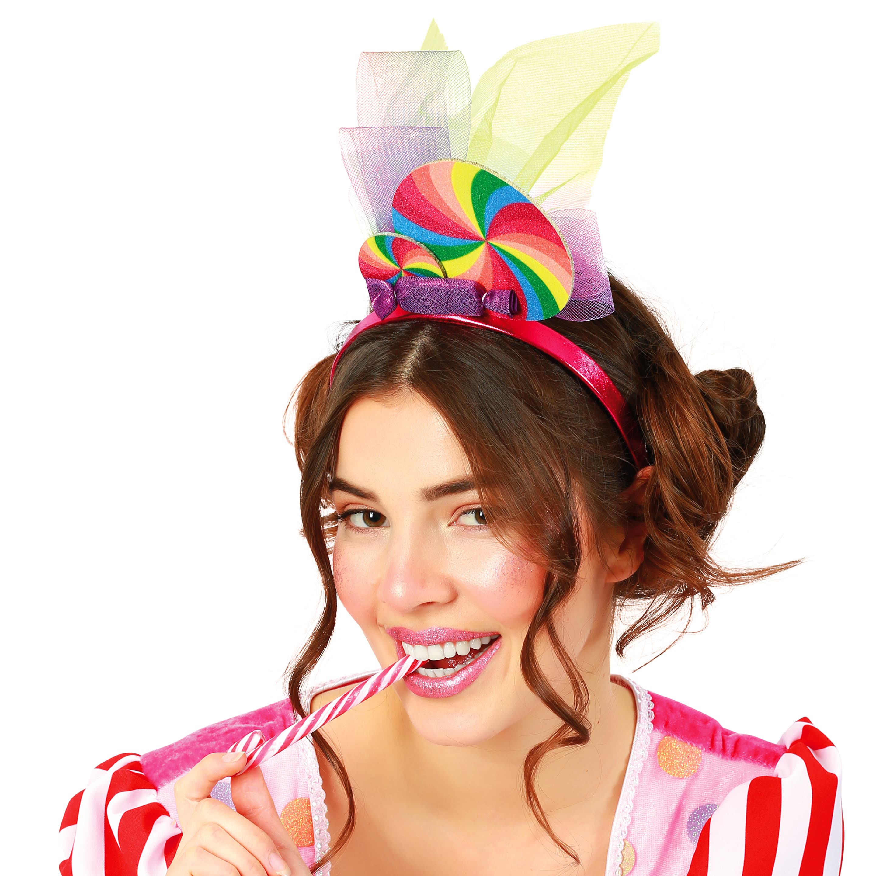 Ein Haarschmuck für echte Schleckermäuler ist dieser Haarreif. Außer den großen bunten Tüllschleifen zaubert er auch noch überzeugend echt aussehende Süßigkeiten ins Haar. Bonbons und Dauerlutscher in fröhlichen Farben möchte man am liebsten gleich probieren!