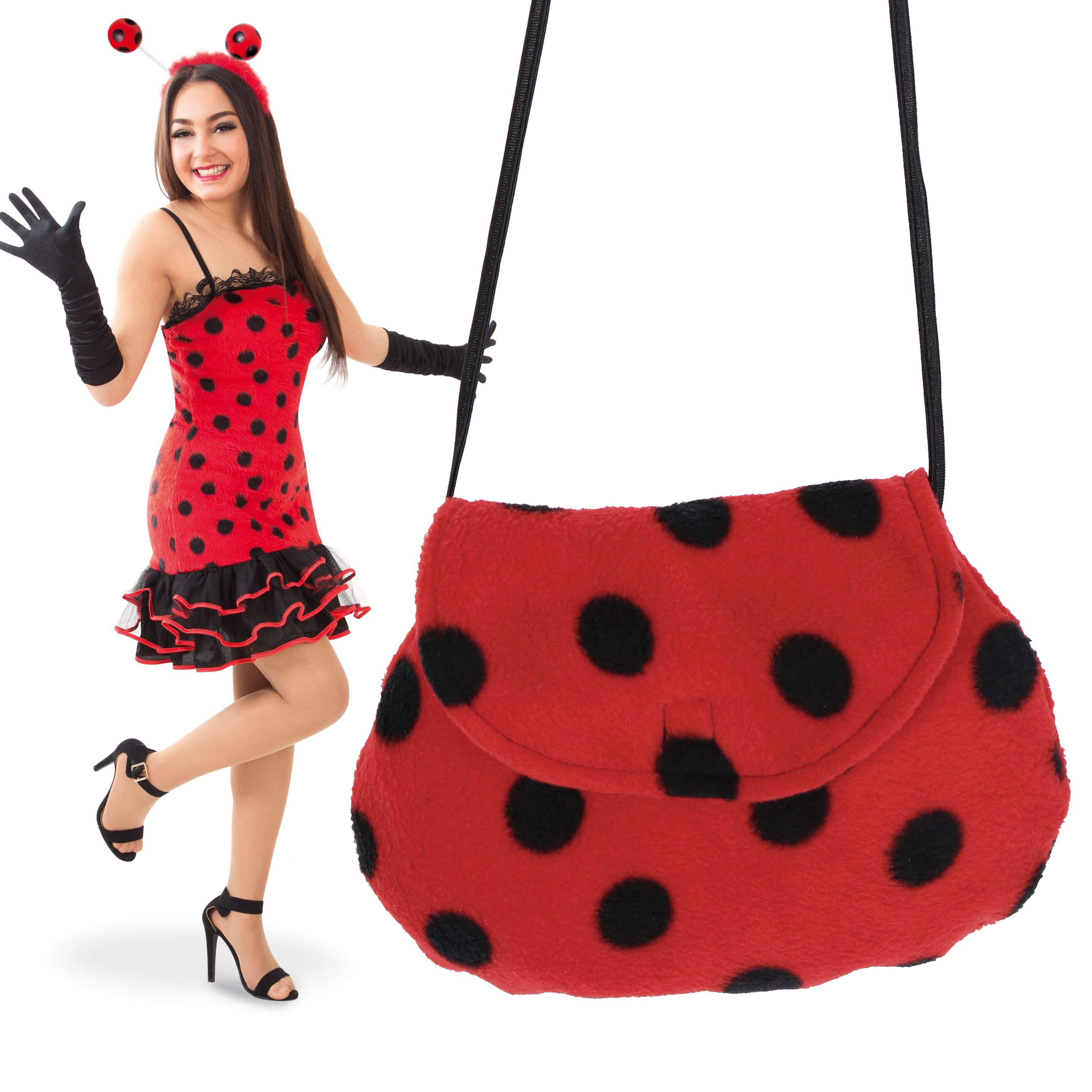 Marienkäfer aufgepasst, hier kommt die passende Tasche fürs Outfit! Plüschweich und ca. 25 x 20 cm groß, da passt alles rein, was zur Party oder zum Rosenmontagszug mit muss. Damit ist es das perfekte Accessoire für alle, die als schwarz-rote Krabbeltiere durch die Karnevalszeit brummen.