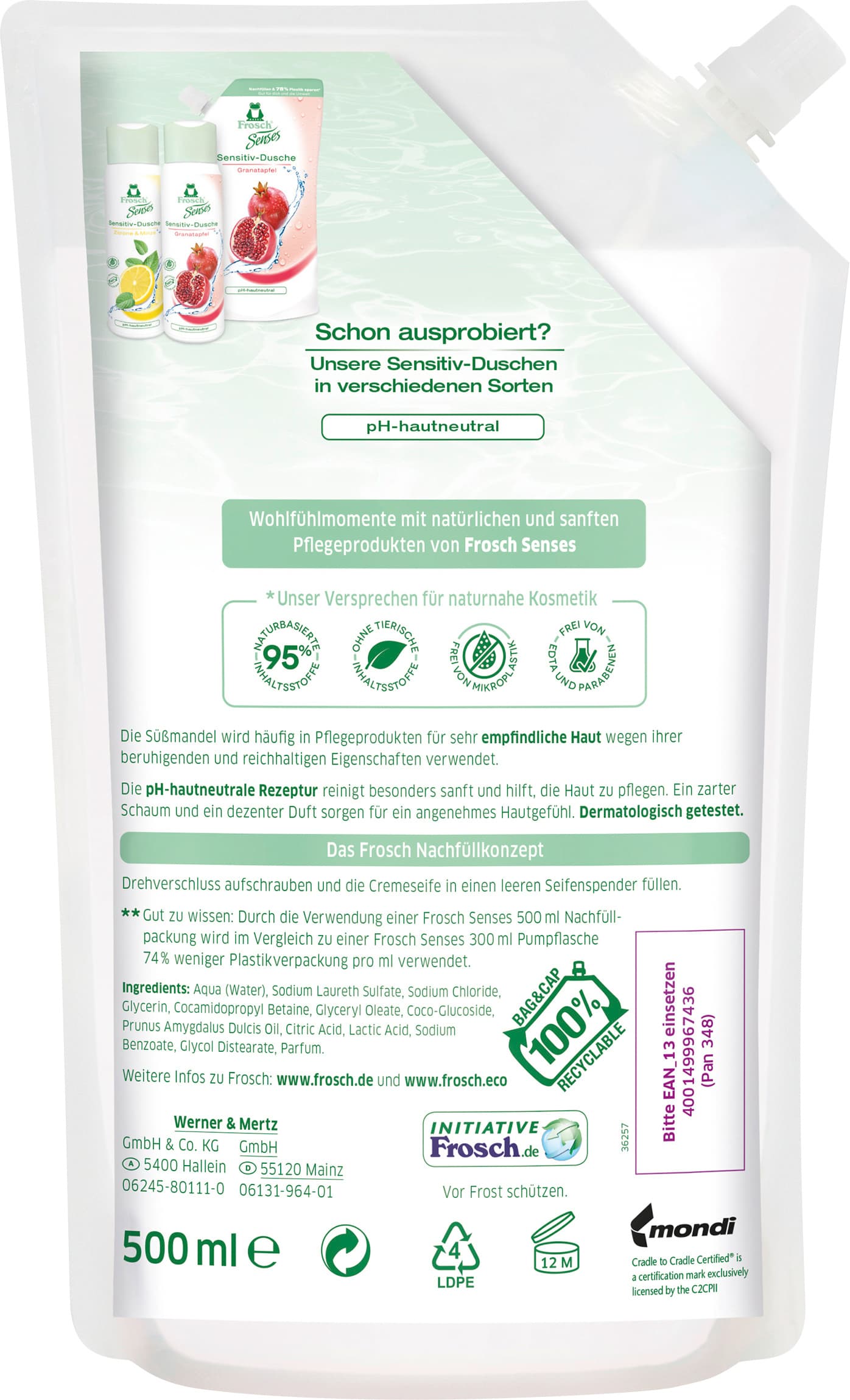 Die Frosch Senses Mandelmilch Cremeseife pflegt die Hände dank ausgewählter Inhaltsstoffe naturnaher Kosmetik und hilft, sie bei jedem Händewaschen vor dem Austrocknen zu schützen. Die hypoallergene&pH-hautneutrale Rezeptur mit Mandelmilch-Extrakt ist frei von Mikroplastik, Parabenen, EDTA&tierischen Inhaltsstoffen. Der verpackungssparende Nachfüllbeutel ist zu 100% recycelbar.