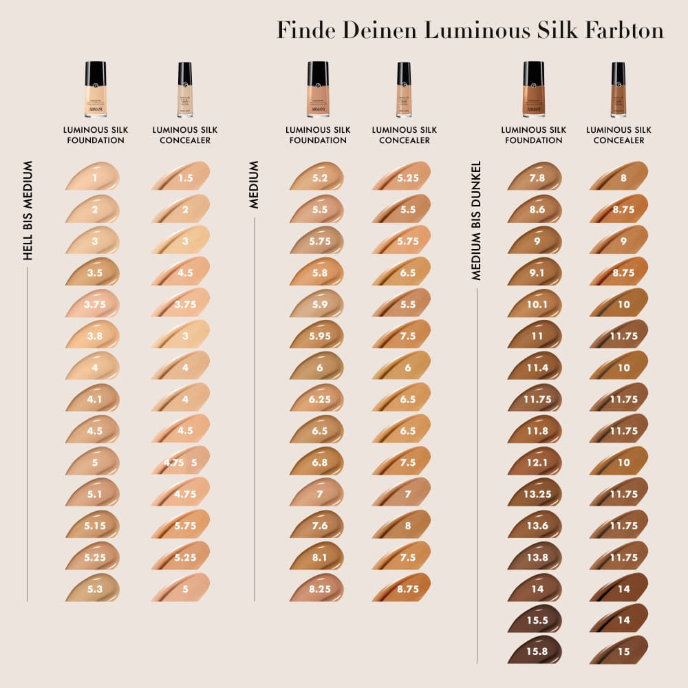 AnwendungshinweisLuminous Silk Illuminating Primer auftragen, um die Haut vorzubereiten. Dann die Luminous Silk Foundation für ein optimales Ergebnis mit Pinsel oder Schwämmchen auftragen. In Schichten auftragen, um die gewünschte Deckkraft zu erreichen – eine für ein natürliches Aussehen, mehrere für mittlere Deckkraft. Für einen intensiveren Glow mit Fluid Sheer oder Luminous Silk Primer mischen.