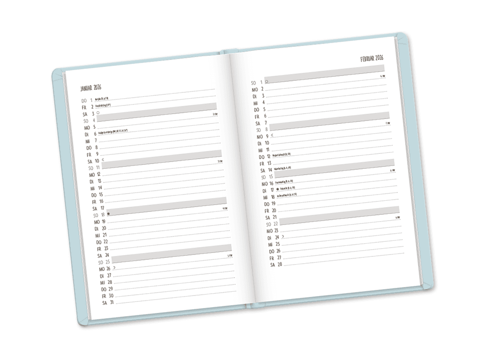 Diese Variante ist ein eleganter Begleiter durch das Jahr. Das edle Softcover im Lederlook ist fühlbar hochwertig verarbeitet und besonders unempfindlich. Filigran geprägte Ornamente zieren das Cover des attraktiven Terminplaners. Jede Kalenderwoche ist übersichtlich auf einer Doppelseite dargestellt. Außerdem bietet der Timer Platz für Notizen und all das, was Dir wichtig erscheint.