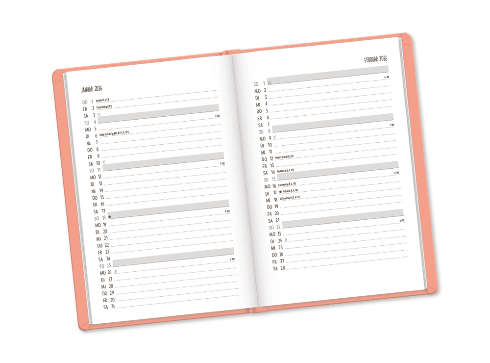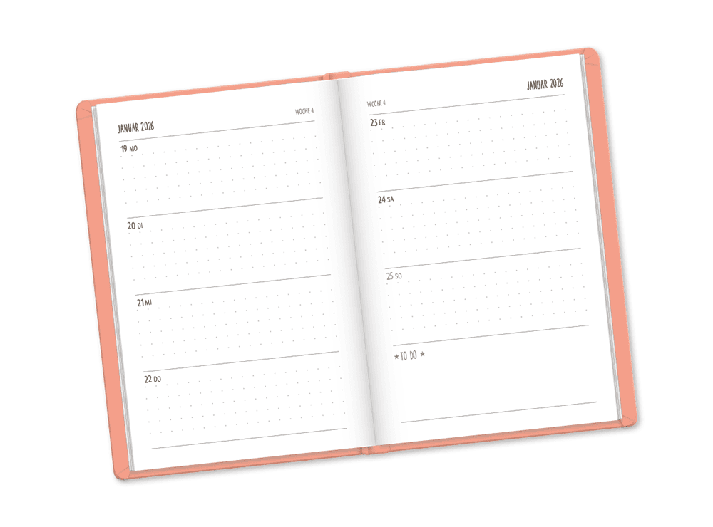 Diese Variante ist ein eleganter Begleiter durch das Jahr. Das edle Softcover im Lederlook ist fühlbar hochwertig verarbeitet und besonders unempfindlich. Filigran geprägte Ornamente zieren das Cover des attraktiven Terminplaners. Jede Kalenderwoche ist übersichtlich auf einer Doppelseite dargestellt. Außerdem bietet der Timer Platz für Notizen und all das, was Dir wichtig erscheint.