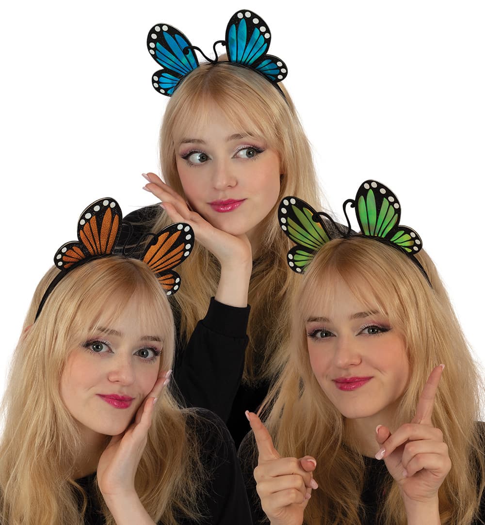 Diese Schmetterlings-Haarreifen setzen Ihre Frisur in Szene! Die angedeuteten Flügel und Fühler schmücken jeden Kopf in einer von drei schönen Farben. Der Haarreif ist verwendbar als Kostümaccessoire, zum Beispiel für ein Elfen- oder Schmetterlingskostüm. Doch auch als glitzernder Hingucker beim Party-Outfit sieht er einfach toll aus!